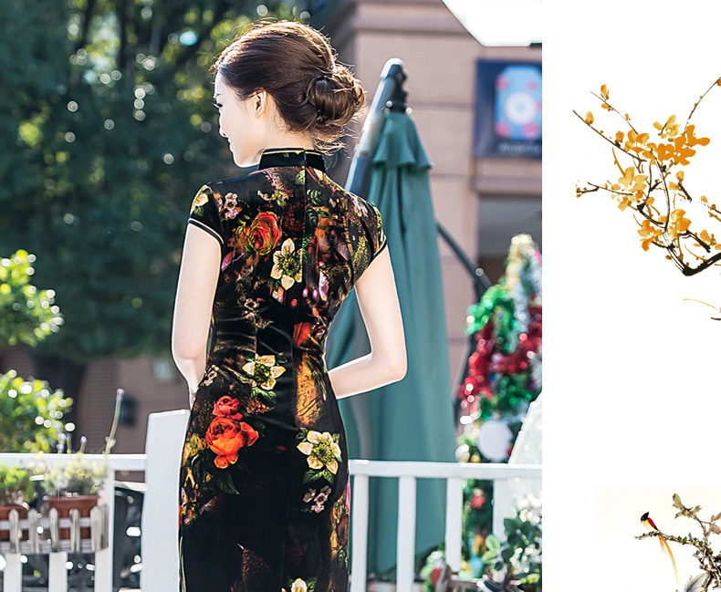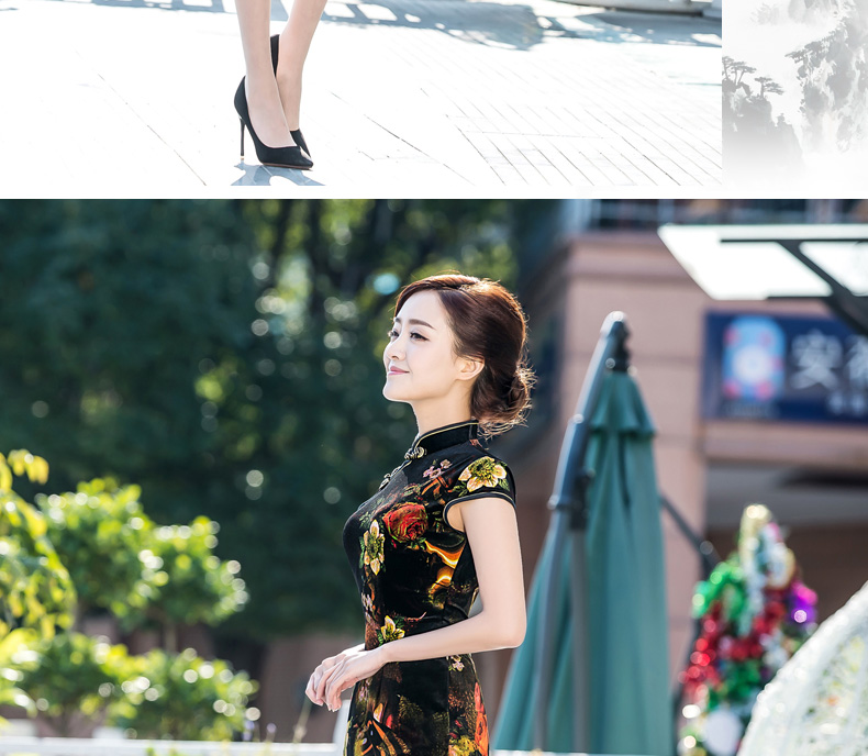 黑色XXXL伊甸之初 2016夏旗袍金絲絨短袖黑色印花 彈力顯瘦 中式復古氣質