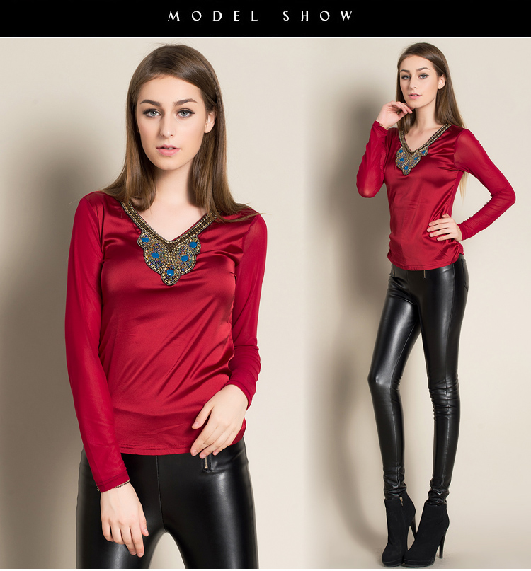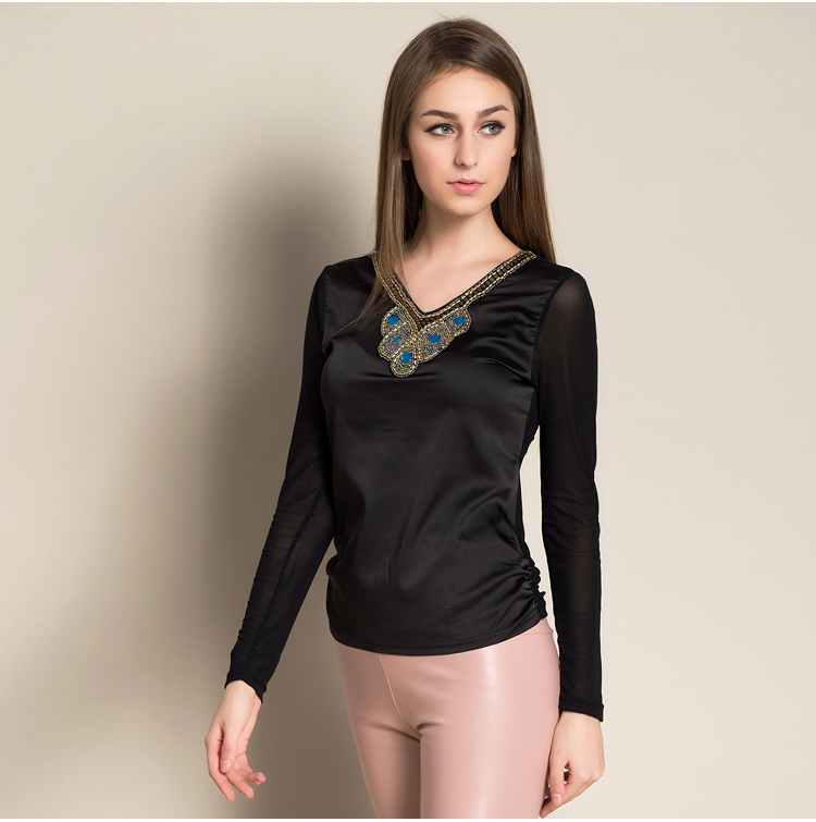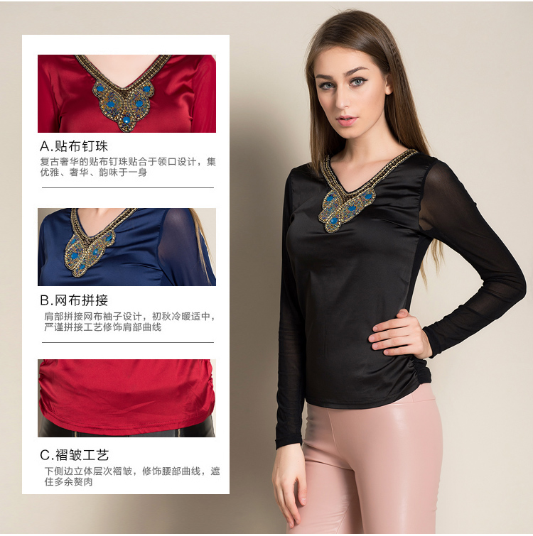 黑色M歐洲站秋裝新款釘珠打底衫 高端真絲緞上衣長袖純色T恤V領