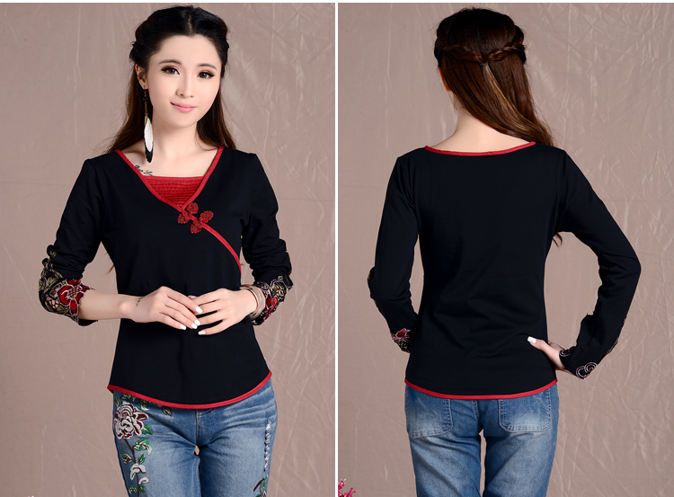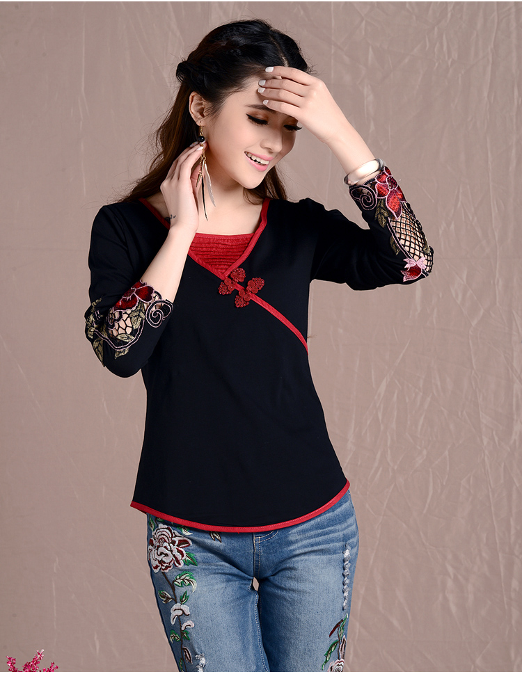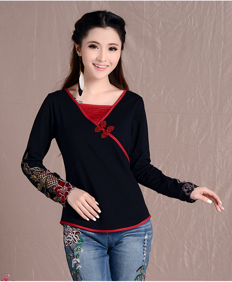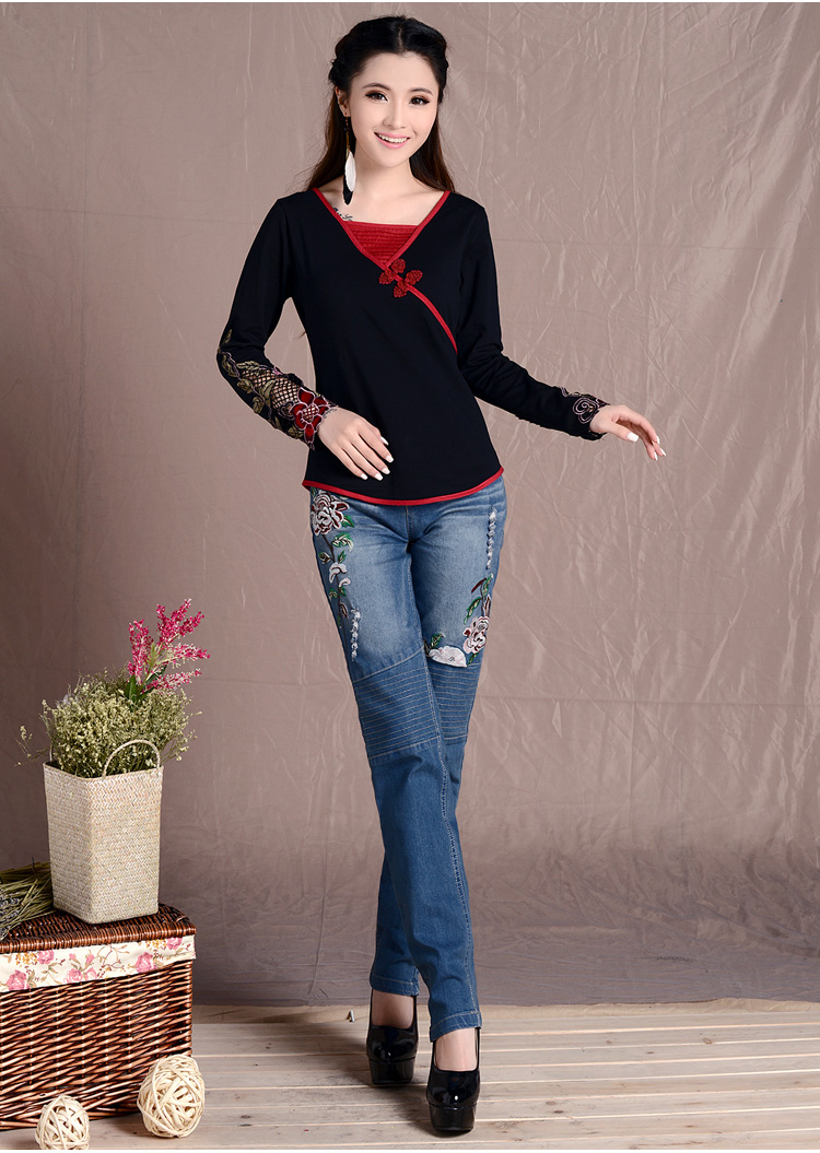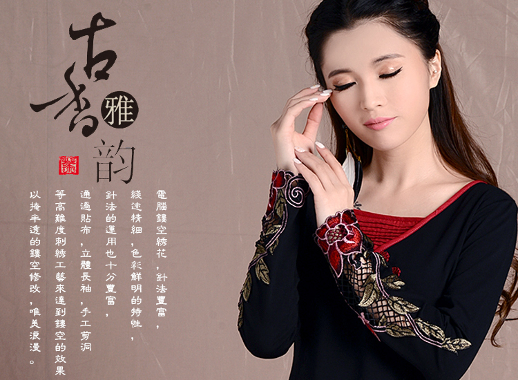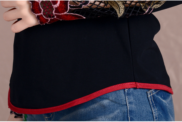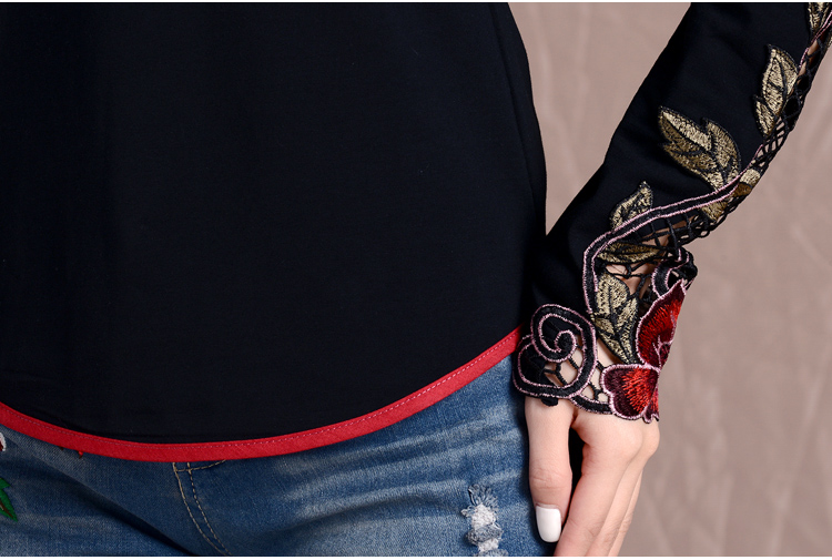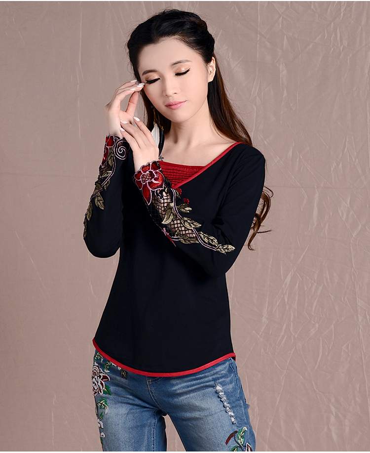 黑色M2016春秋新款女裝民族風圓領繡花大碼長袖打底衫T恤女