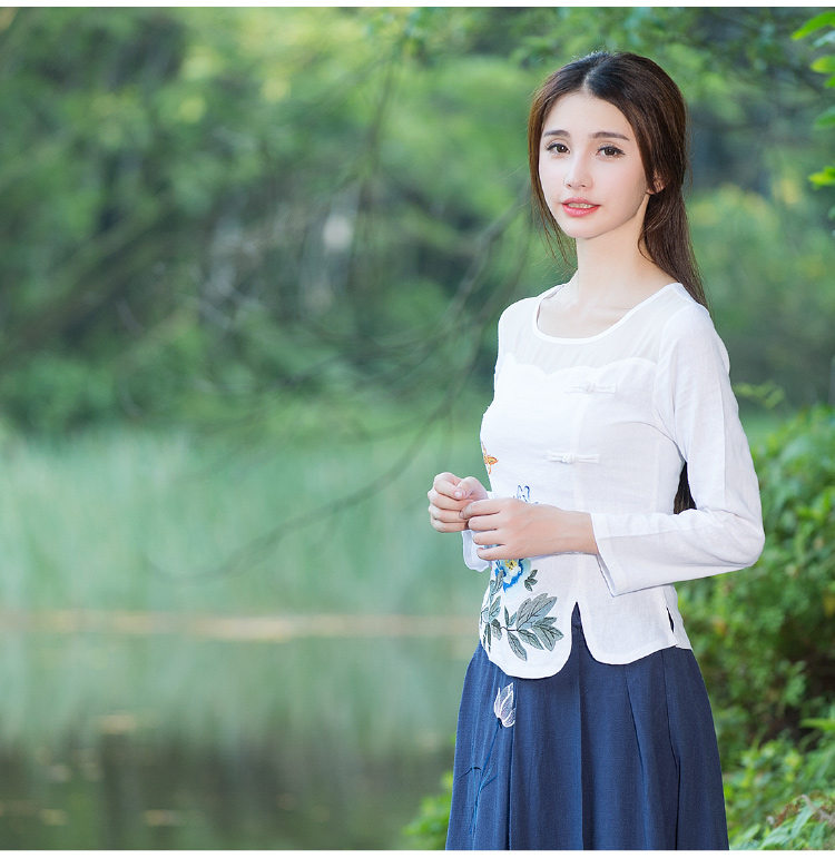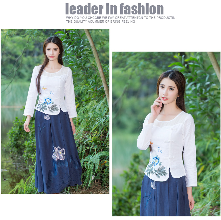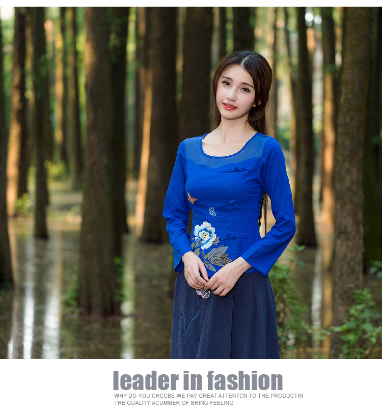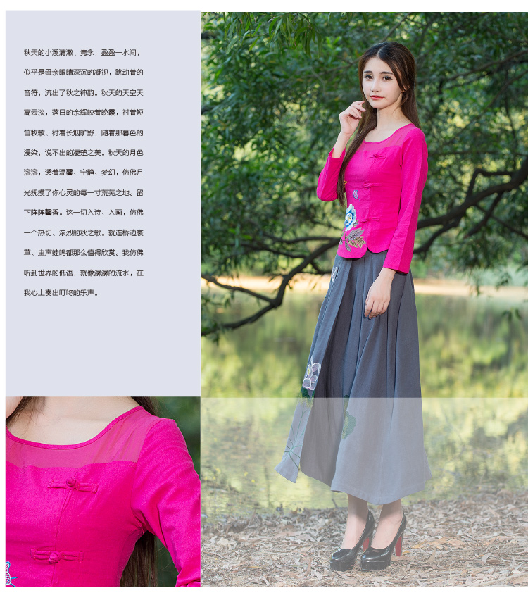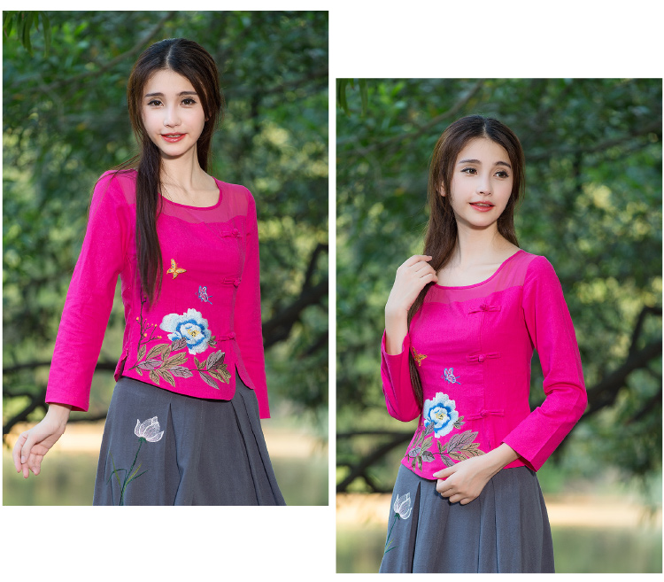 玫紅色M2016夏季新款女裝上衣民族風繡花長袖圓領手工盤扣不規則下擺襯衫