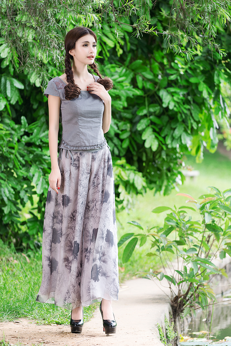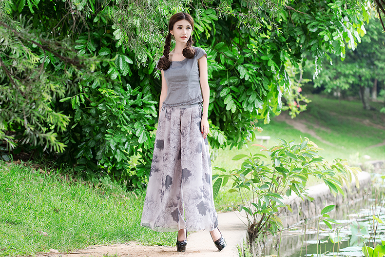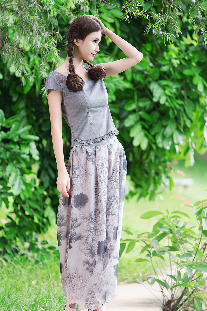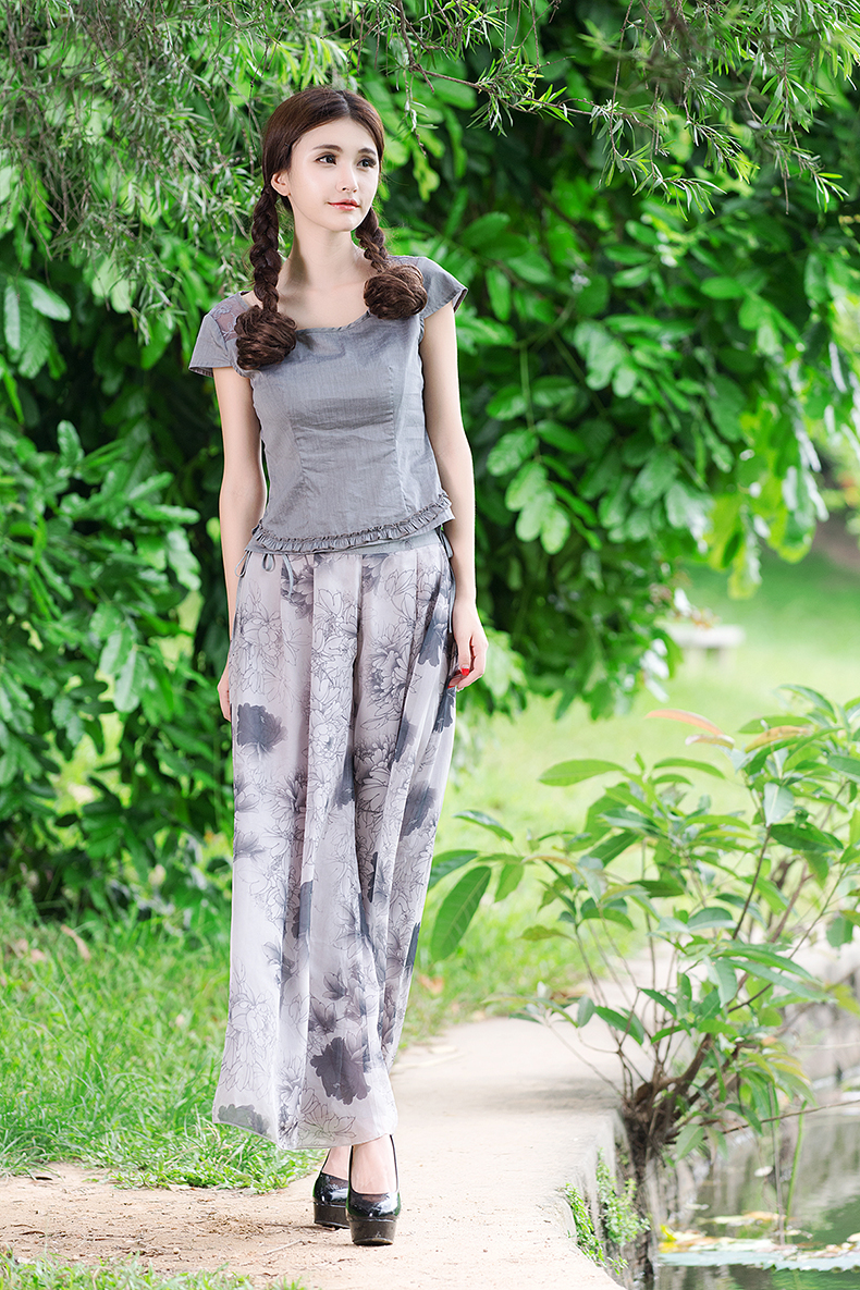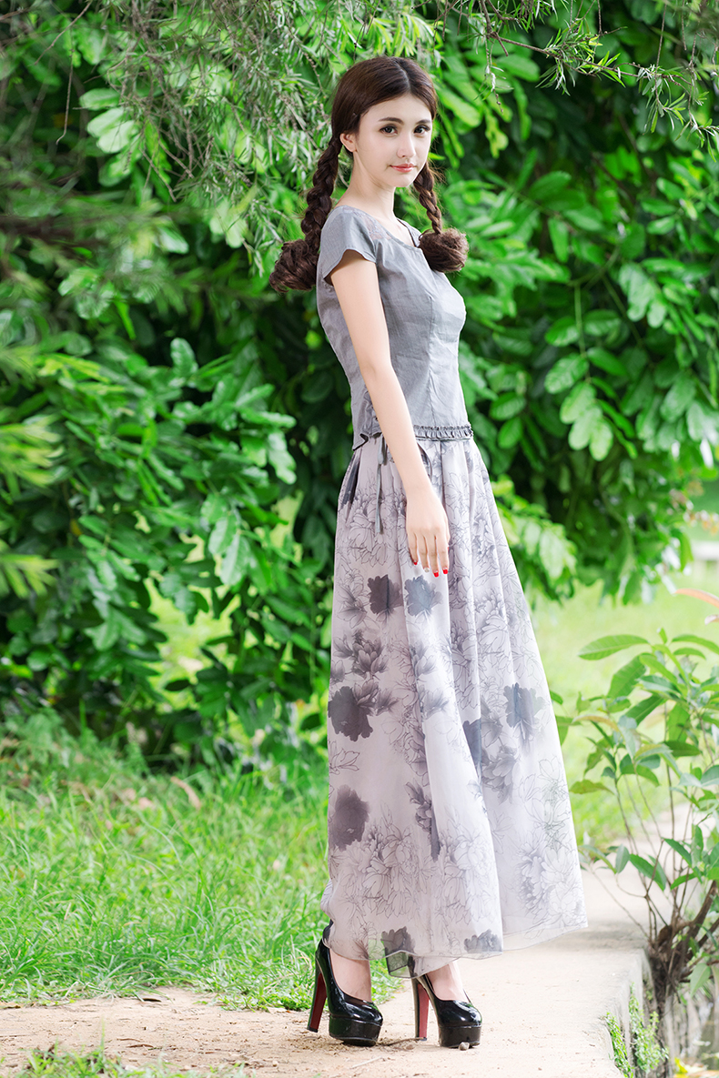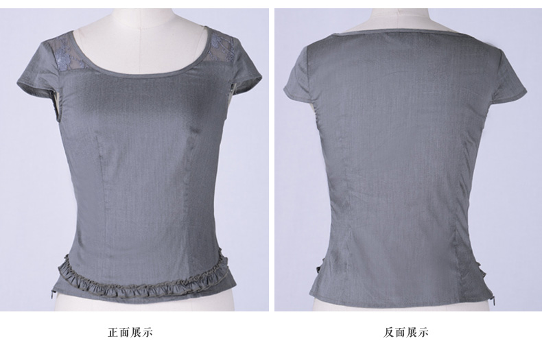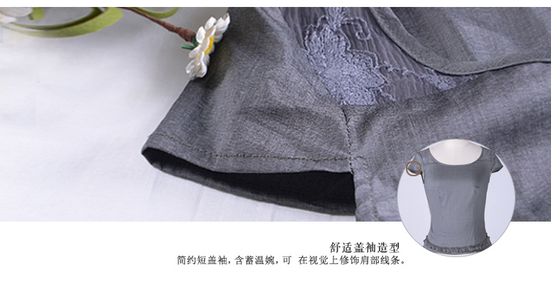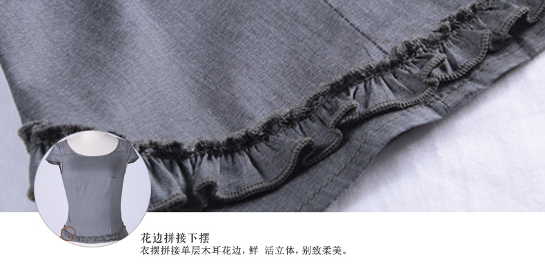 灰色M夏新款女裝民族風文藝風刺繡花圓領短袖木耳邊下擺修身短袖T恤衫