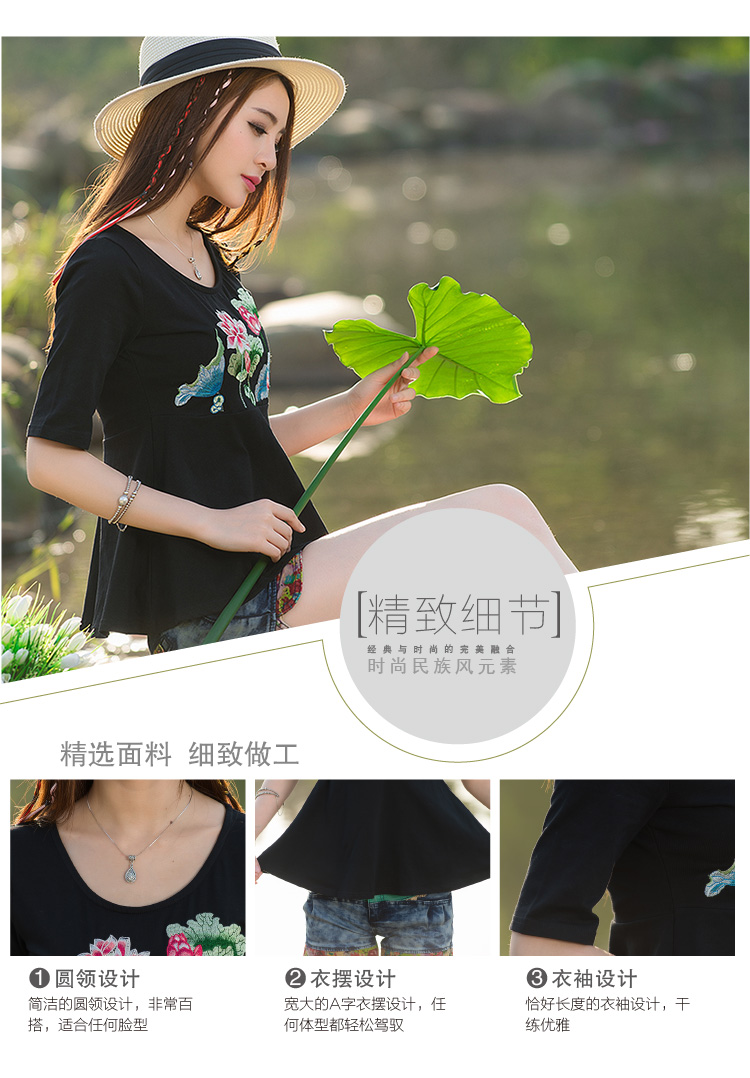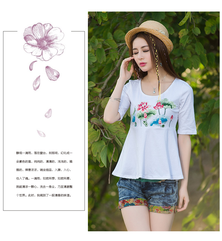 白色M夏款女裝民族文藝風刺繡花圓領五分袖裙形寬松下擺彈力短袖T恤女