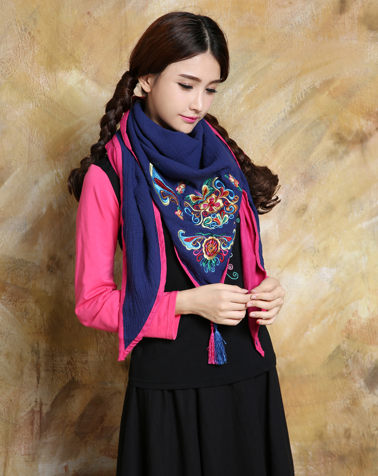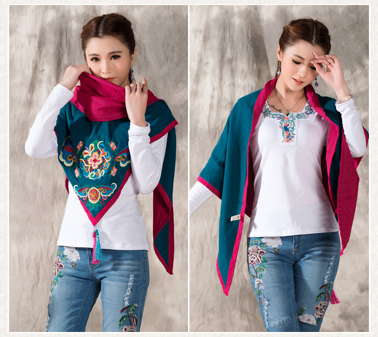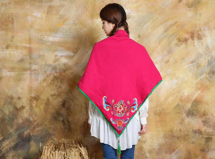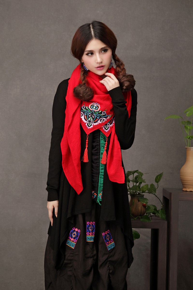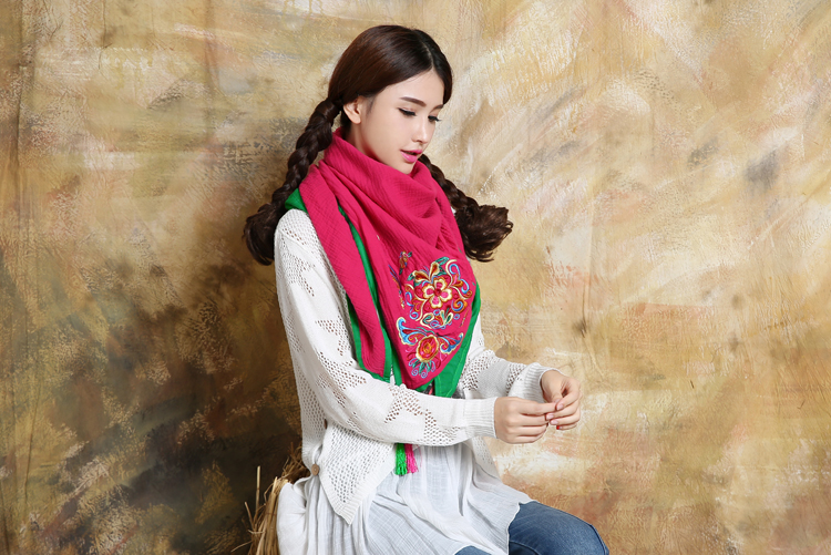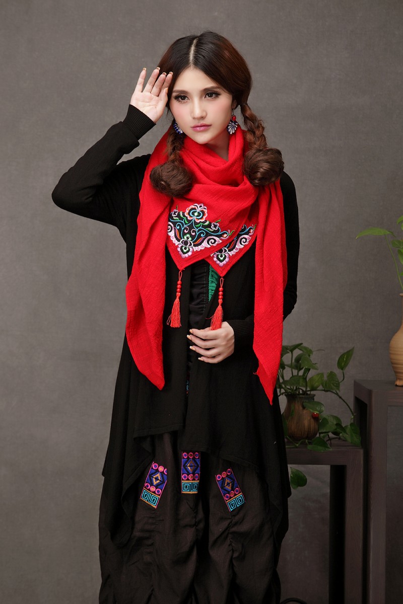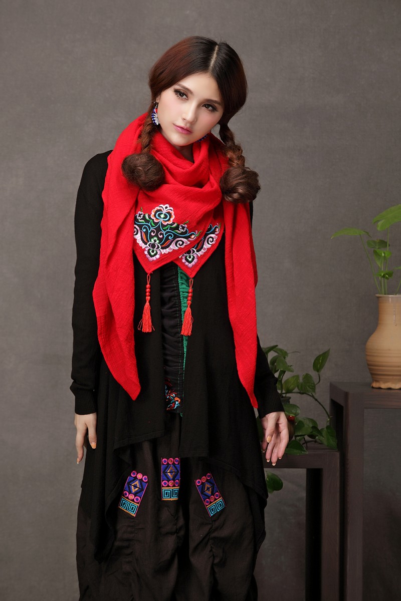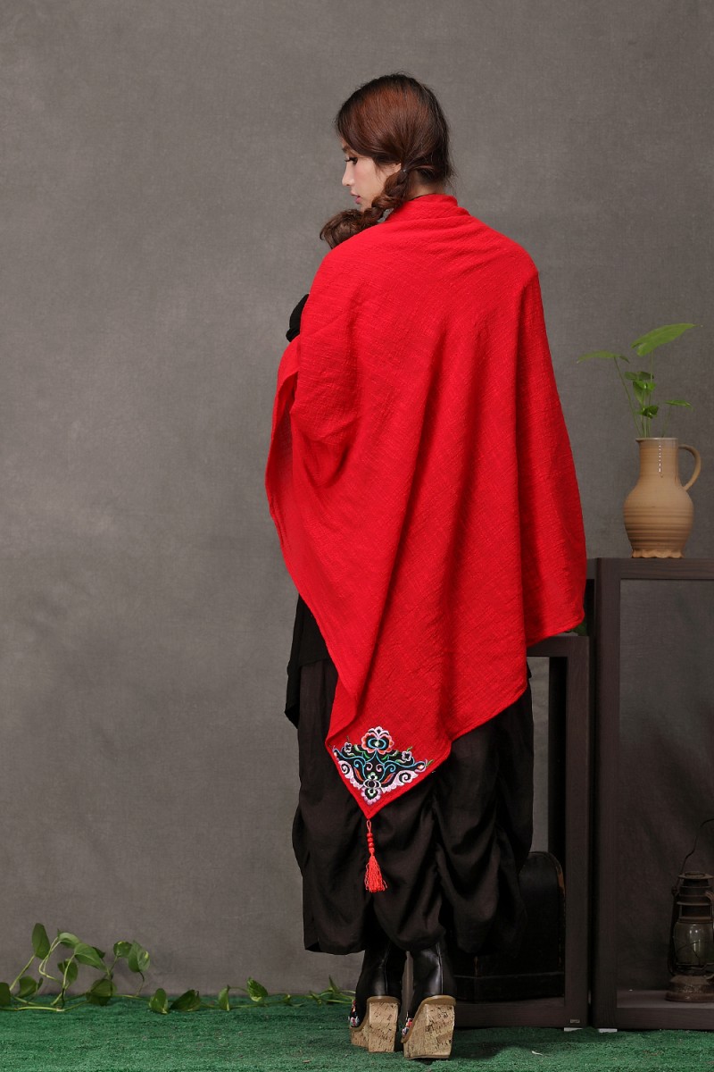 1888紅色新款秋款女裝配飾民族風亞麻面料三角圍巾貼布對角繡花大方巾流蘇