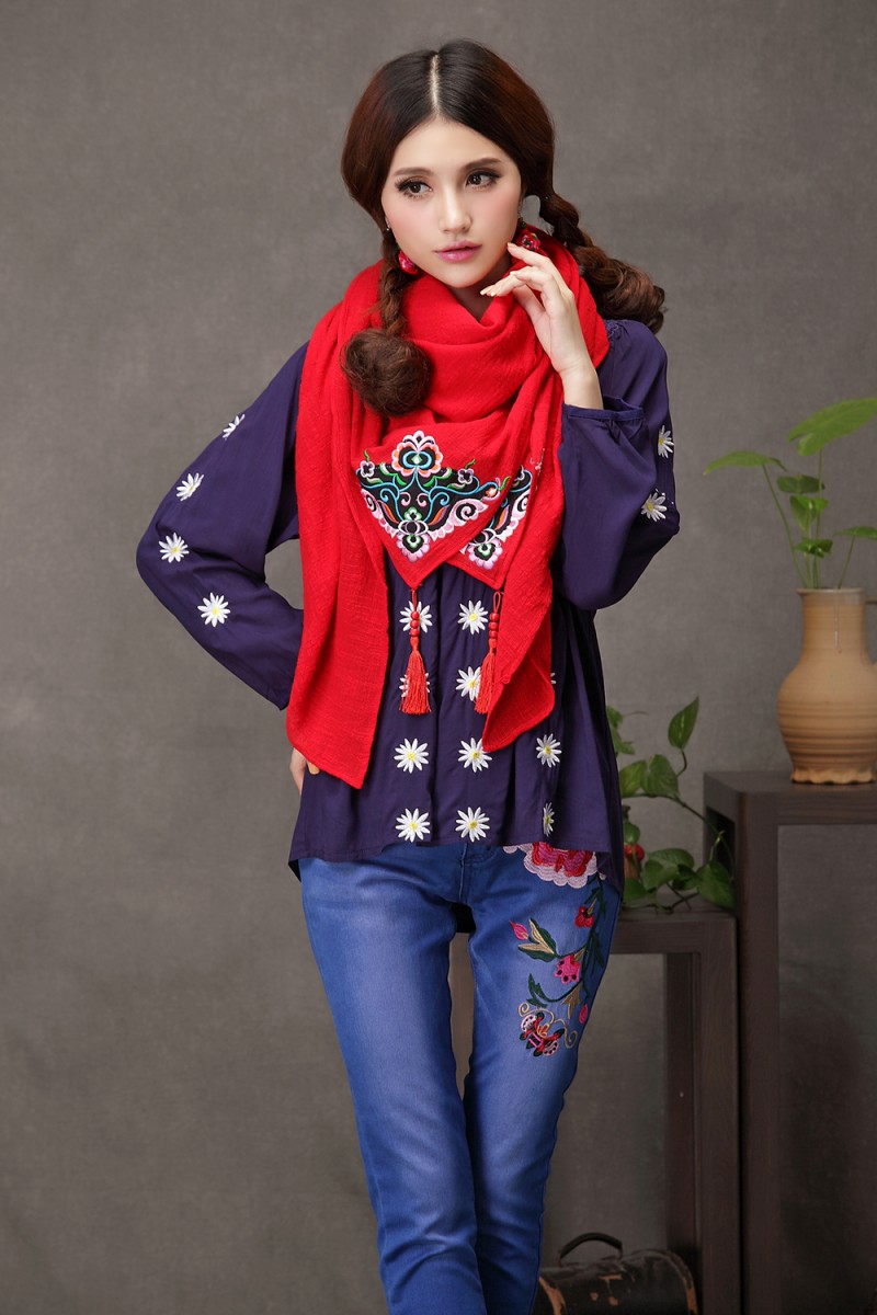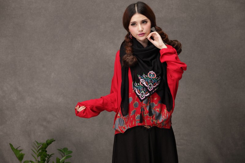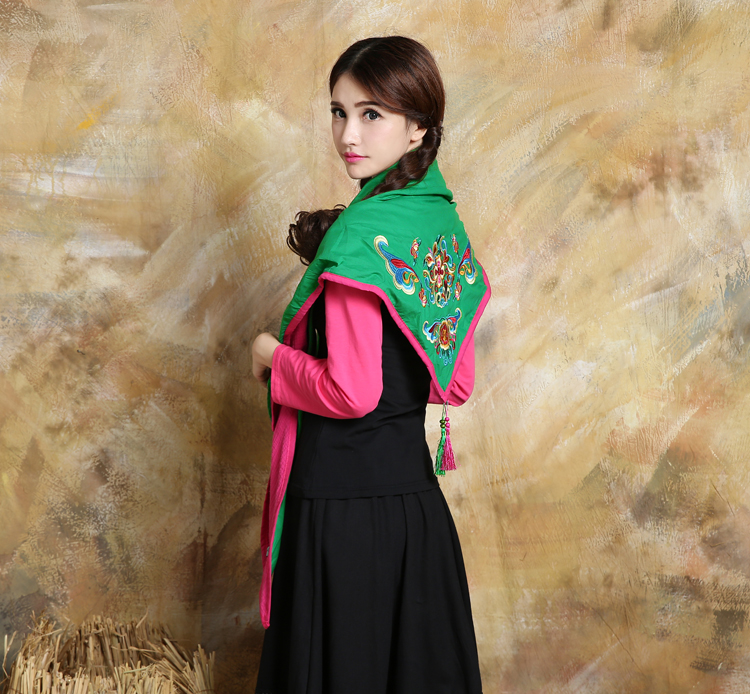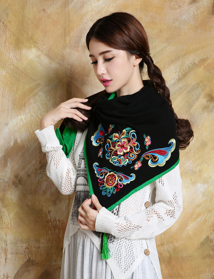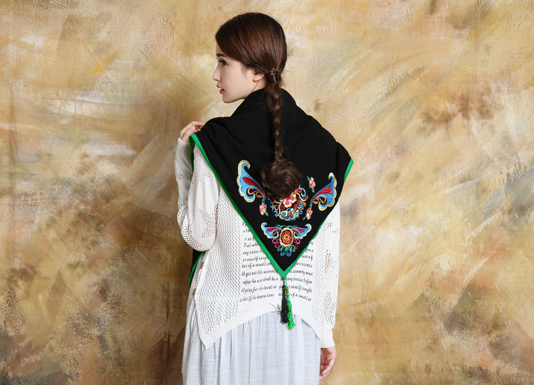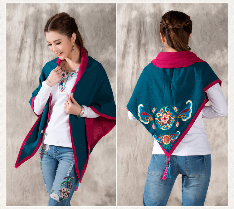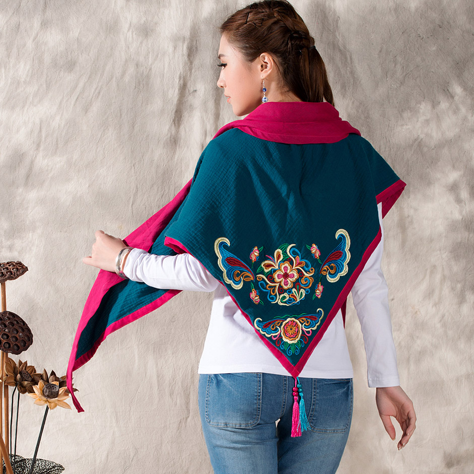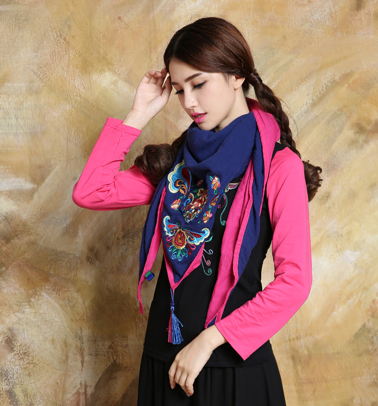 1888紅色新款秋款女裝配飾民族風亞麻面料三角圍巾貼布對角繡花大方巾流蘇