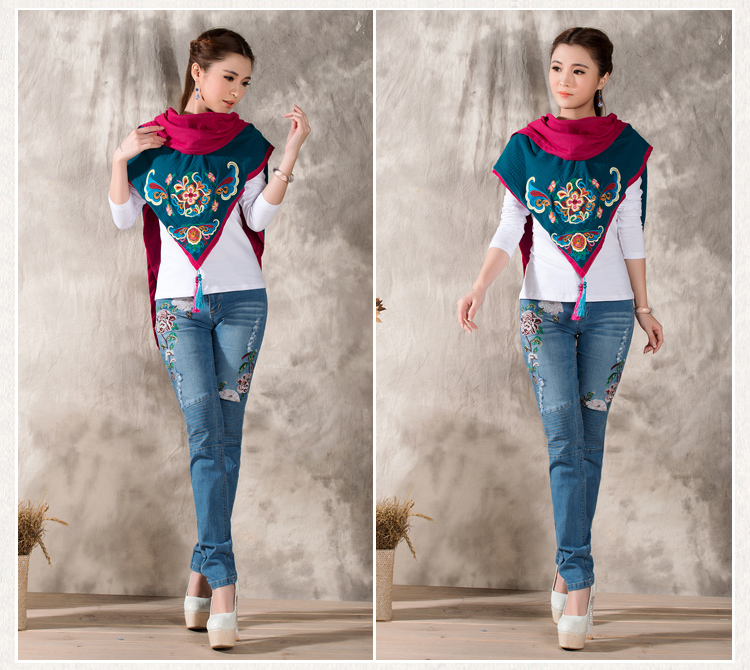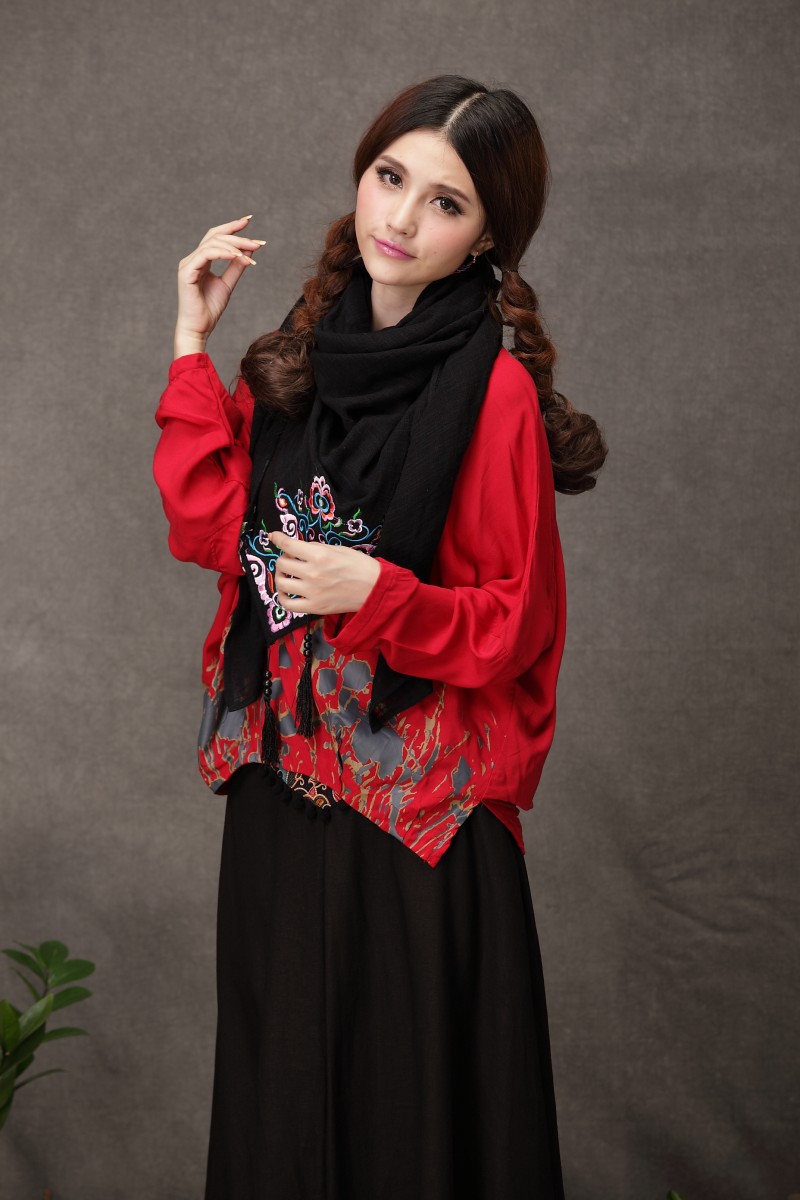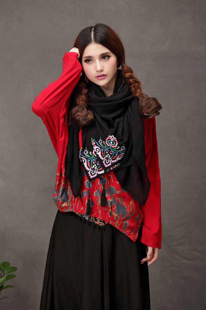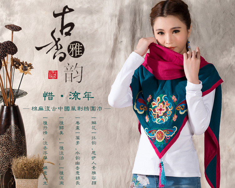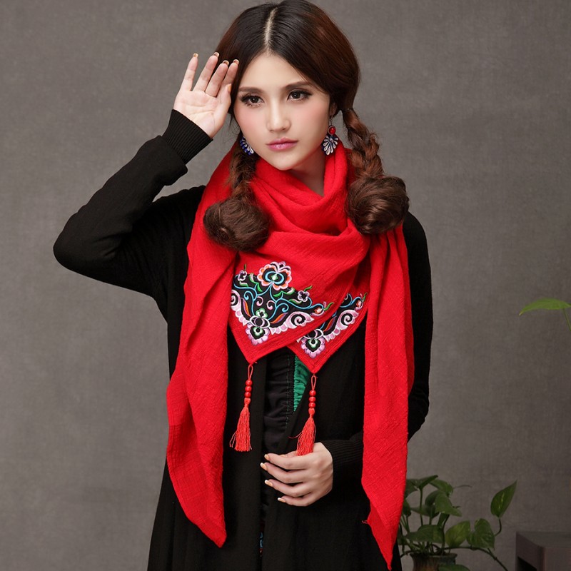 1888紅色春秋冬新款棉麻復古中國風民族風女裝飾品刺繡花圍巾披肩女