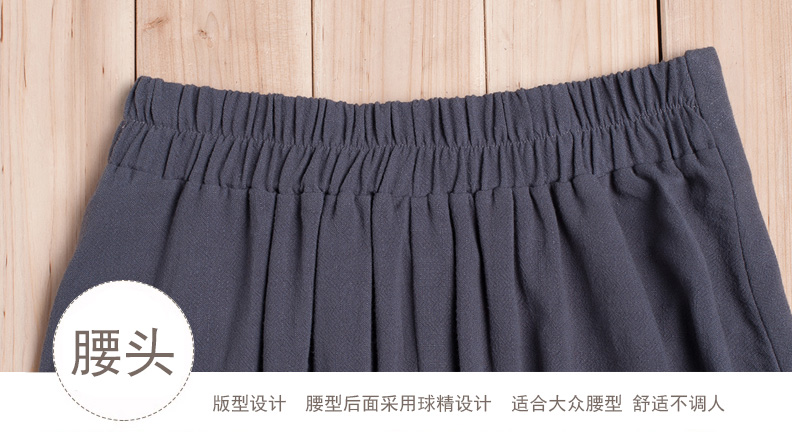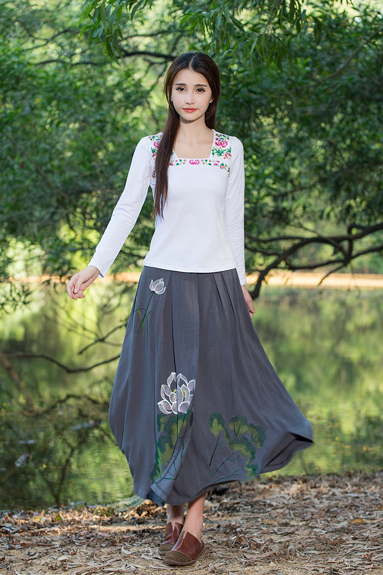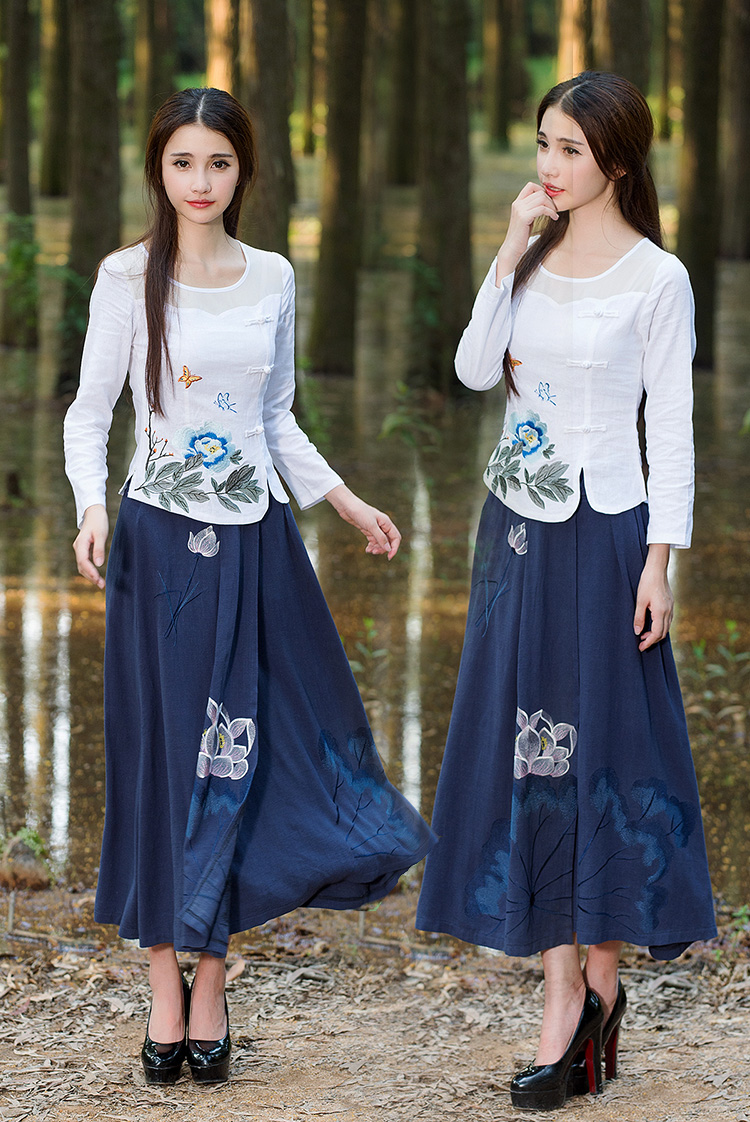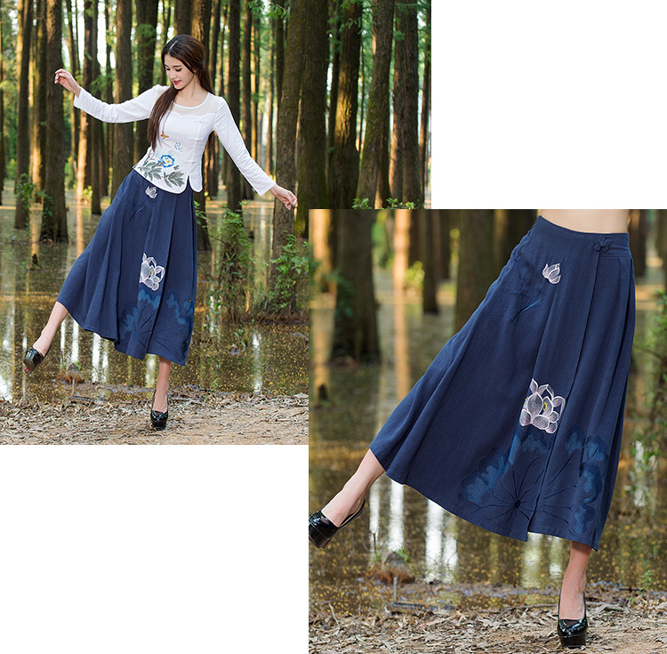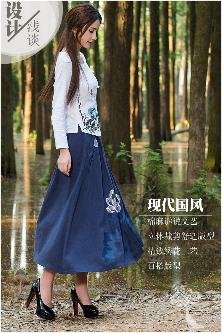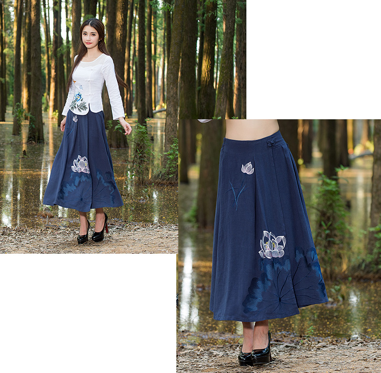 藏青色XL春秋季森女刺繡花棉麻半身裙文藝復古小清新百褶裙純色大擺長裙女