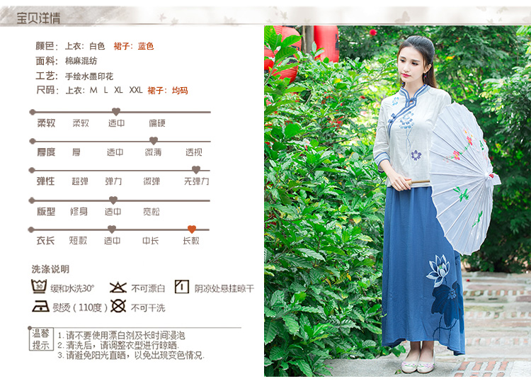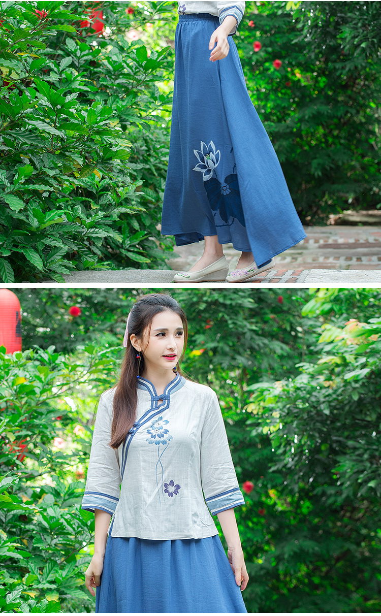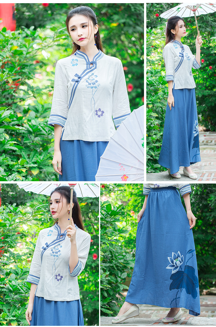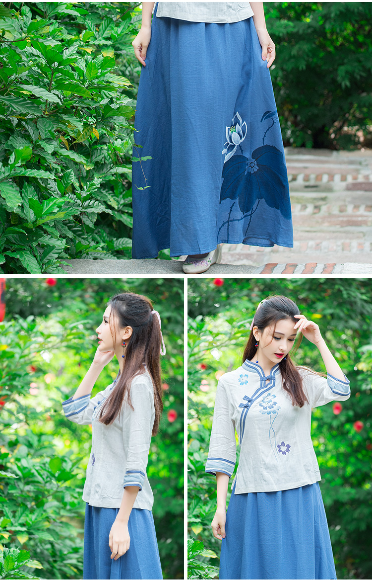 裙子均碼春裝新款女裝中式復古百搭修身棉麻襯衫上衣兩件套A字半身裙印花