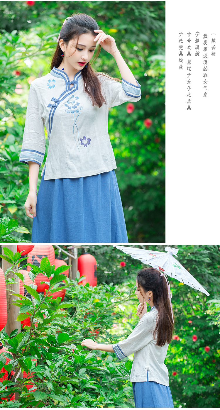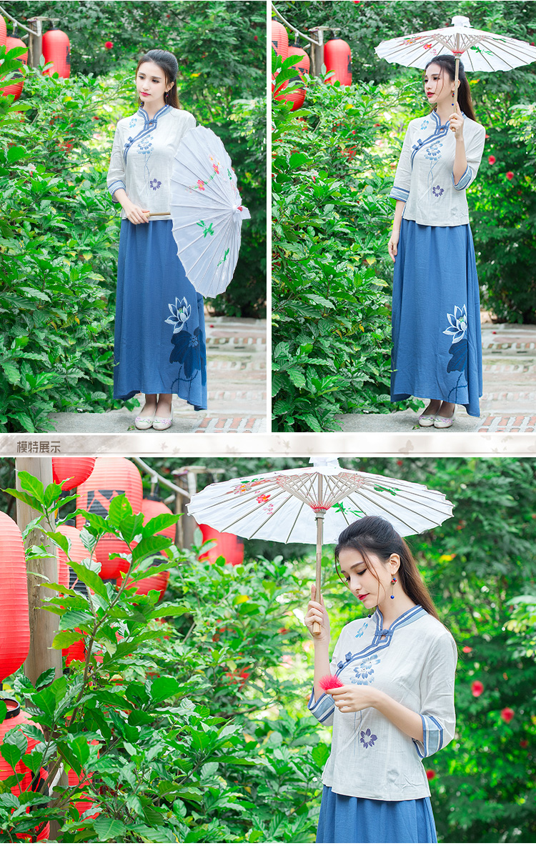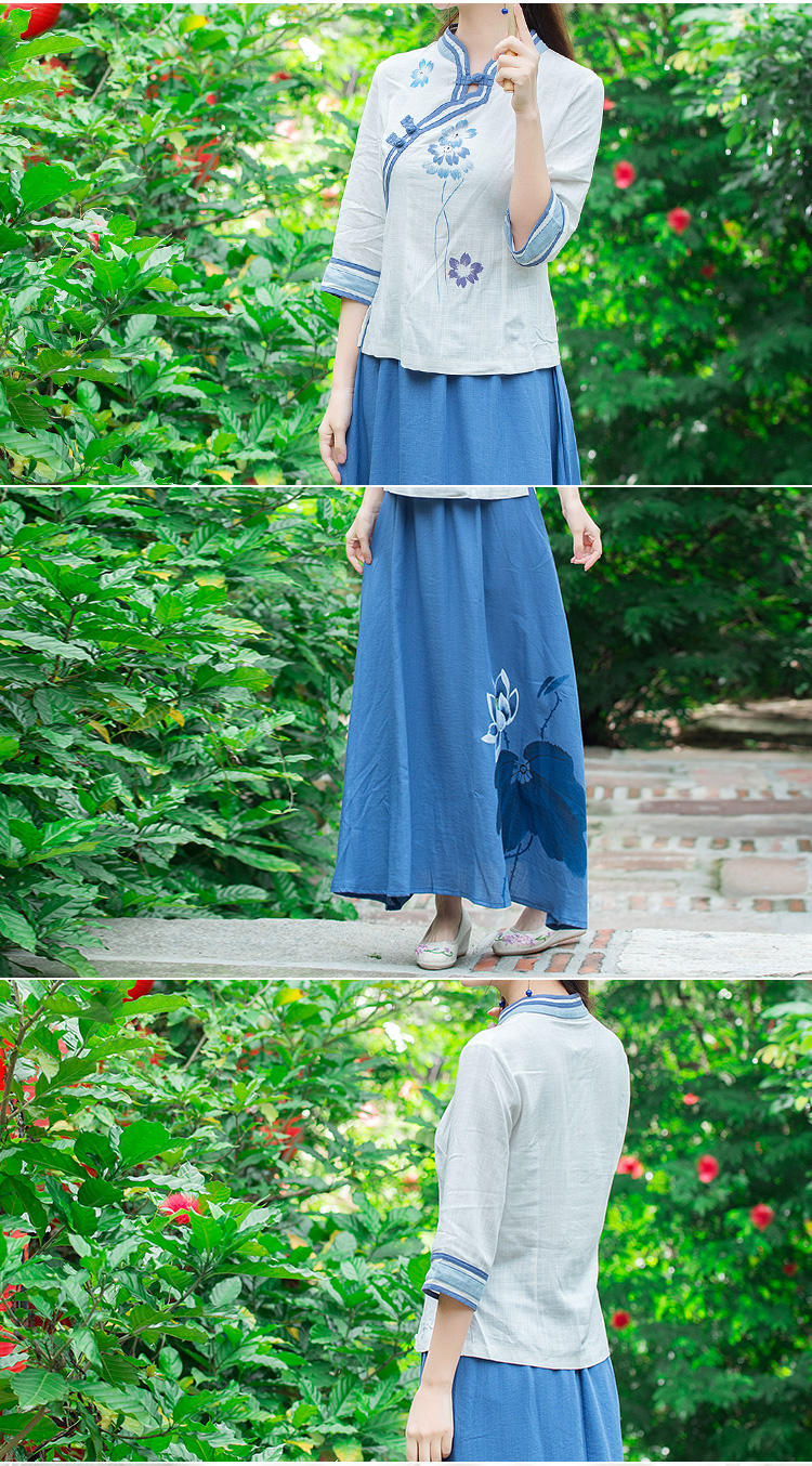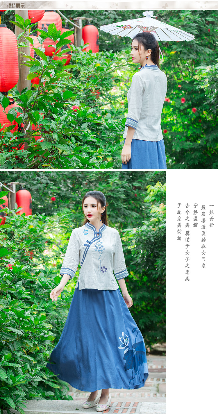 裙子均碼春裝新款女裝中式復古百搭修身棉麻襯衫上衣兩件套A字半身裙印花