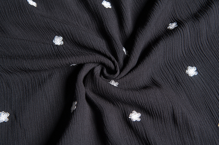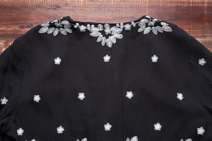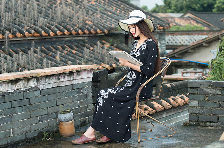 黑色S原創復古民族風女裝深V領新品七分袖雙縐純色簡約刺繡花連衣裙