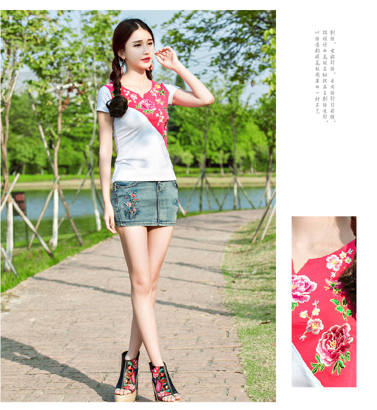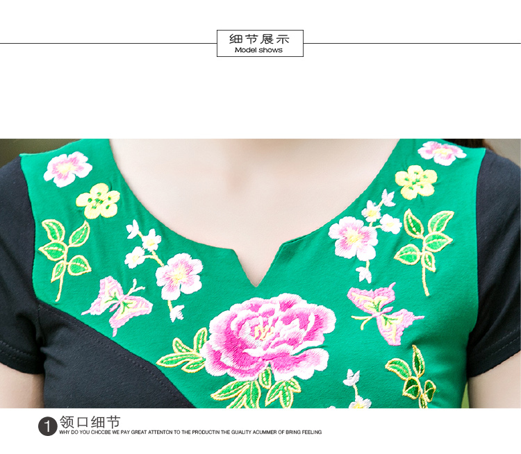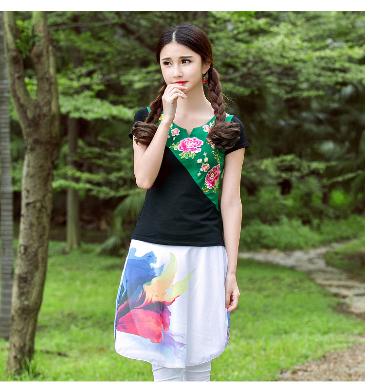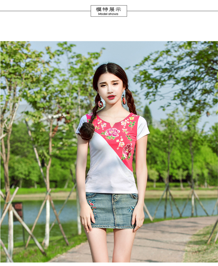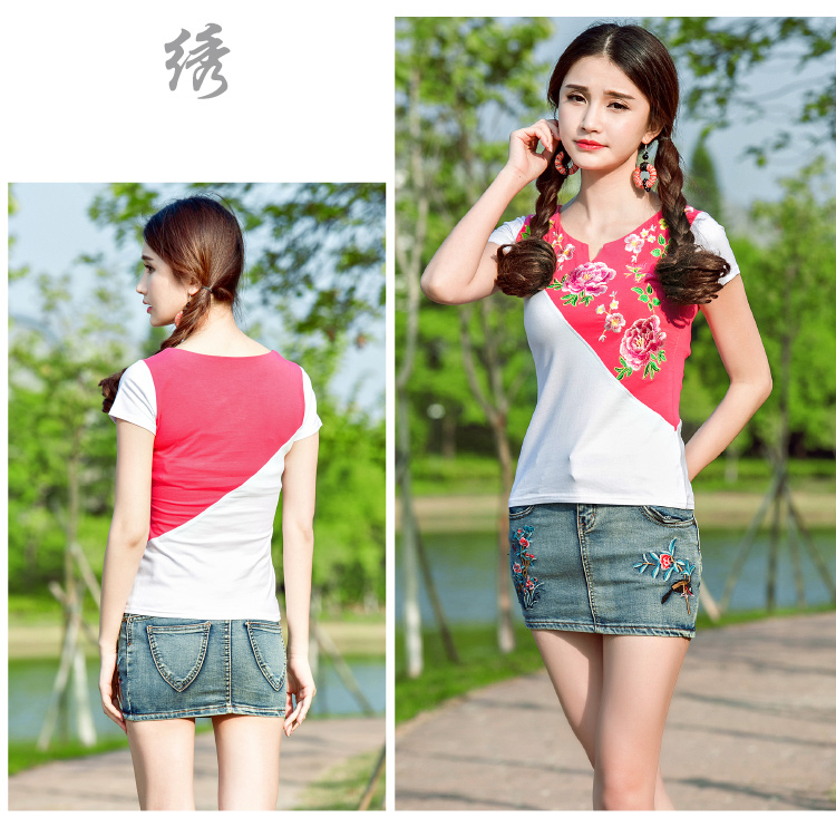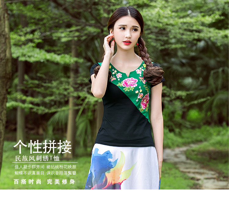 黑色4XL古色春裝新款大碼女裝 民族風刺繡打底衫 優質繡花修身短袖t恤女