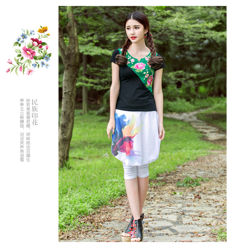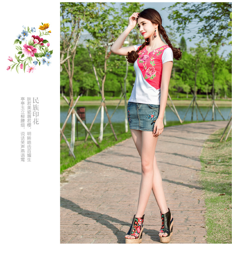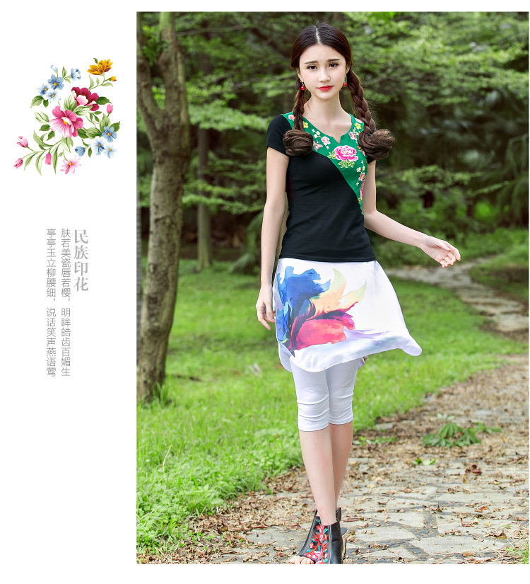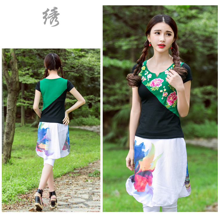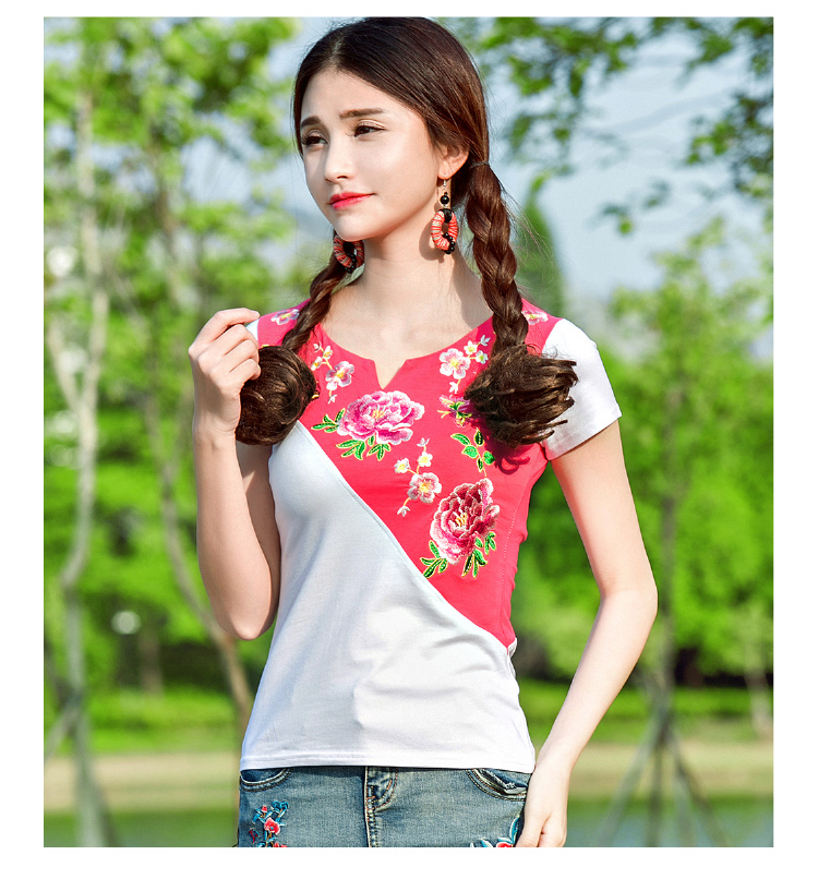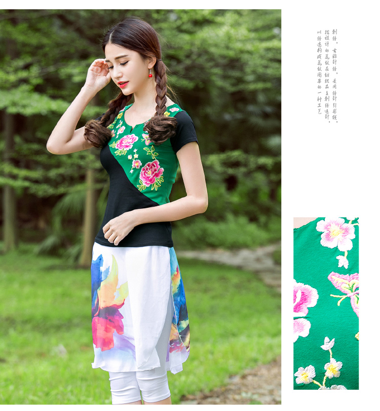 黑色4XL古色春裝新款大碼女裝 民族風刺繡打底衫 優質繡花修身短袖t恤女