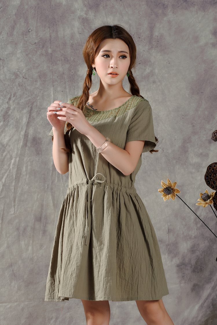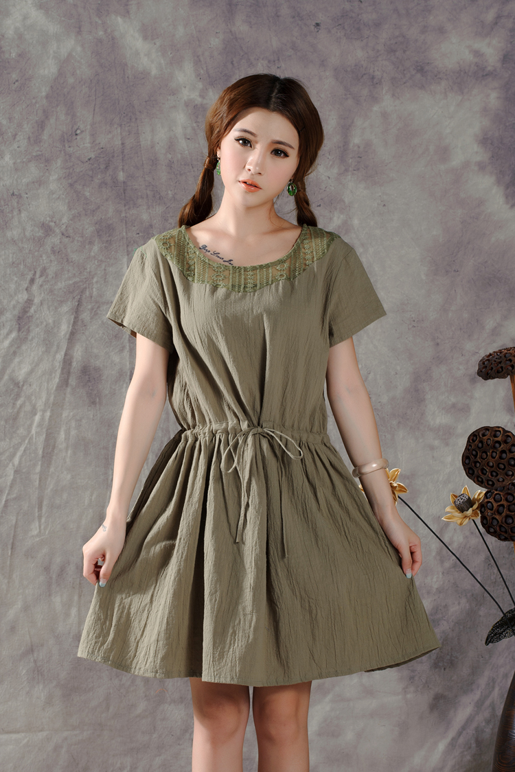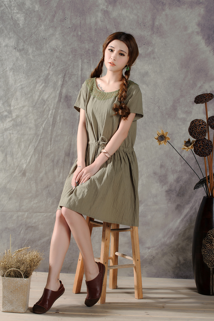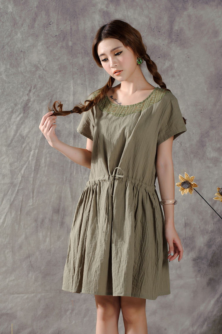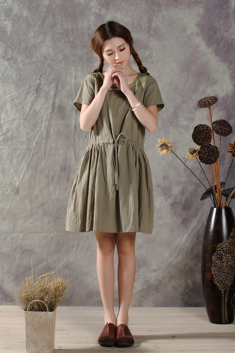 軍綠色均碼原創古香春裝新款純色寬松大碼文藝棉麻連衣裙 圓領褶皺連衣裙 女