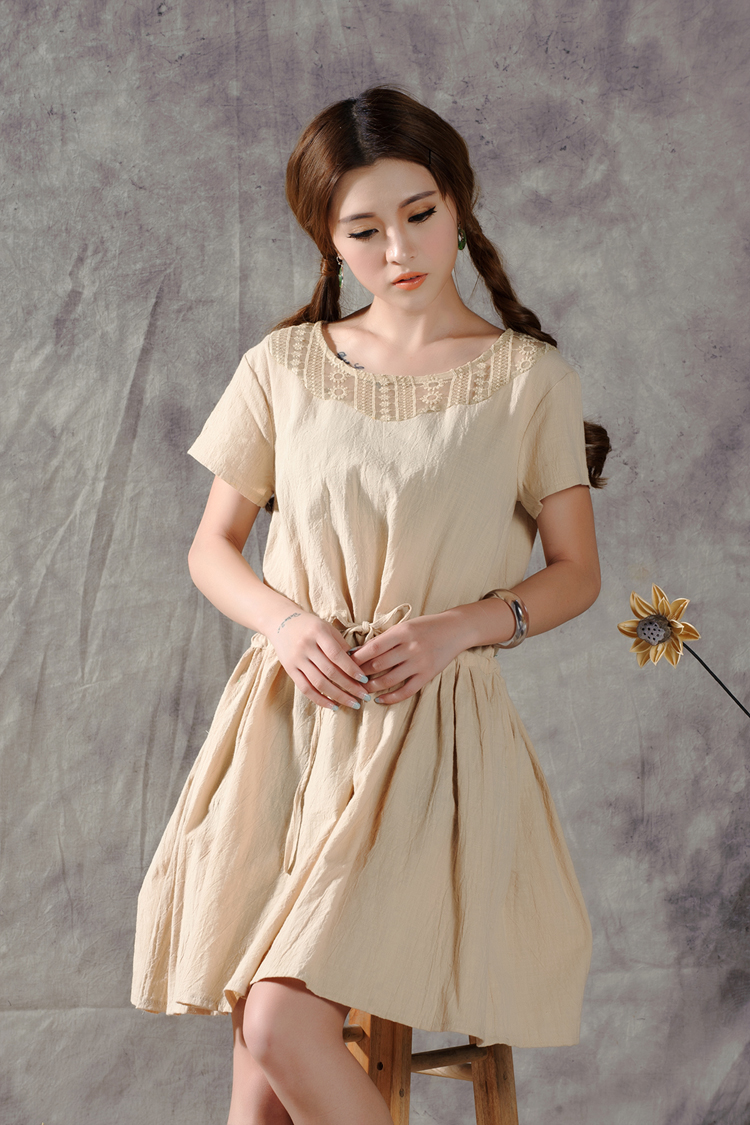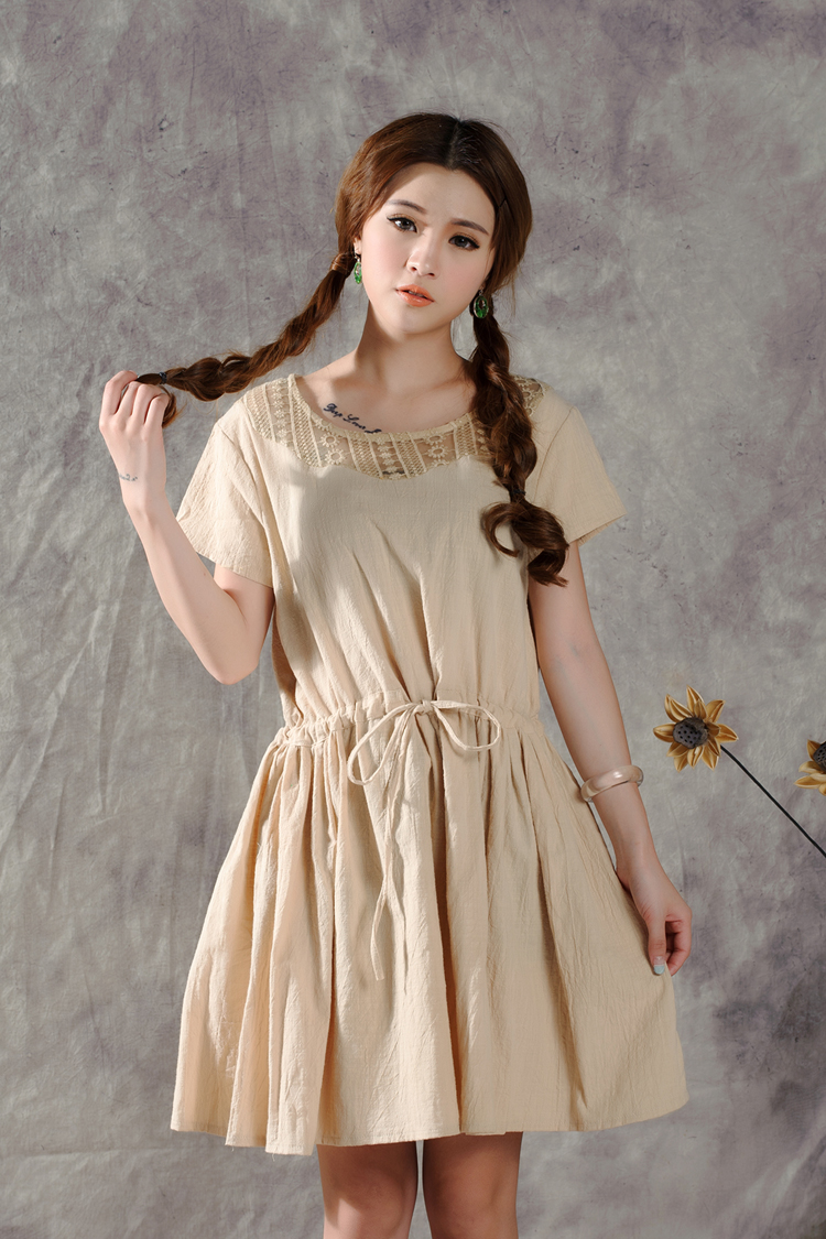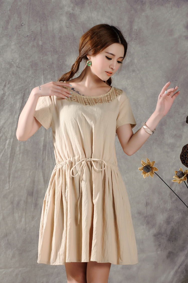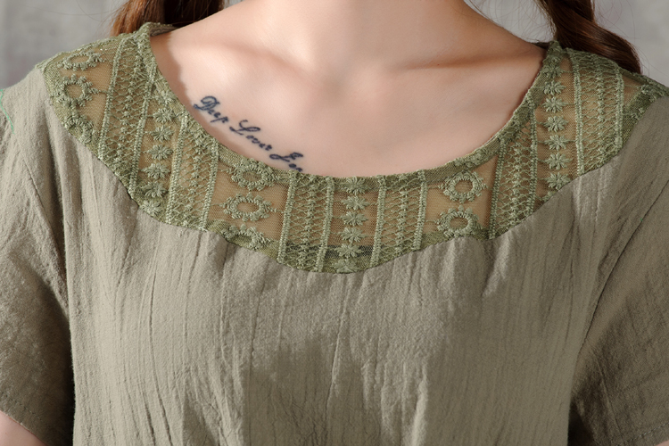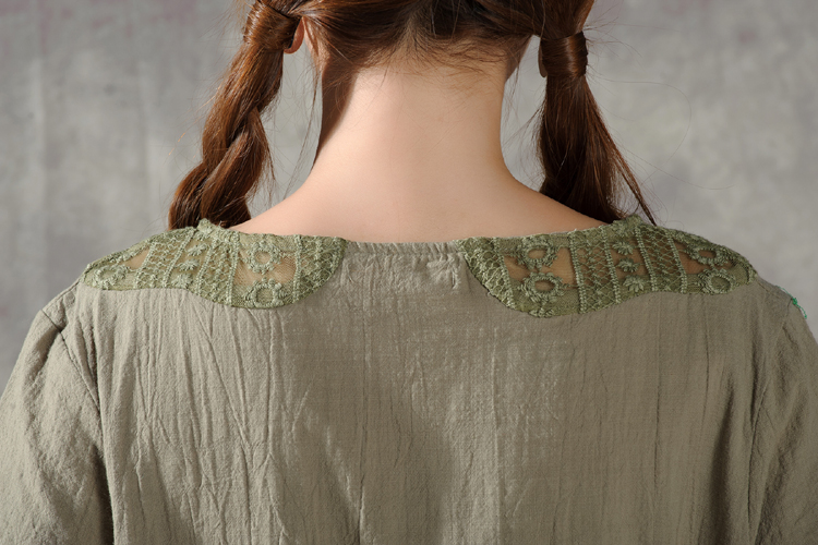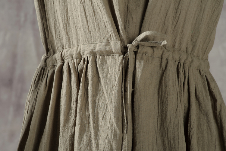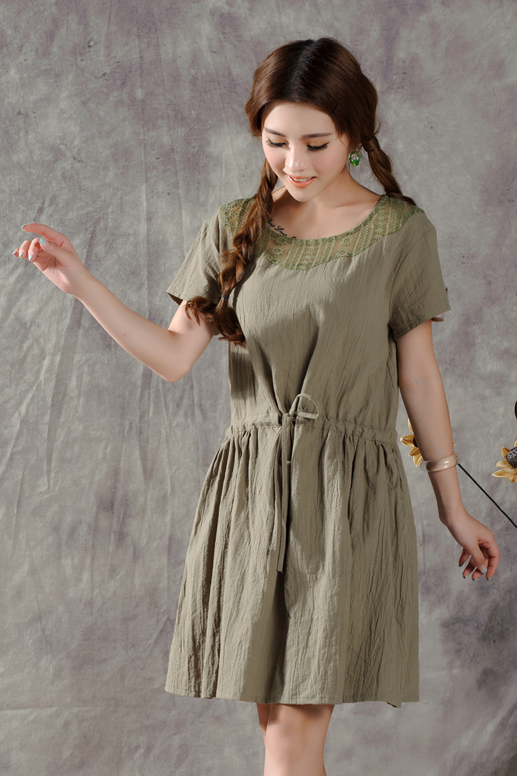 軍綠色均碼原創古香春裝新款純色寬松大碼文藝棉麻連衣裙 圓領褶皺連衣裙 女