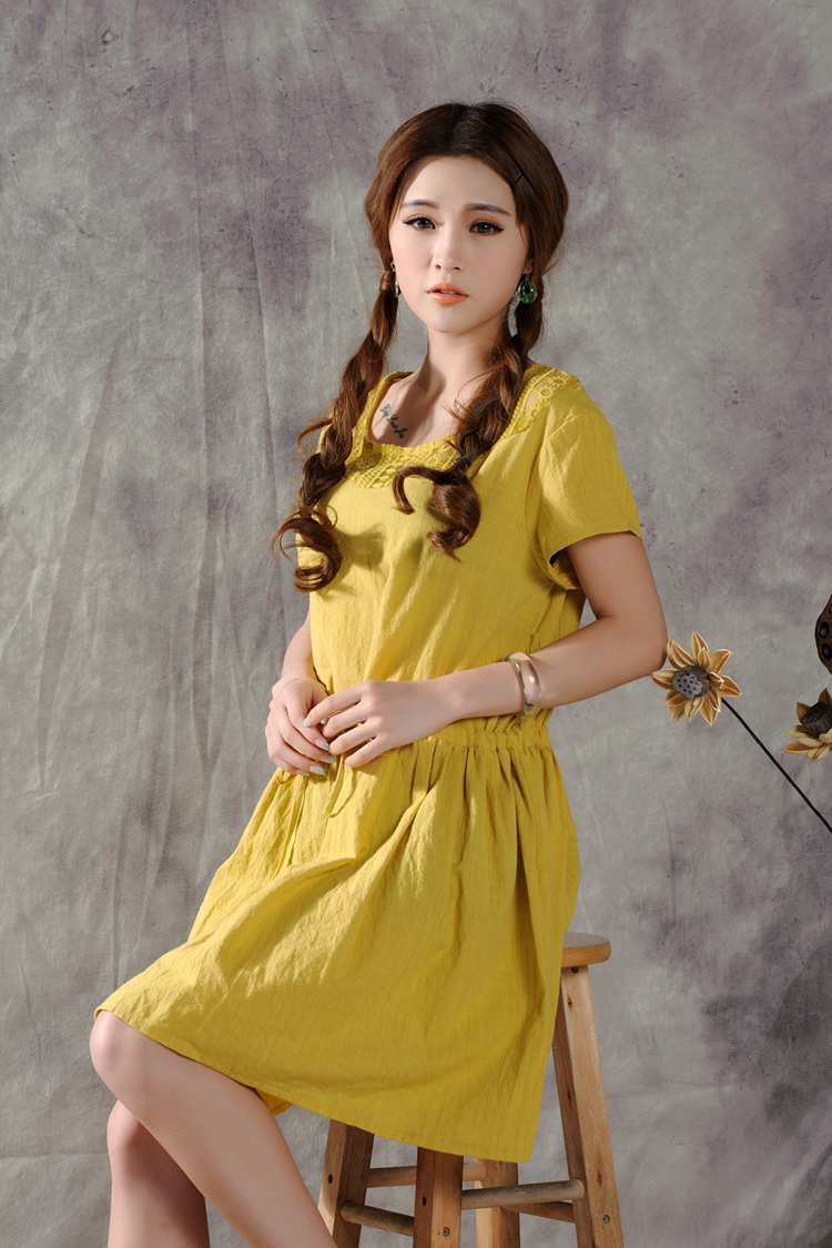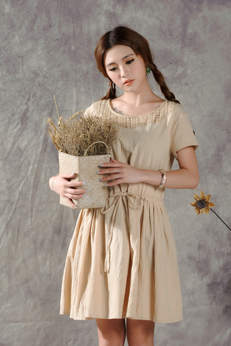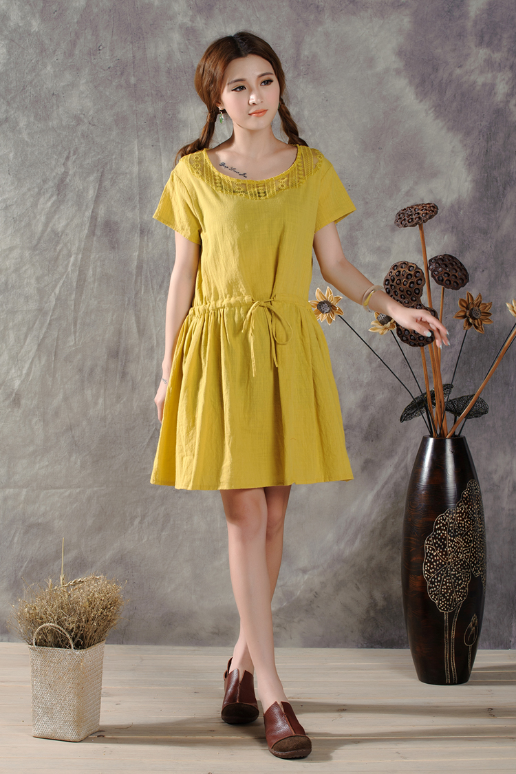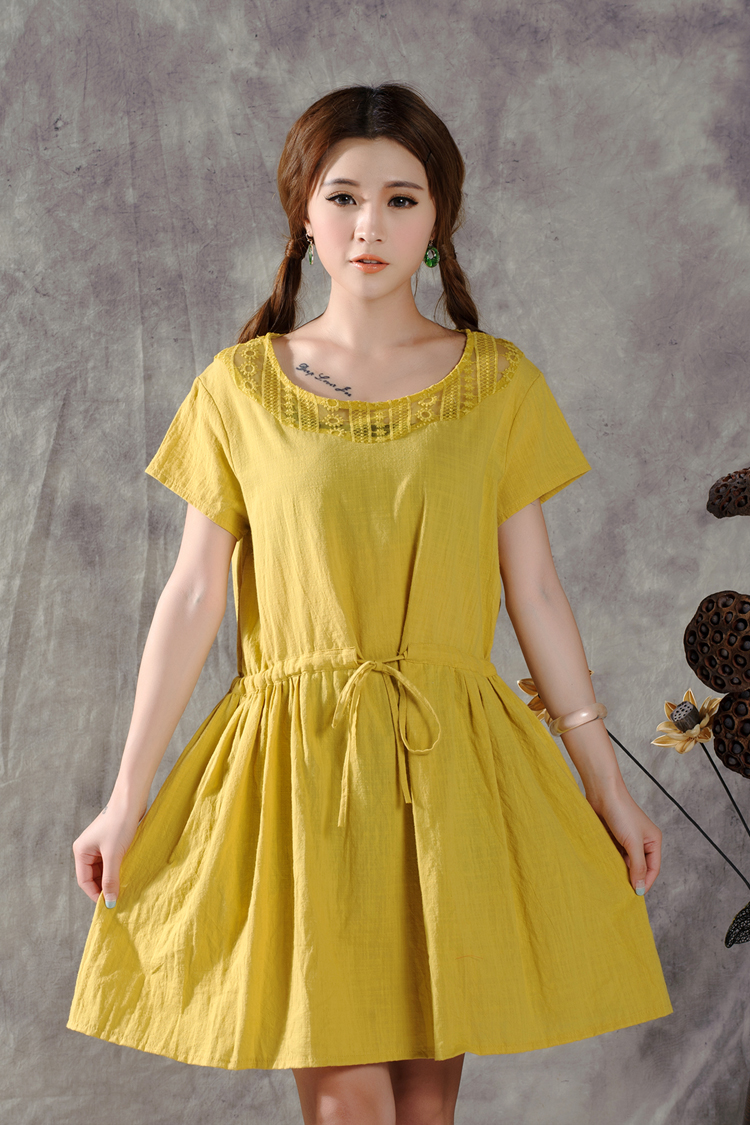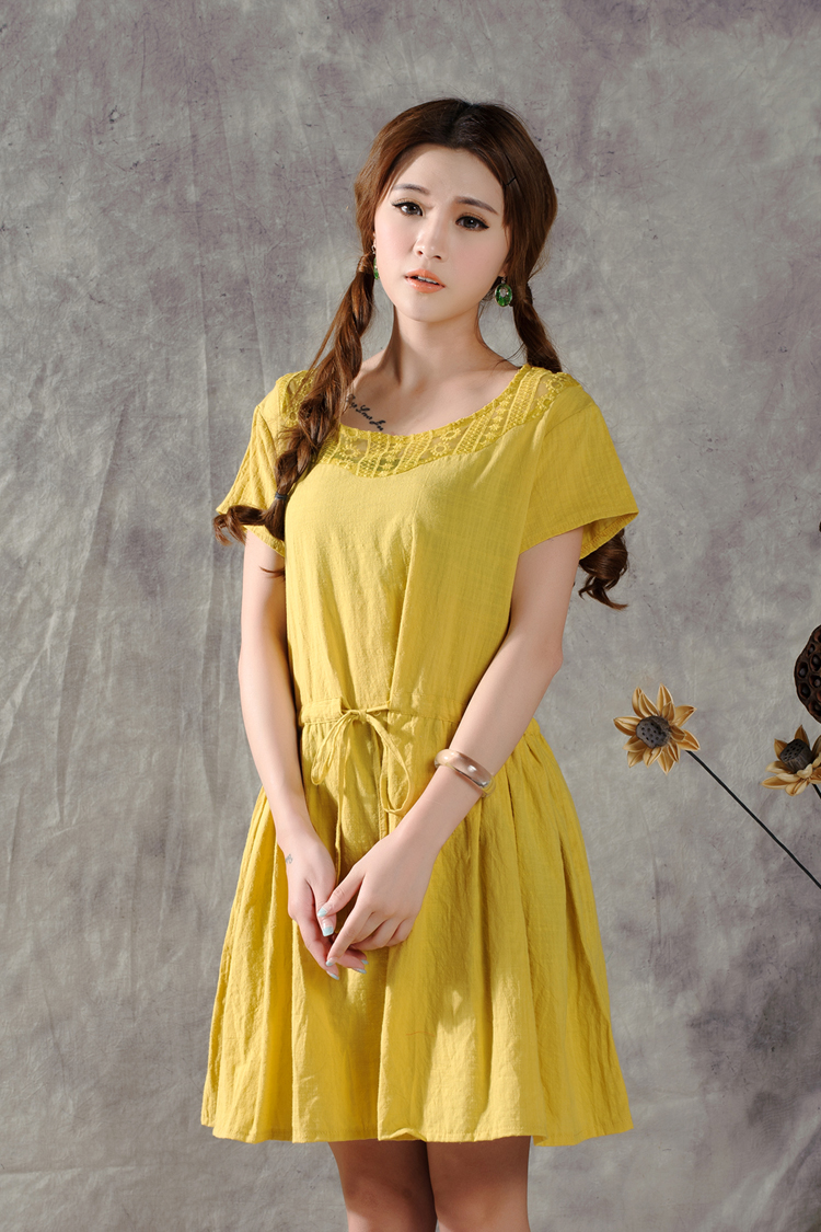 軍綠色均碼原創古香春裝新款純色寬松大碼文藝棉麻連衣裙 圓領褶皺連衣裙 女