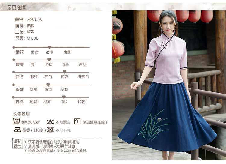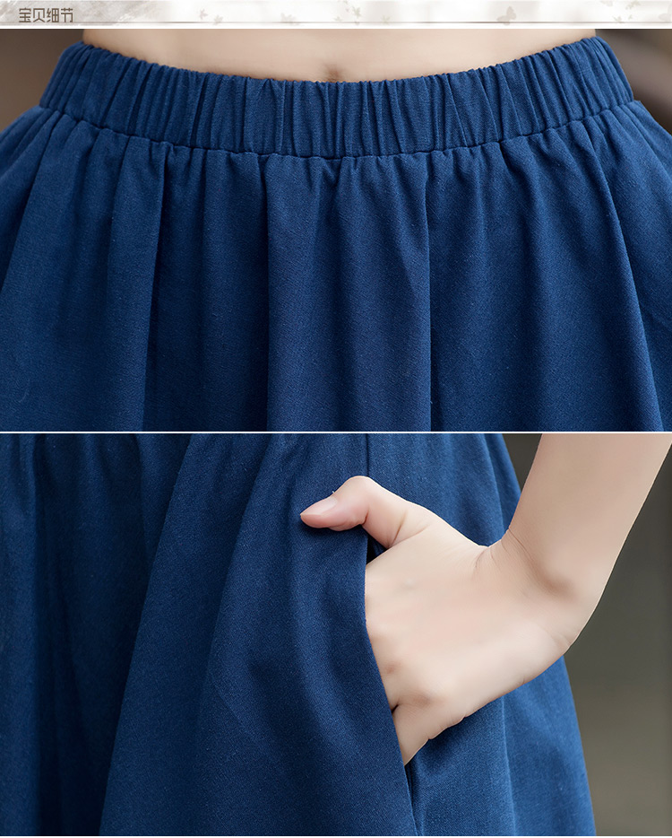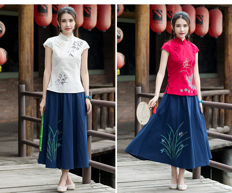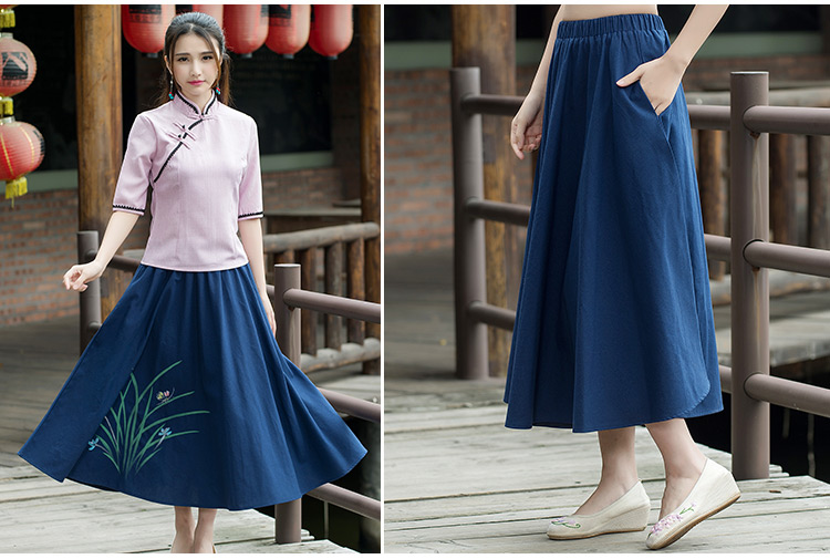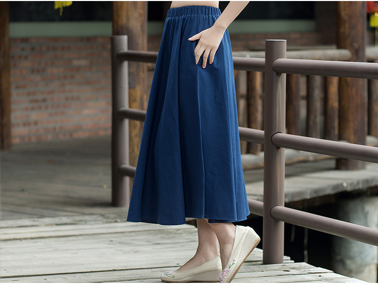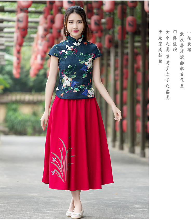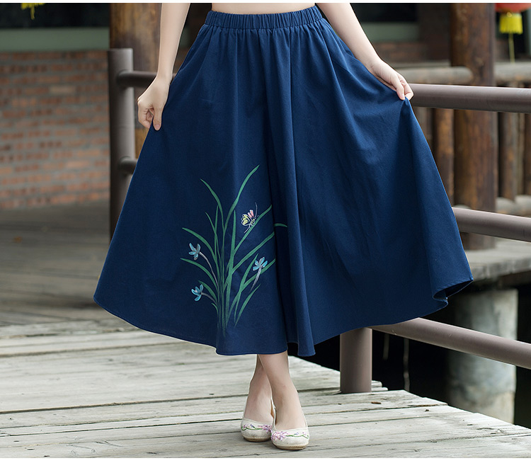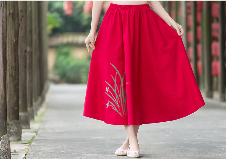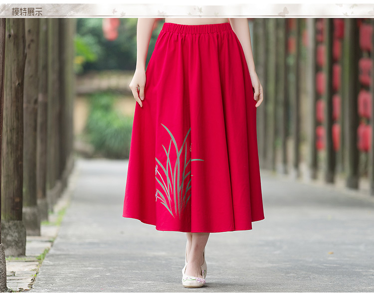 紅色M古色春裝新品女裝民族風復古文藝手繪印花棉麻亞麻大擺半身裙長裙