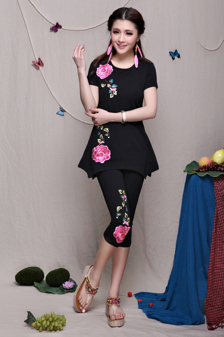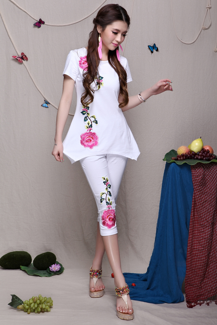 白色M新款民族風 夏女短袖繡花T恤不規則下擺中長款純色牡丹刺繡