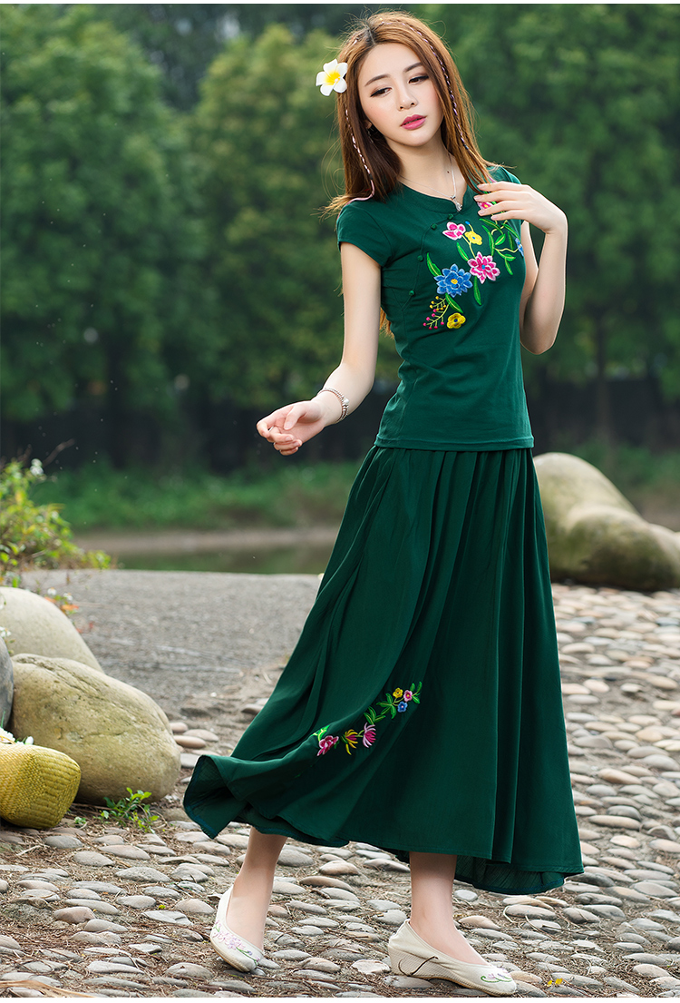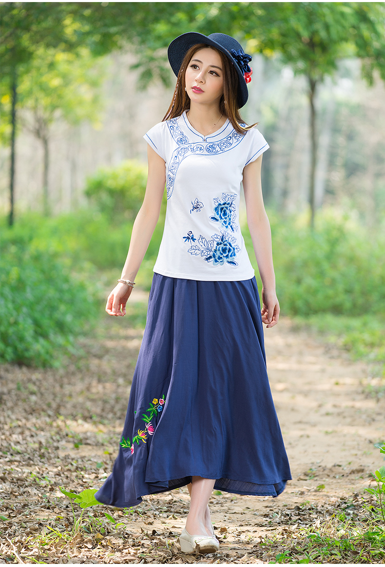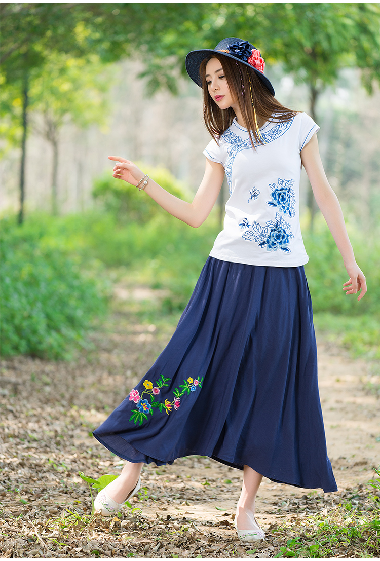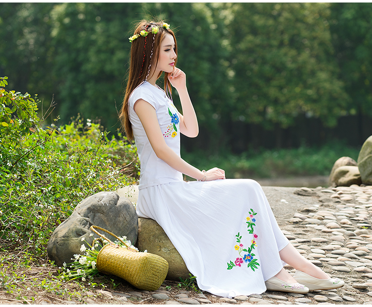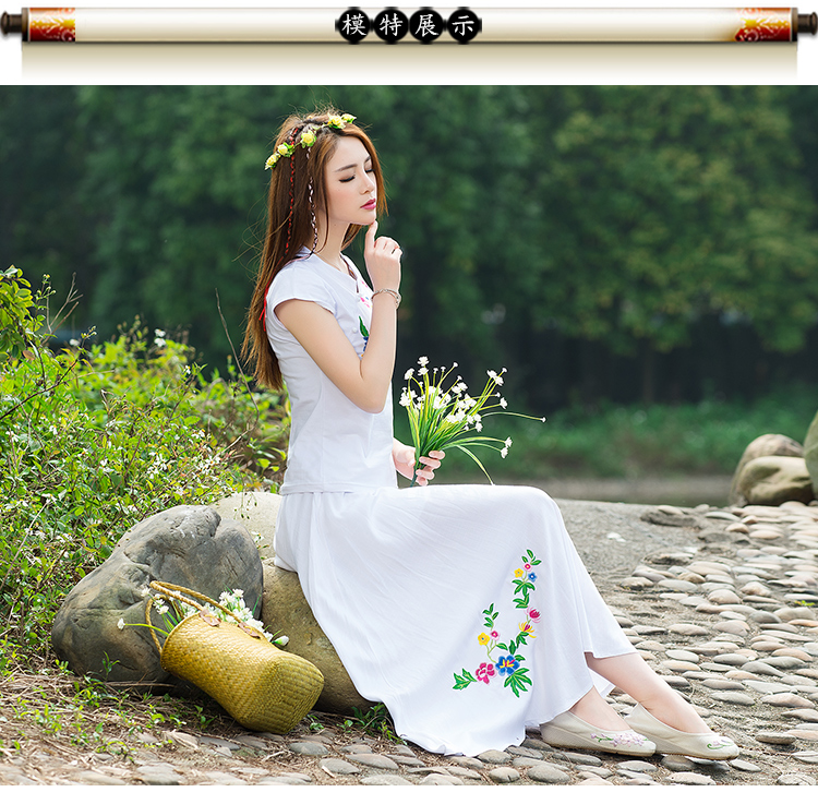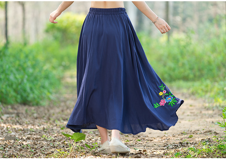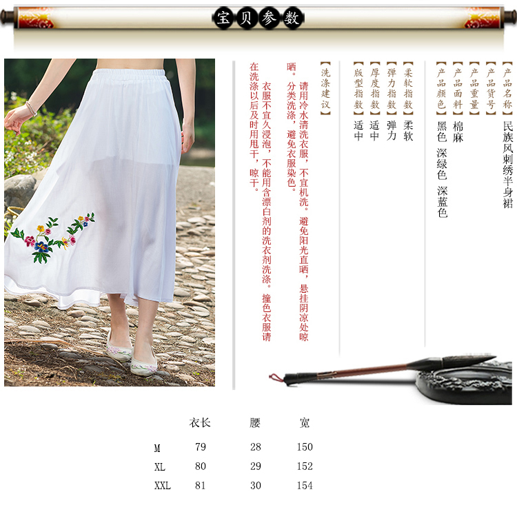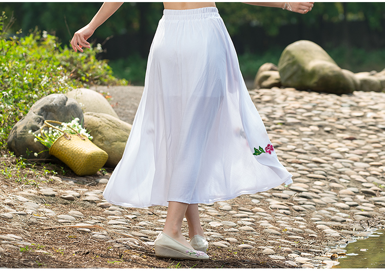 白色M氣質原創棉麻復古刺繡花民族風女裝半身裙松緊腰大碼大擺A字女裙
