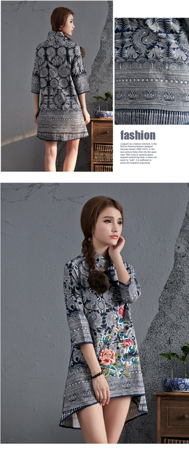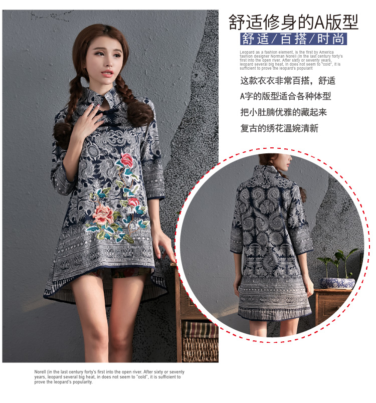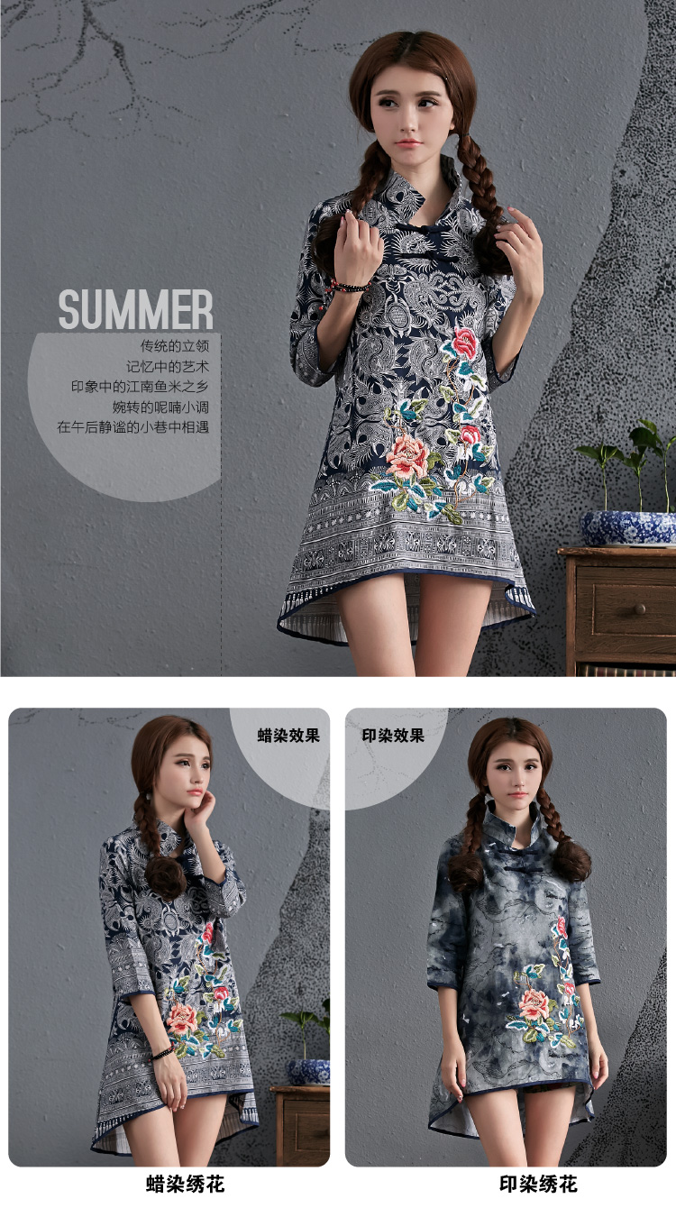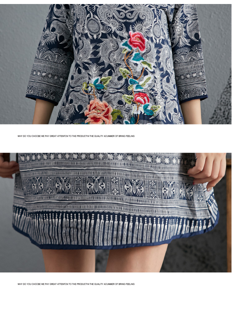 蠟染繡花均碼夏新款女裝復古民族風刺繡花棉麻中袖翻領盤扣喇叭下擺襯衫連衣裙