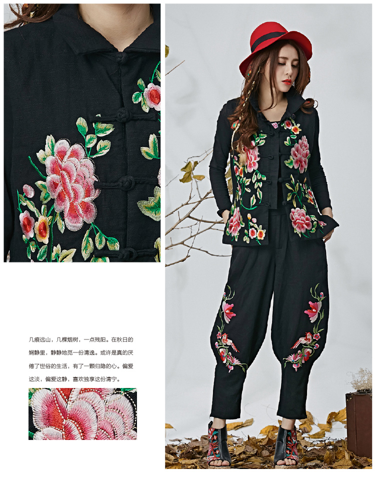 黑色均碼新款女裝民族風繡花手工一字盤扣方領側縫開叉夾棉亞麻料馬夾