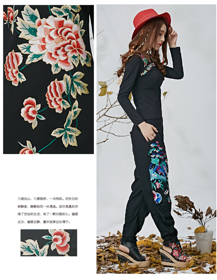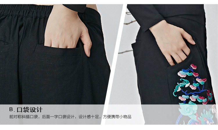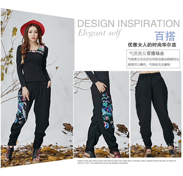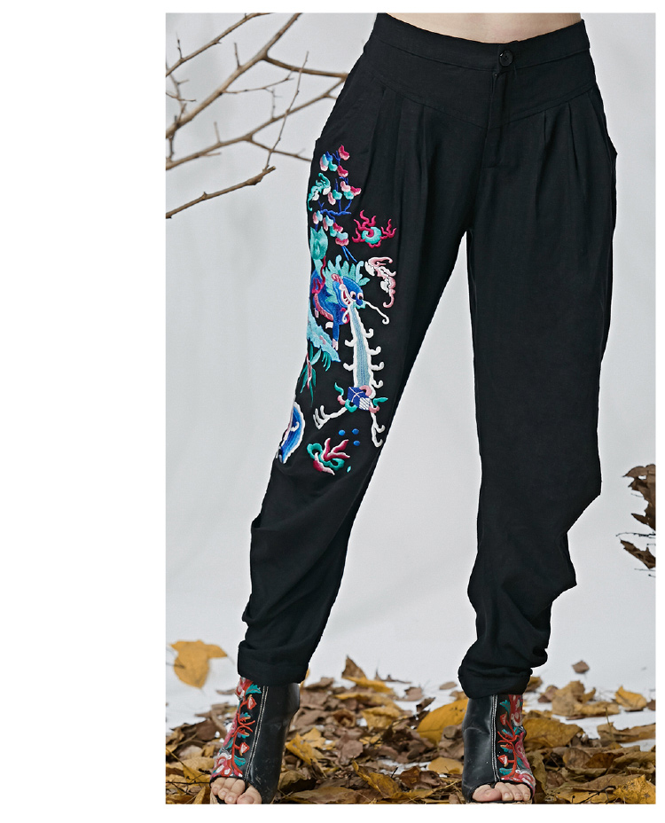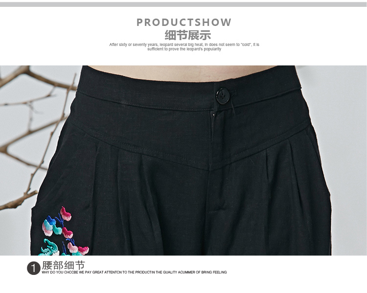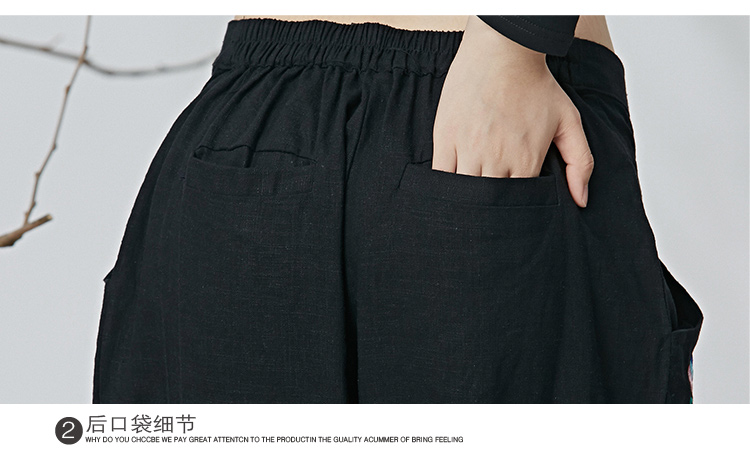 黑色M夏季新款女裝民族風文藝風刺繡花做褶闊腿盤腿長褲休閑褲長褲女