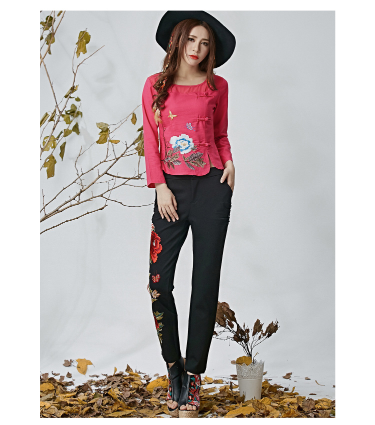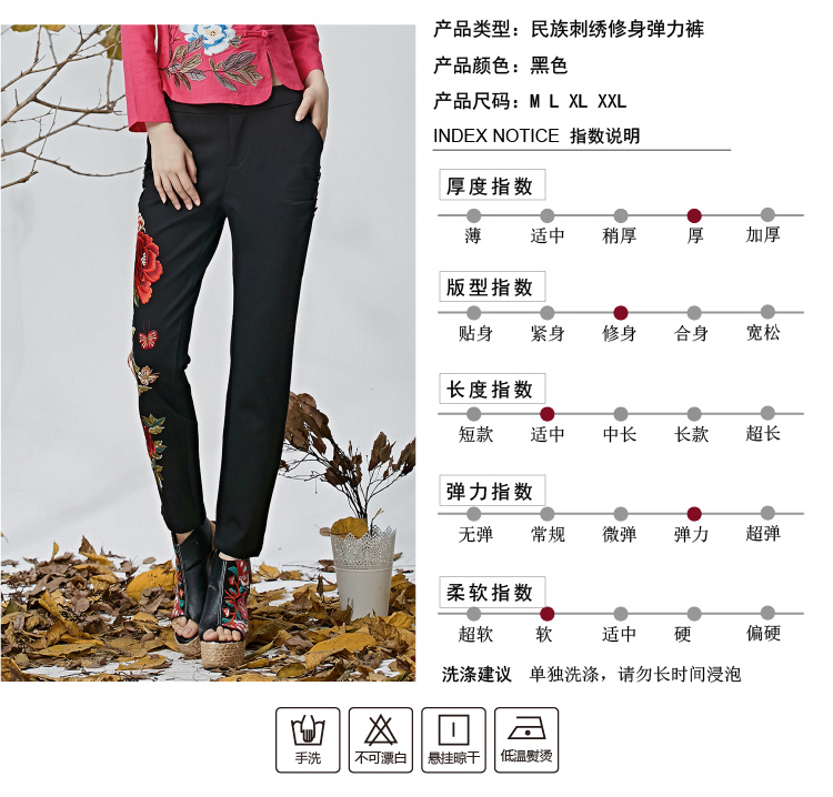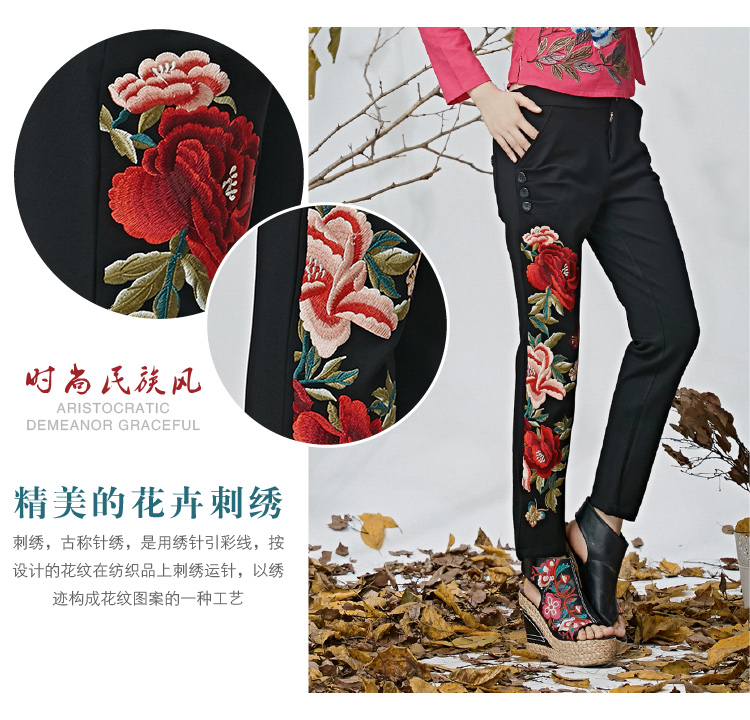 黑色M春秋冬新款女裝褲中國風復古民族風刺繡花長褲百搭休閑長褲小腳褲