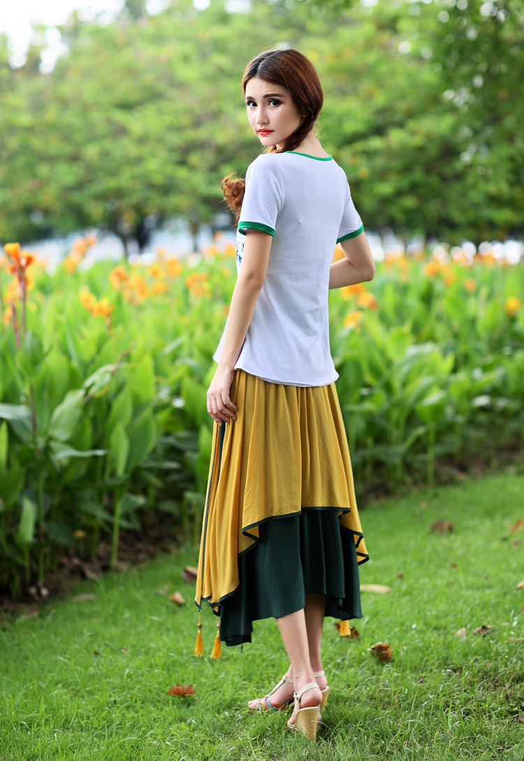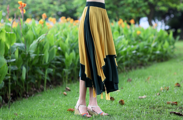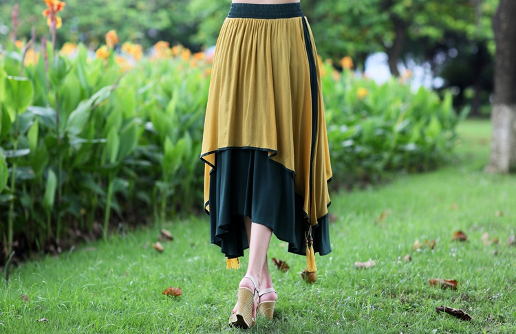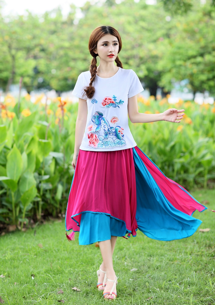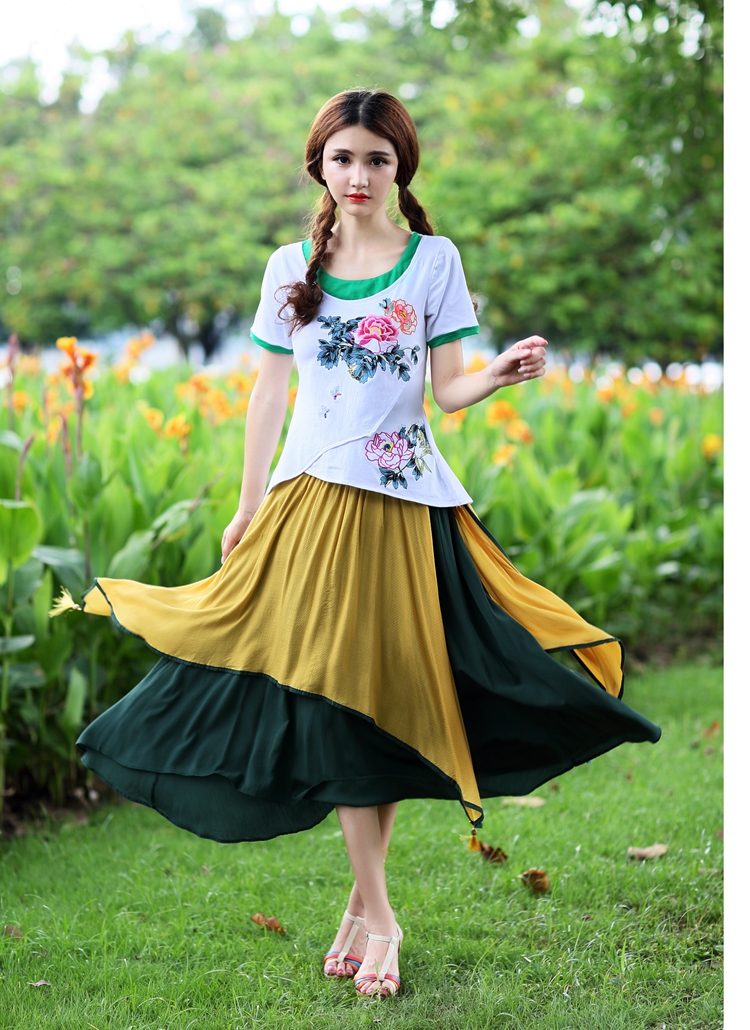 湖藍撞紅均碼夏裝新款女中國風民族風刺繡花大擺裙棉麻質半身裙多層次雙層裙子