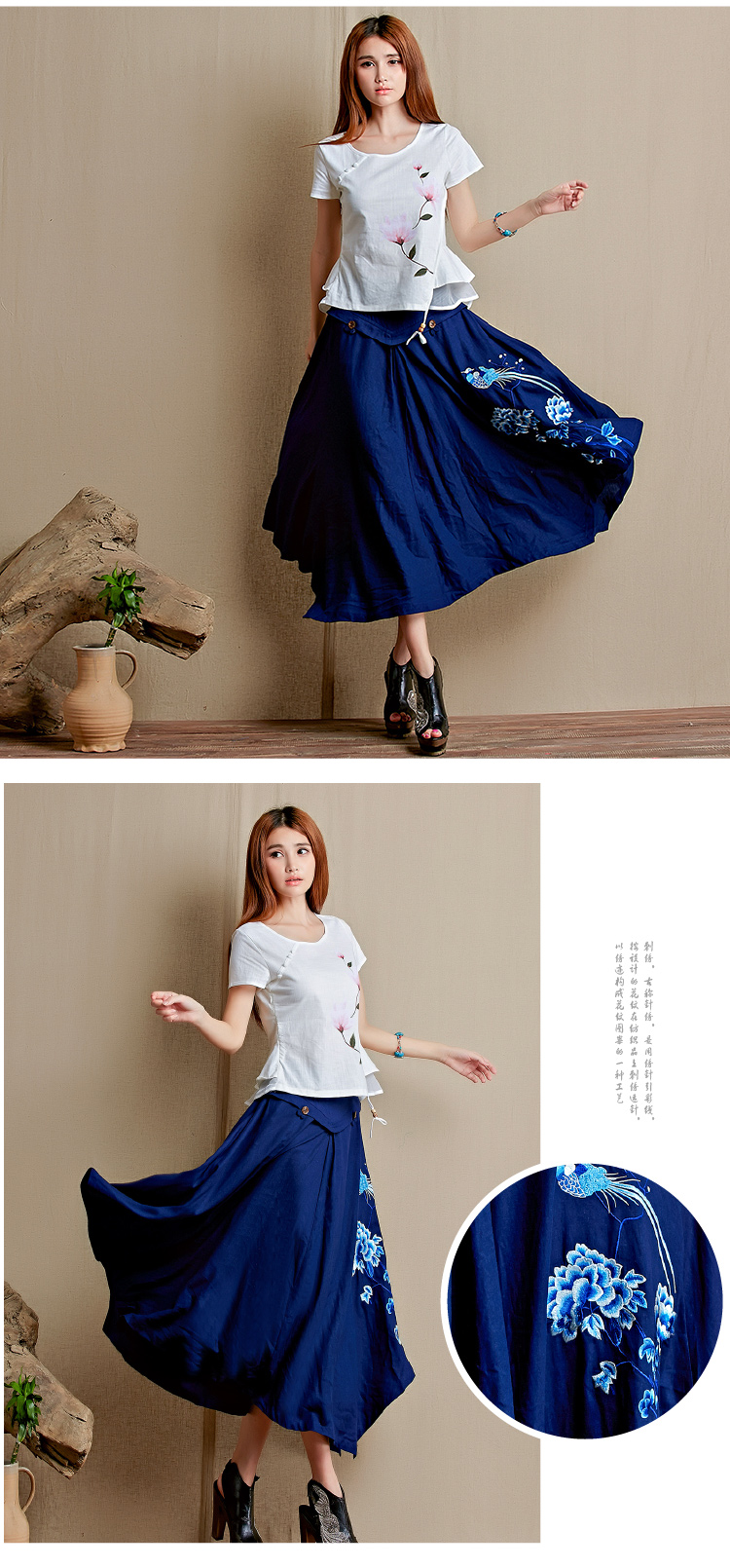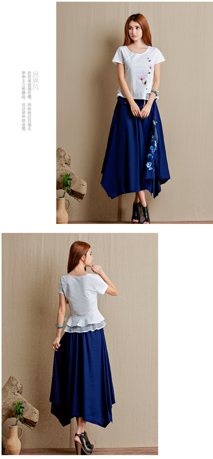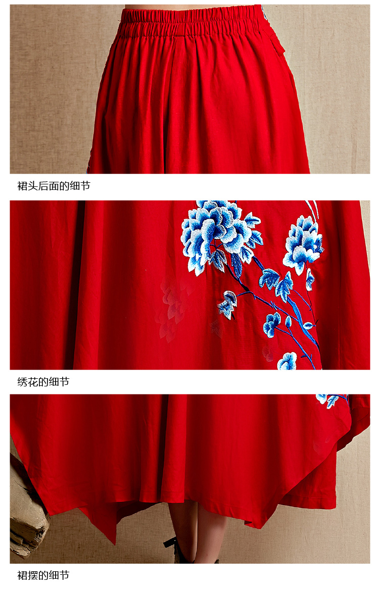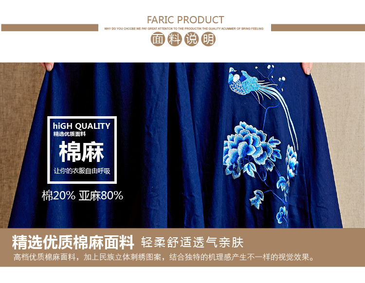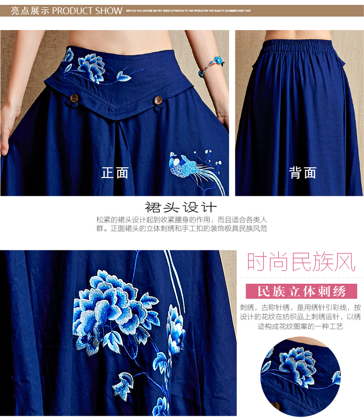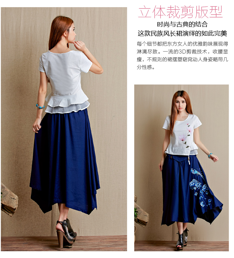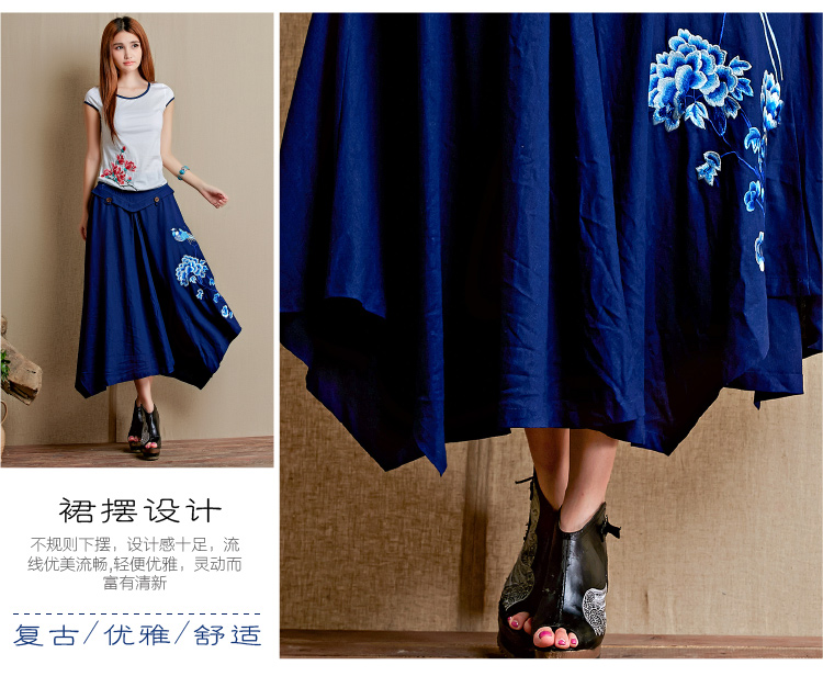 深藍色均碼夏秋新款女裝中國風民族風半身裙刺繡花松緊腰不規則下擺棉亞麻