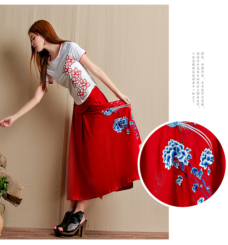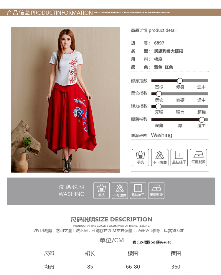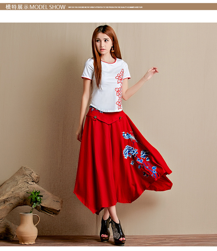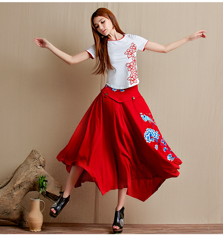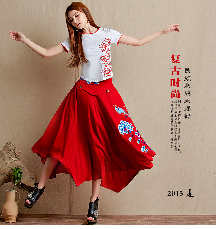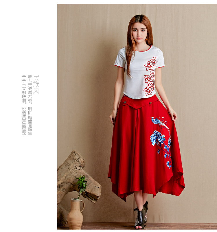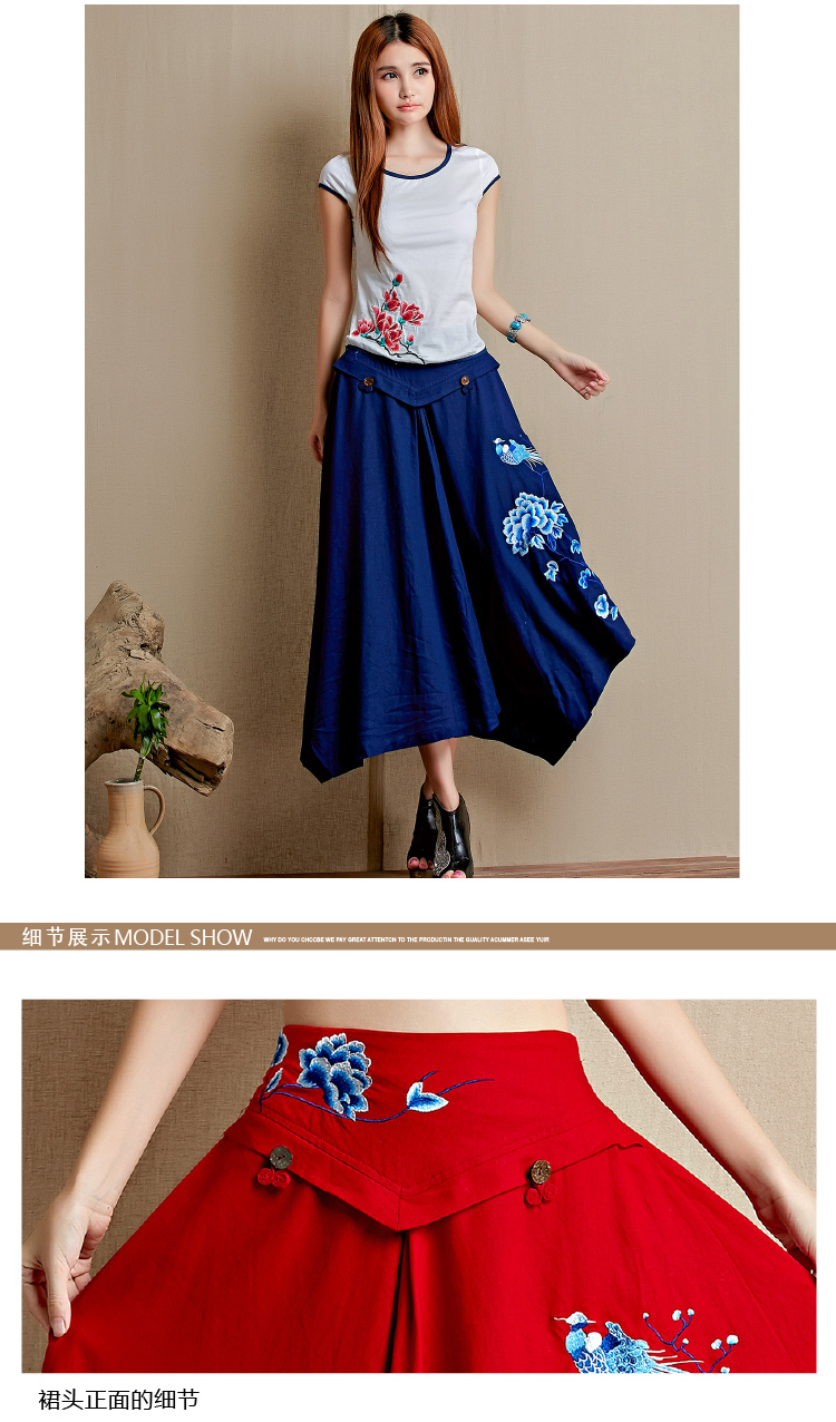 深藍色均碼夏秋新款女裝中國風民族風半身裙刺繡花松緊腰不規則下擺棉亞麻