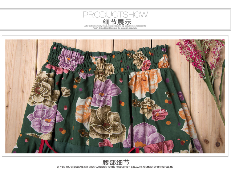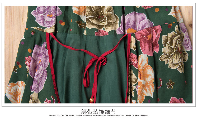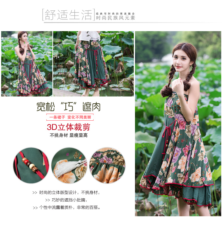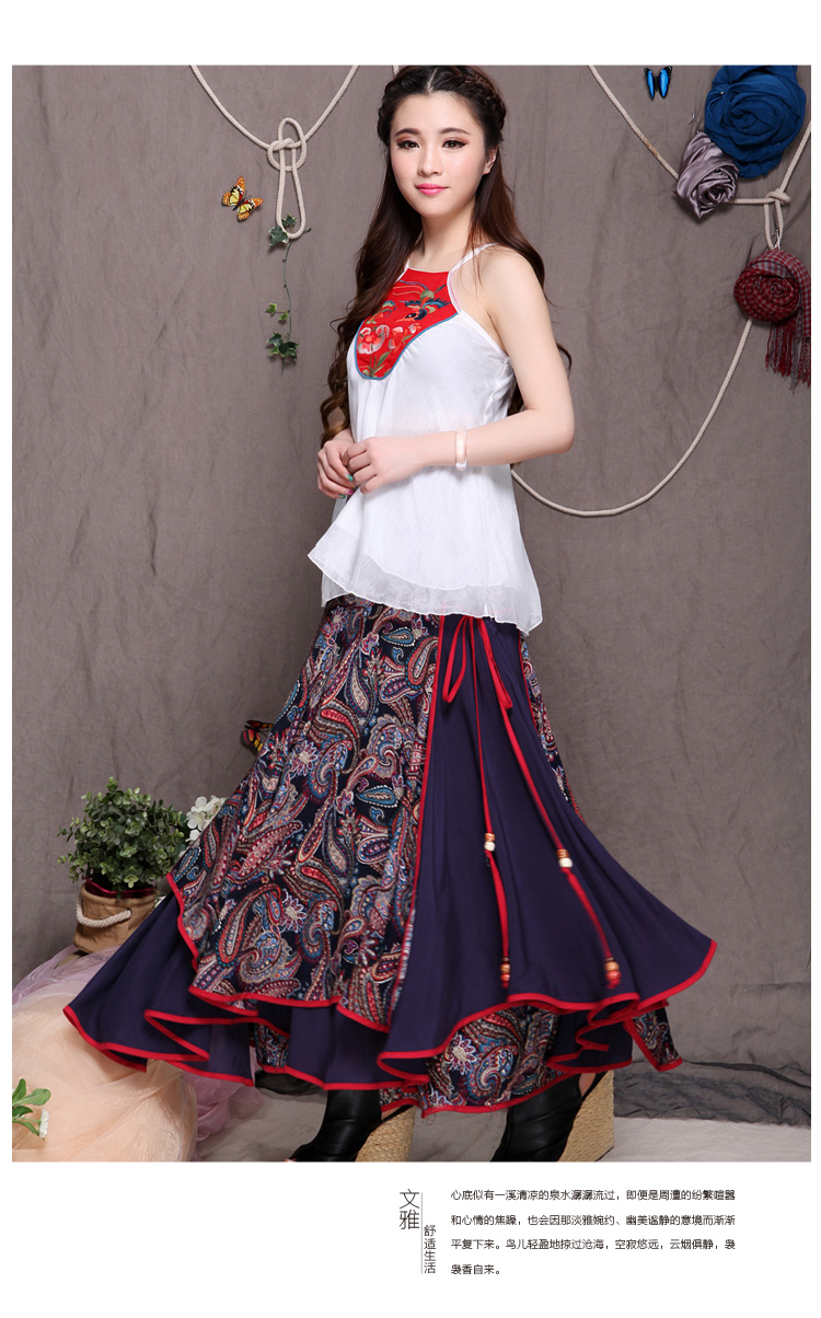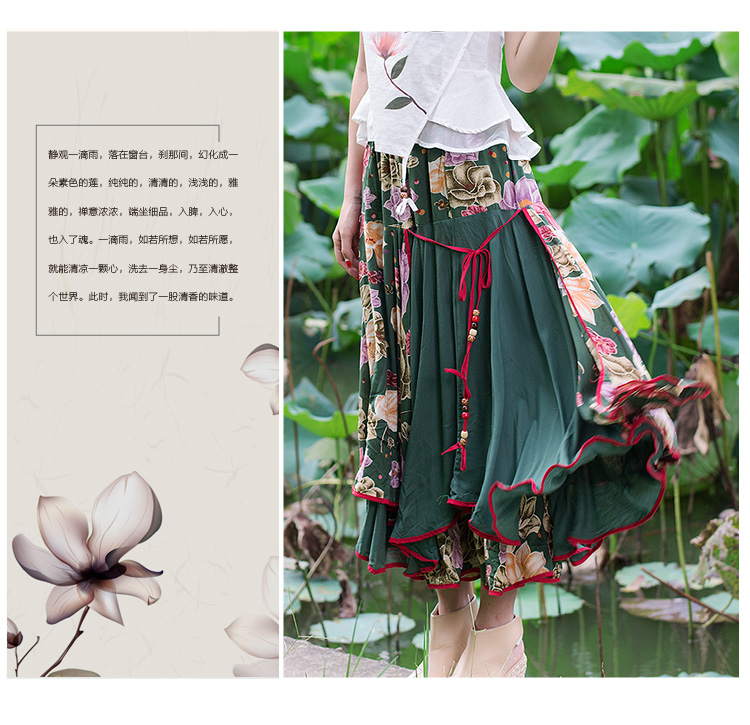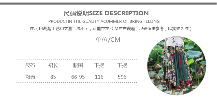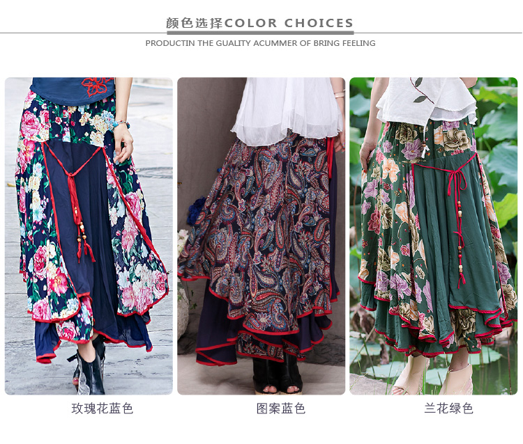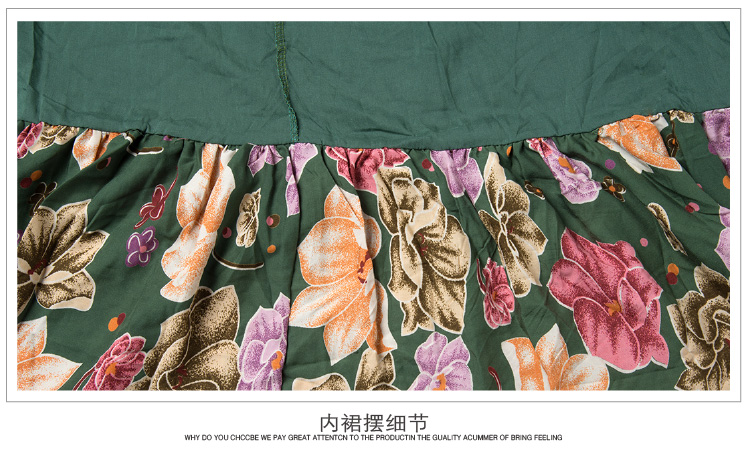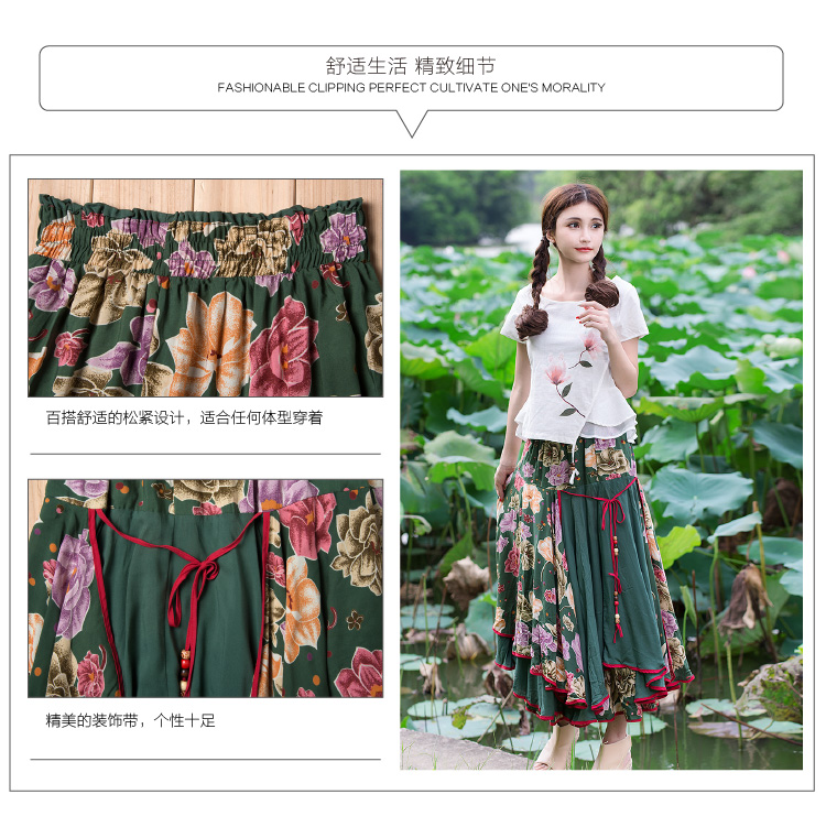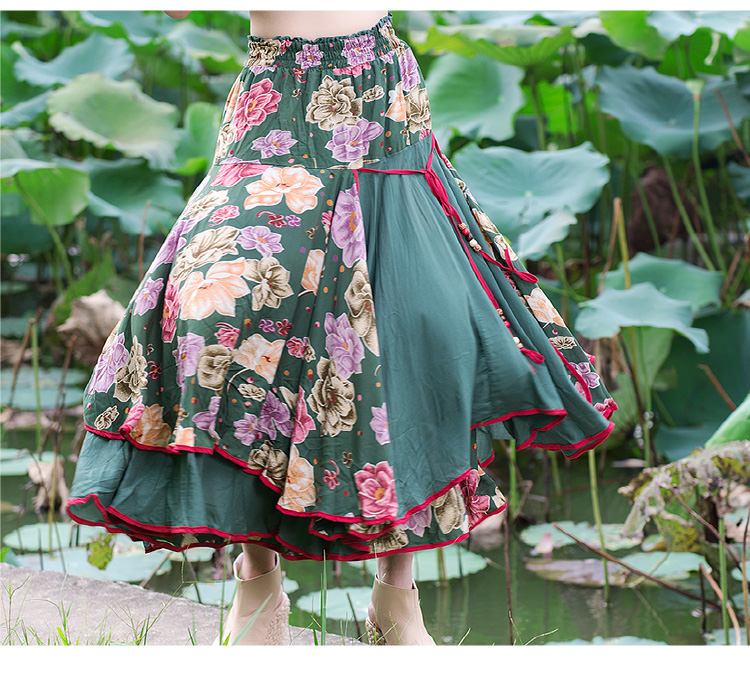 軍綠色均碼春夏新款女裝中國風復古民族風拼色兩穿松緊腰大擺裙半身裙連衣裙