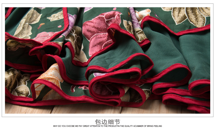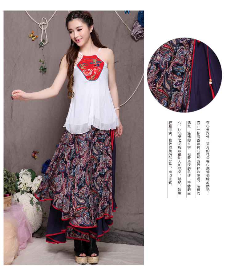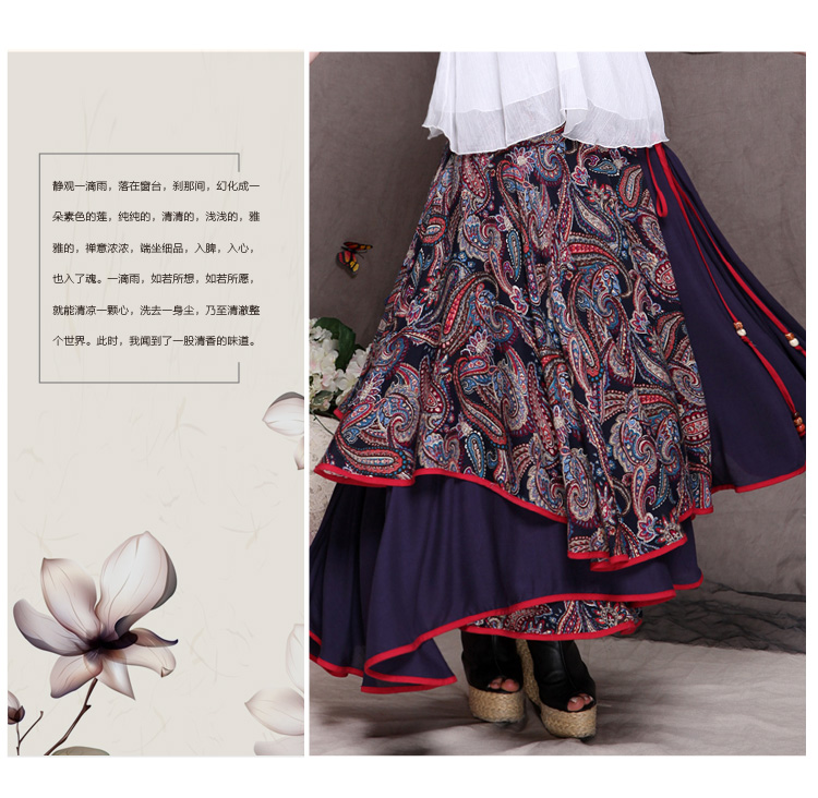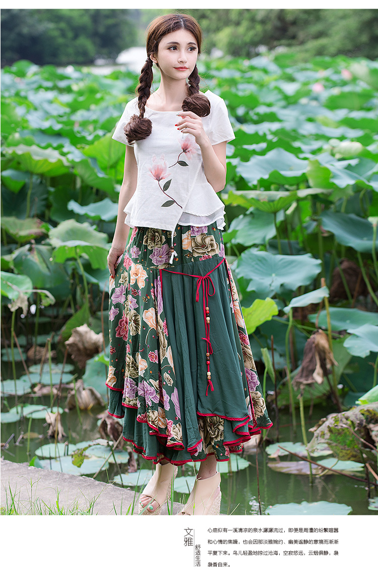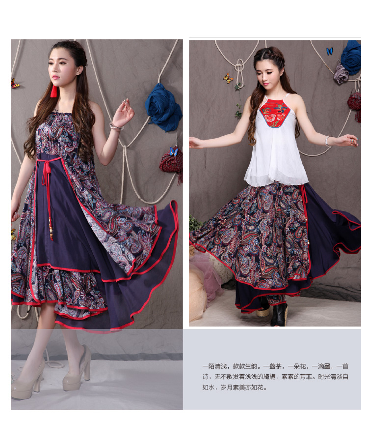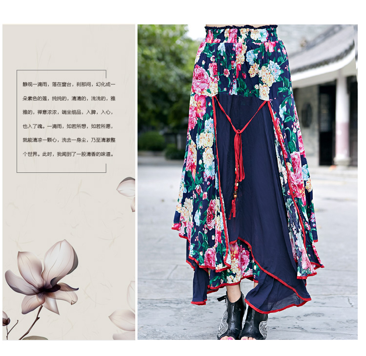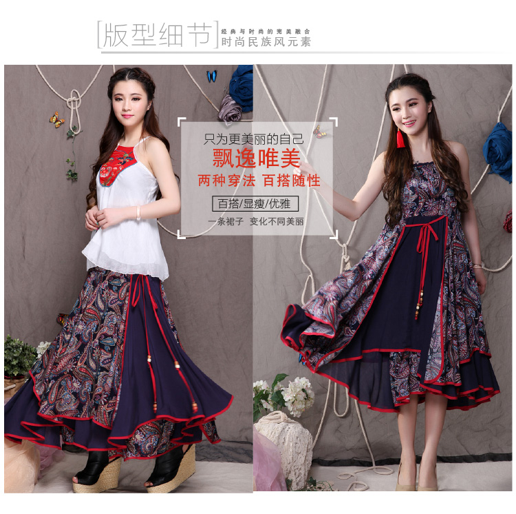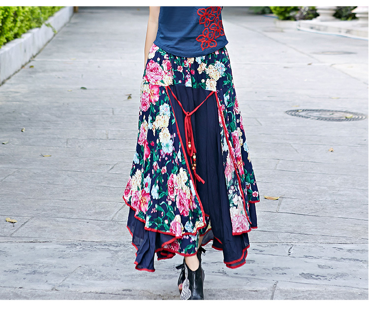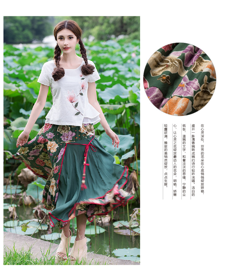 軍綠色均碼春夏新款女裝中國風復古民族風拼色兩穿松緊腰大擺裙半身裙連衣裙
