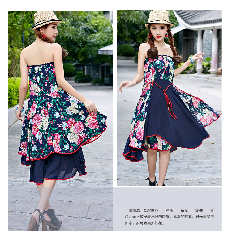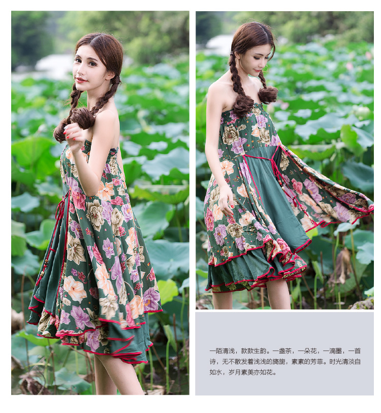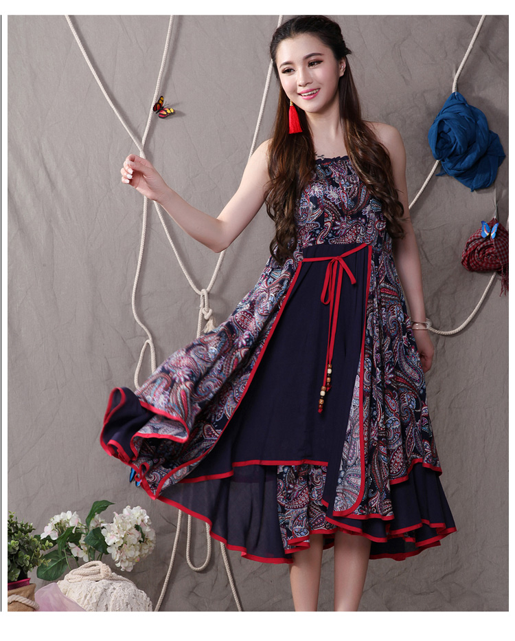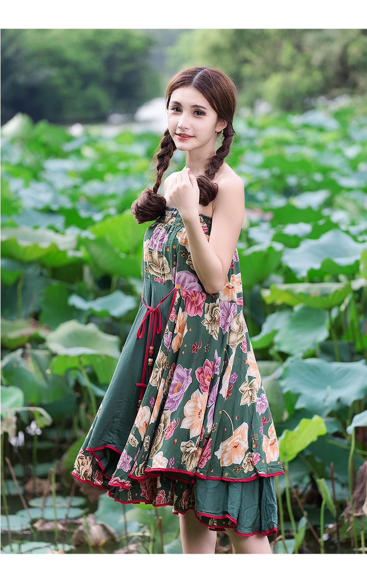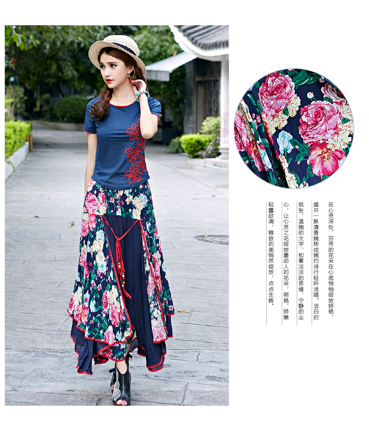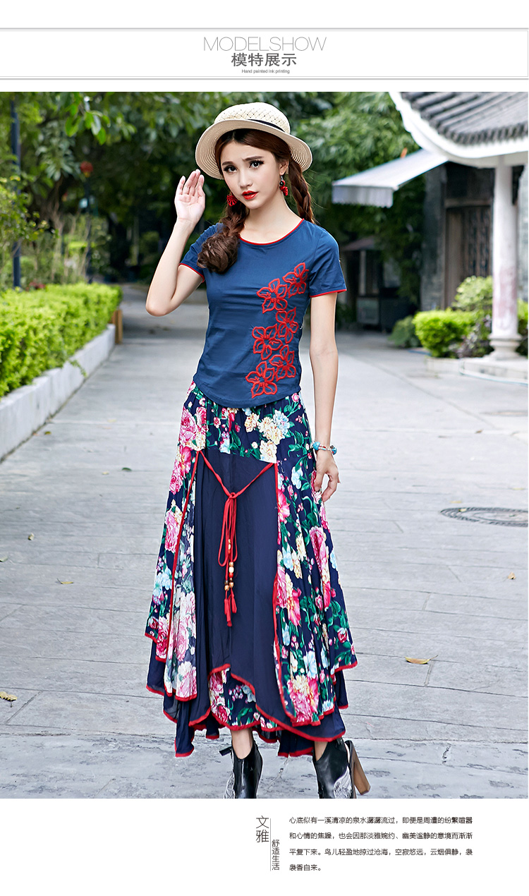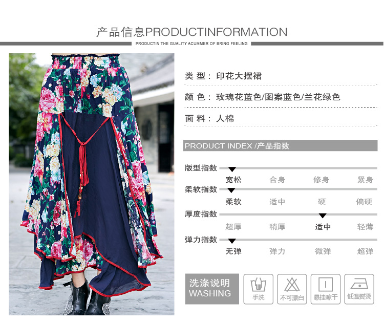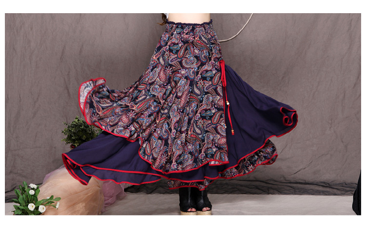 軍綠色均碼春夏新款女裝中國風復古民族風拼色兩穿松緊腰大擺裙半身裙連衣裙