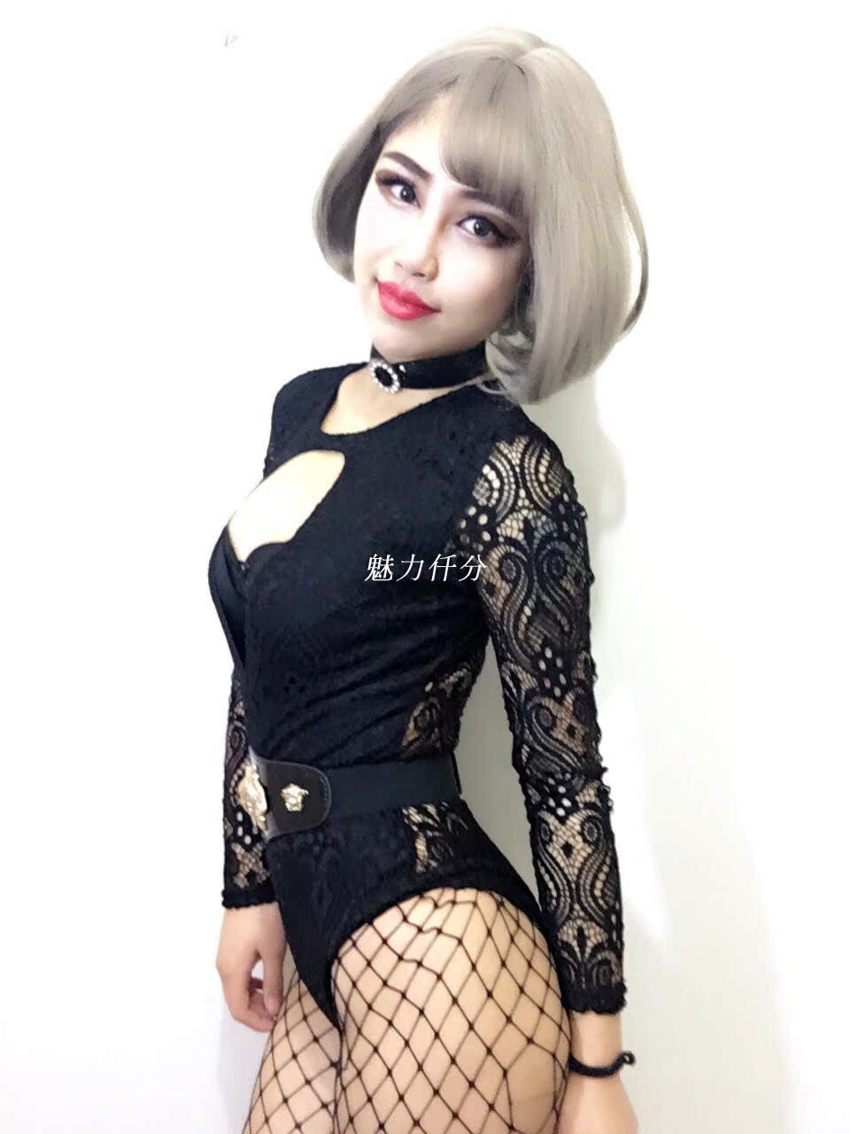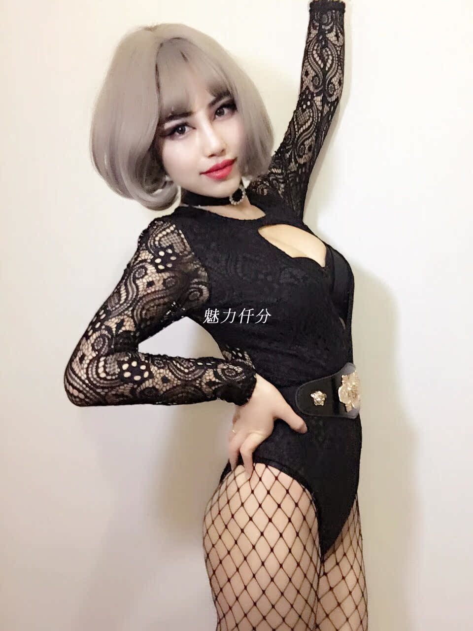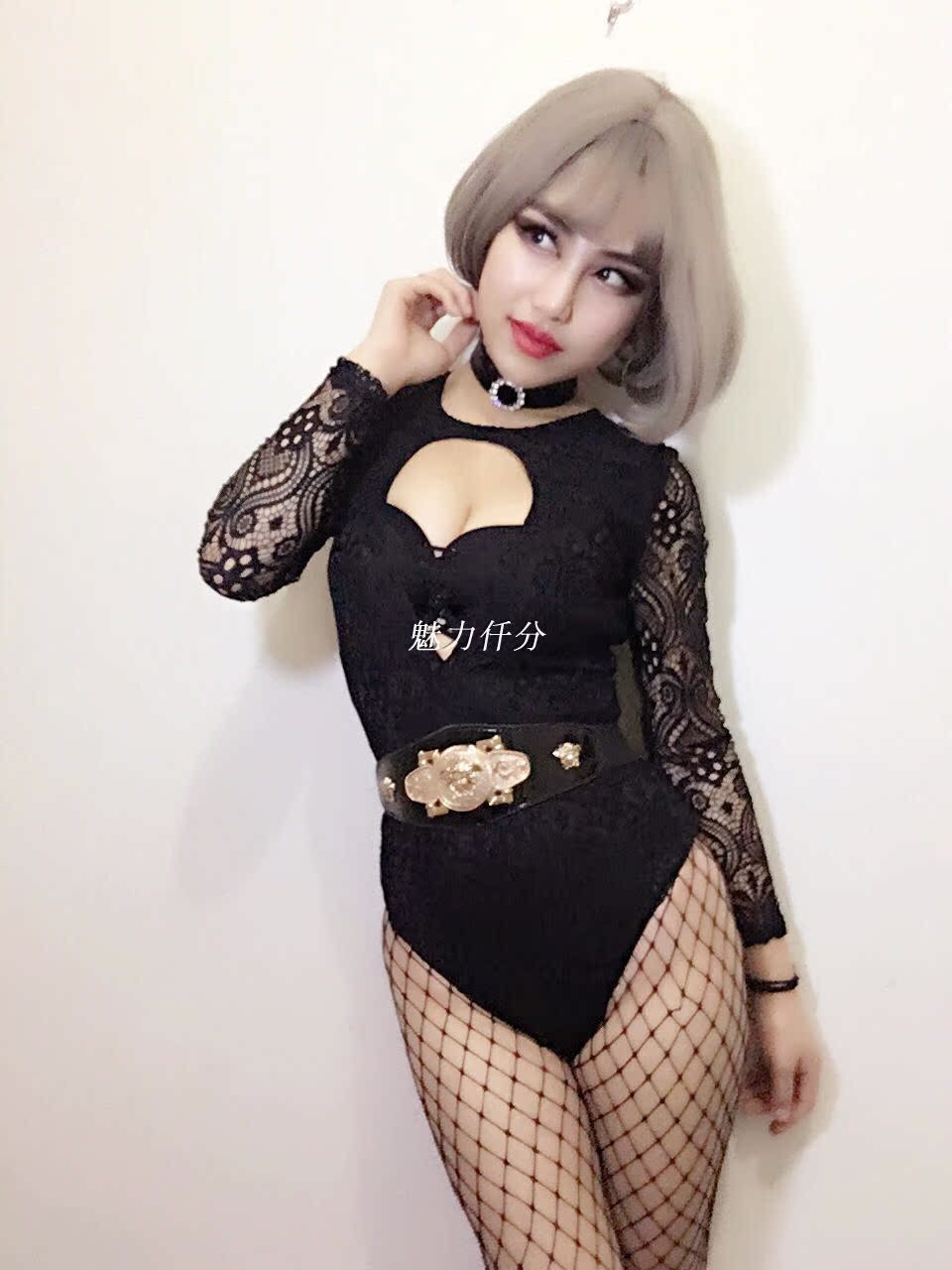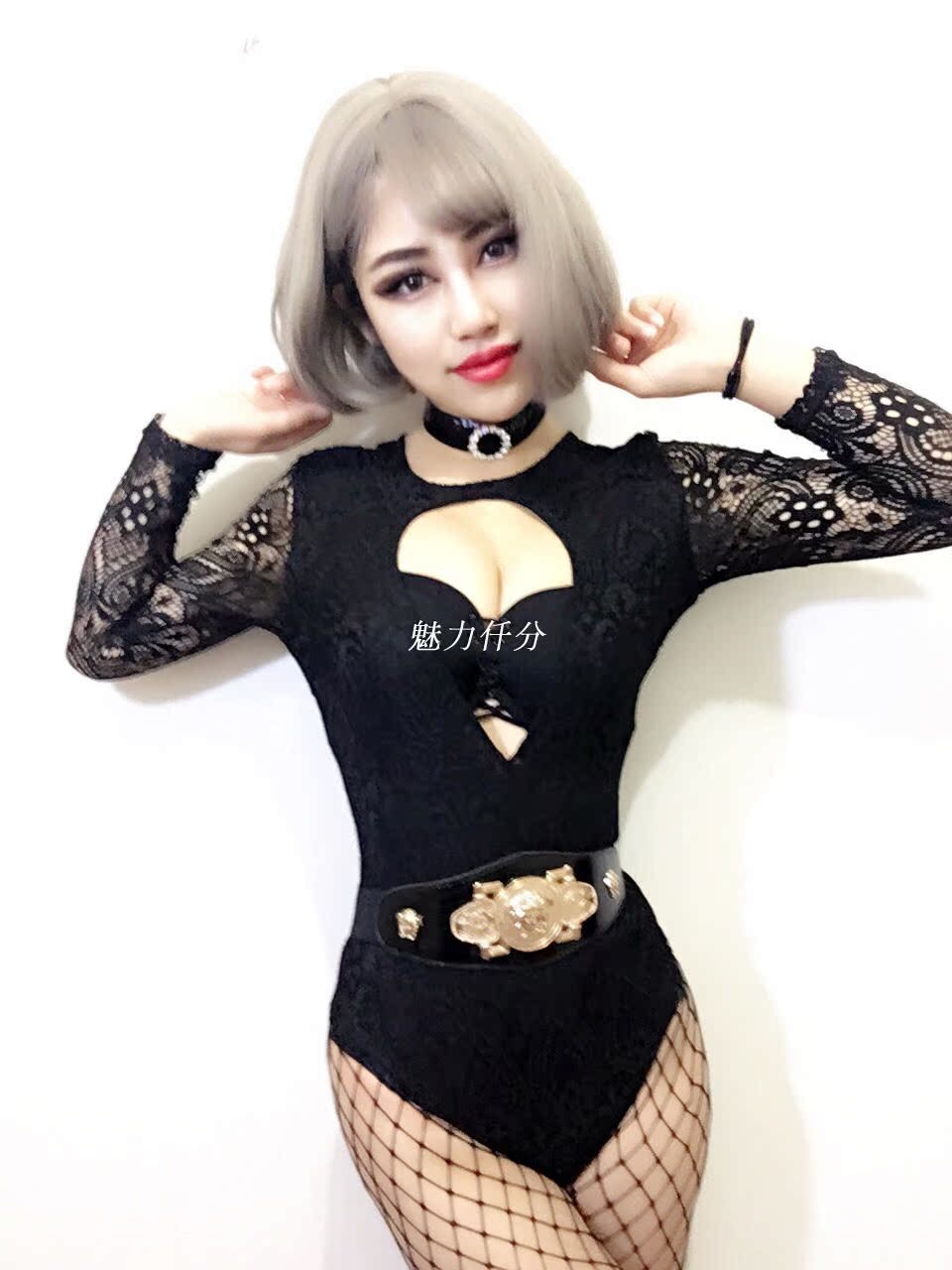 黑色S新品酒吧女歌手DJ舞臺服DS演出服復古性感歐美深v鏤空蕾絲連體褲