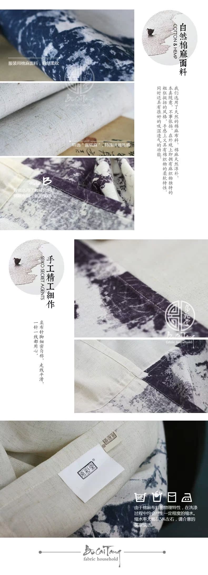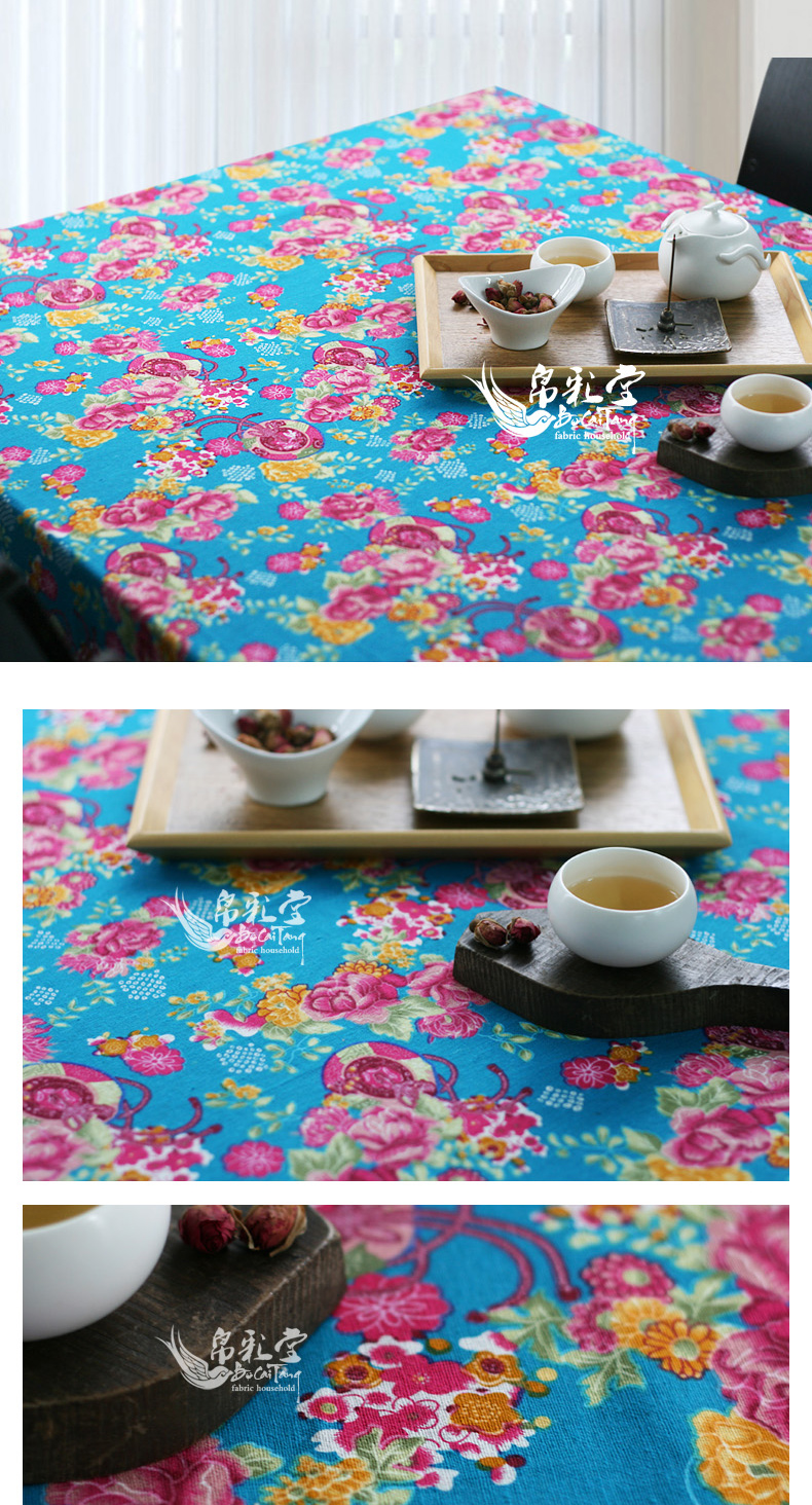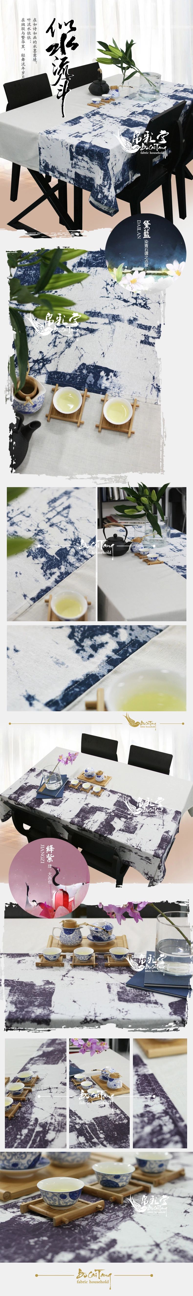 黛藍130*180cm 中式水墨印花棉麻拼布桌布家居餐桌布藝裝飾 似水流年