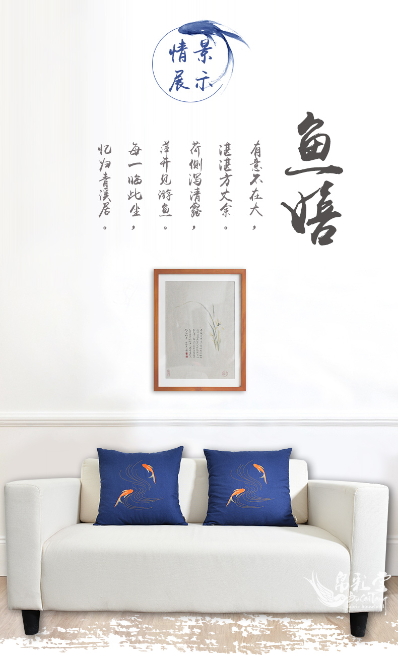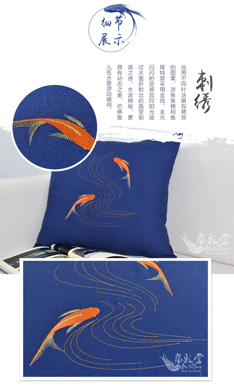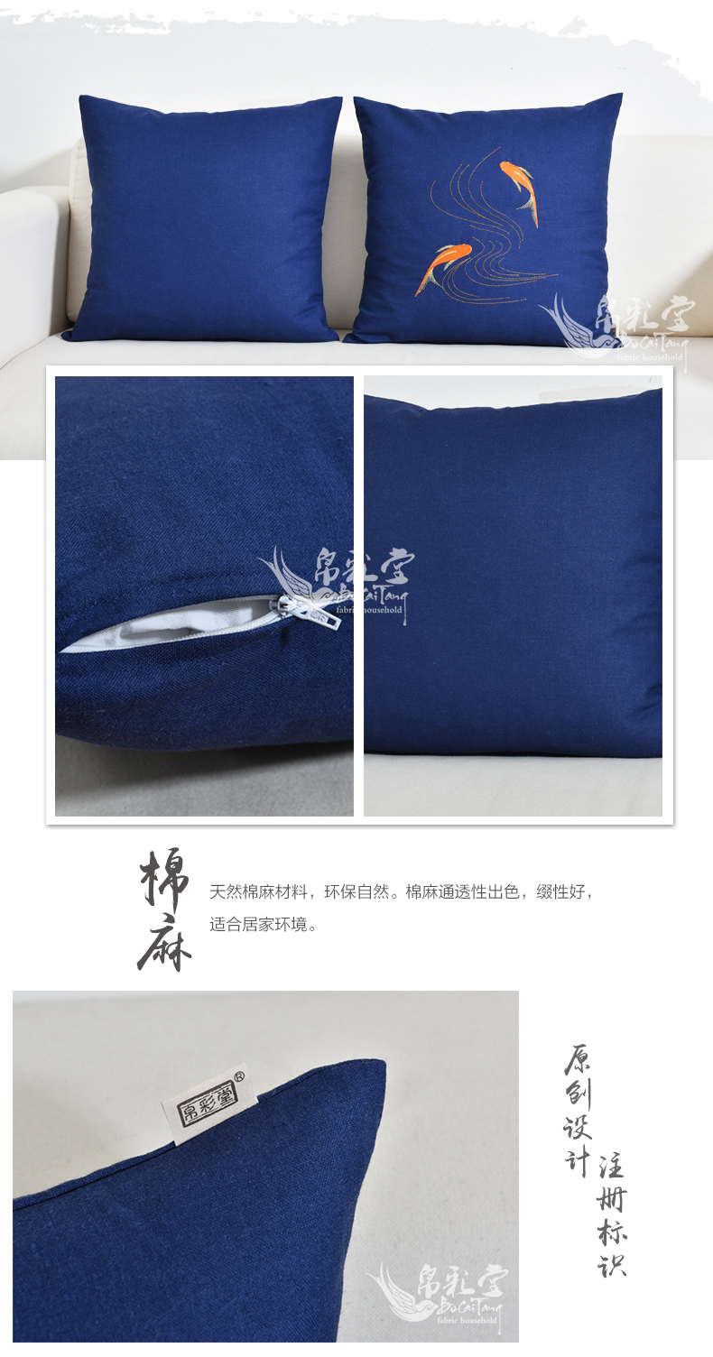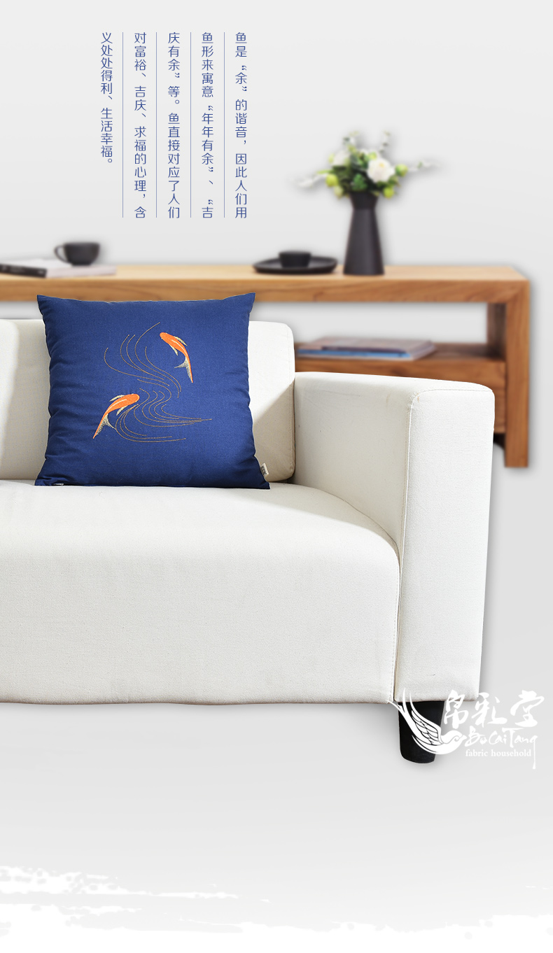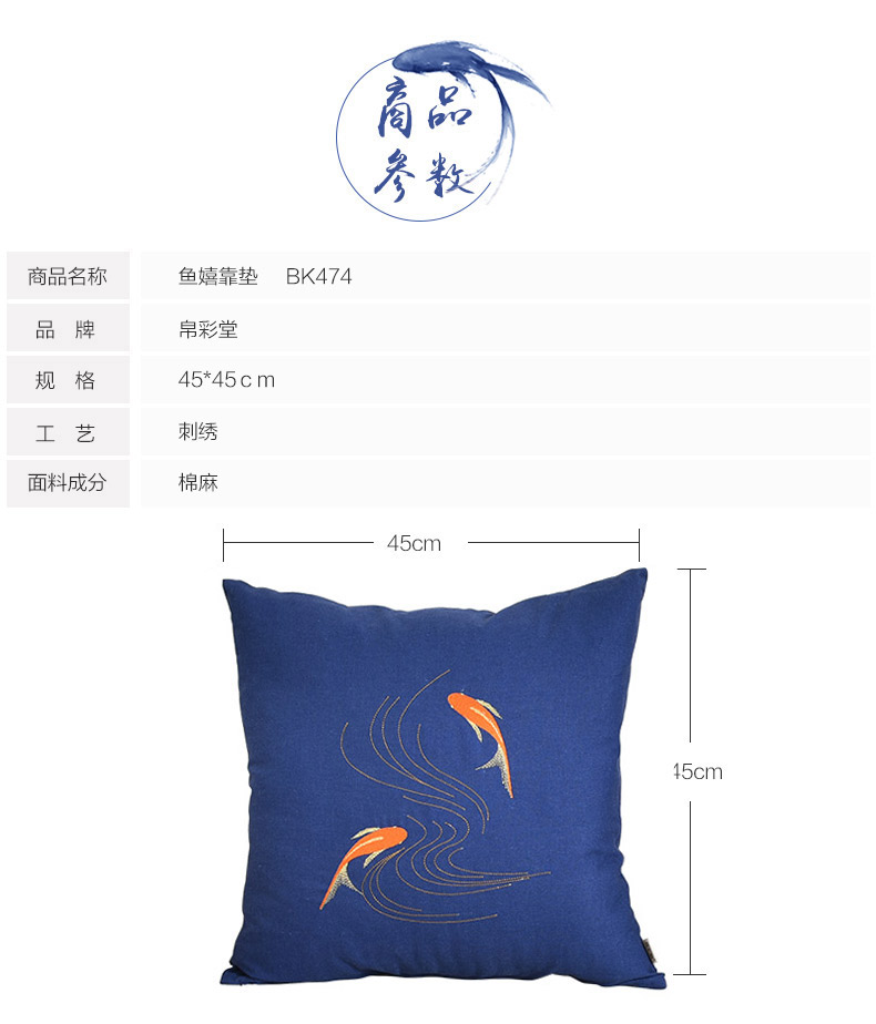 魚嬉45*45cm 含珍珠棉芯帛彩堂高端棉麻靠墊日式抱枕沙發腰枕床頭靠背 辦公室腰靠背 魚嬉