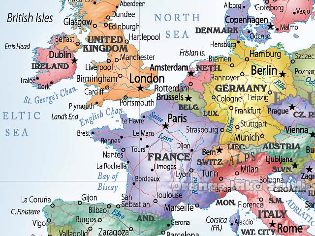 這張以0度為中心的世界地圖繪制得十分精美圖中將色彩斑斕的陸地置入藍色的大海之中,整圖色彩清新亮麗,別具一格圖中繪出了國家、地區的邊界;各國的首都及大城市;時區線;經度和緯度等 |