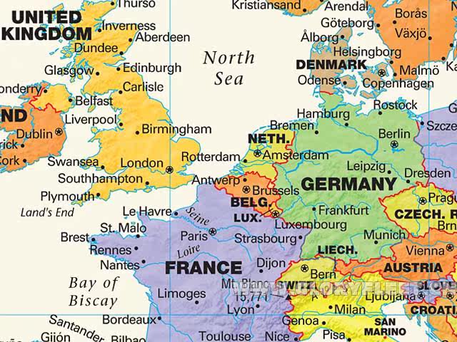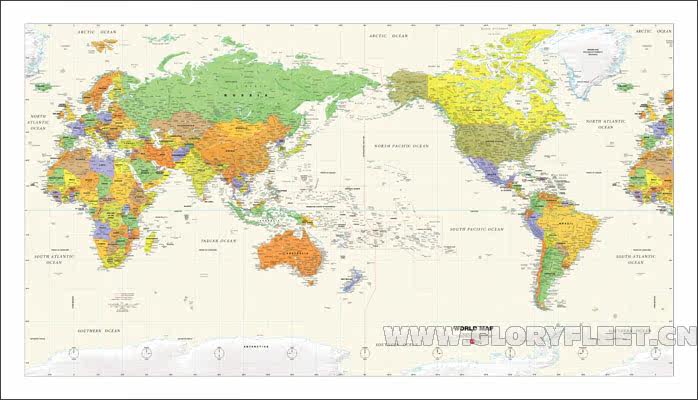 這張以太平洋為中心的世界地圖繪制得十分精美,圖繪于2007年圖中海洋是色的,整圖色彩清新淡雅,為了方便用戶閱讀,圖的右側對大西洋東岸地區進行了重復繪制圖中繪出了國家、地區的邊界;各國的首都及大城市;時區線;物理地形陰影;經度和緯度等 |