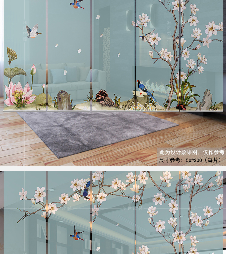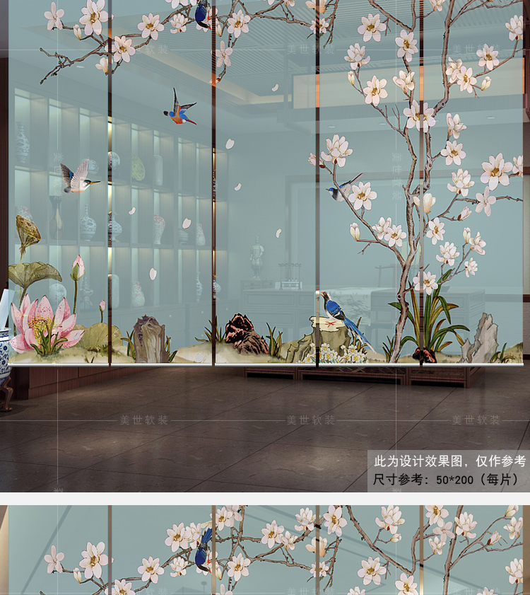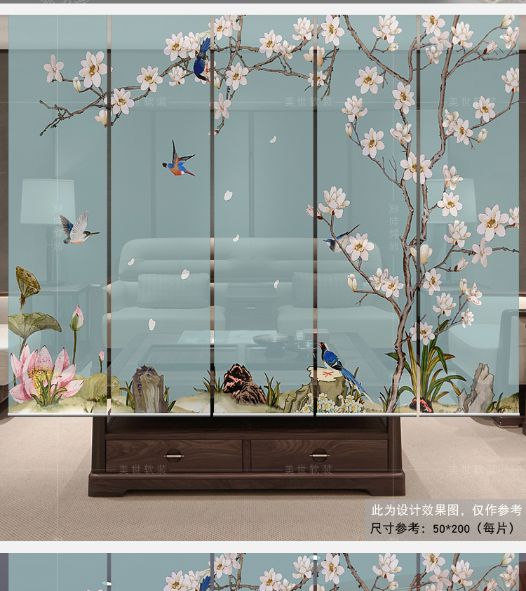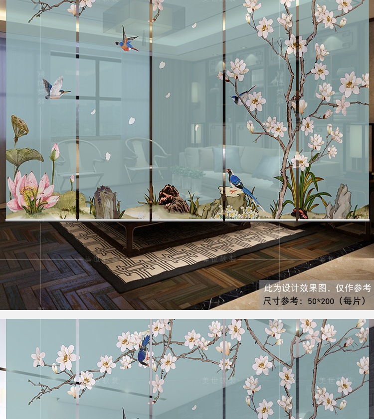 任意尺寸和圖案定制中式掛式屏風隔斷玄關簾軟隔斷時尚客廳玄關掛屏卷簾【鳥鳴花開】