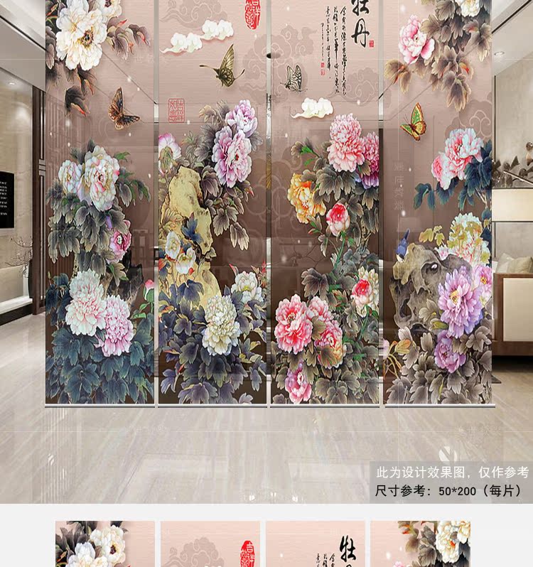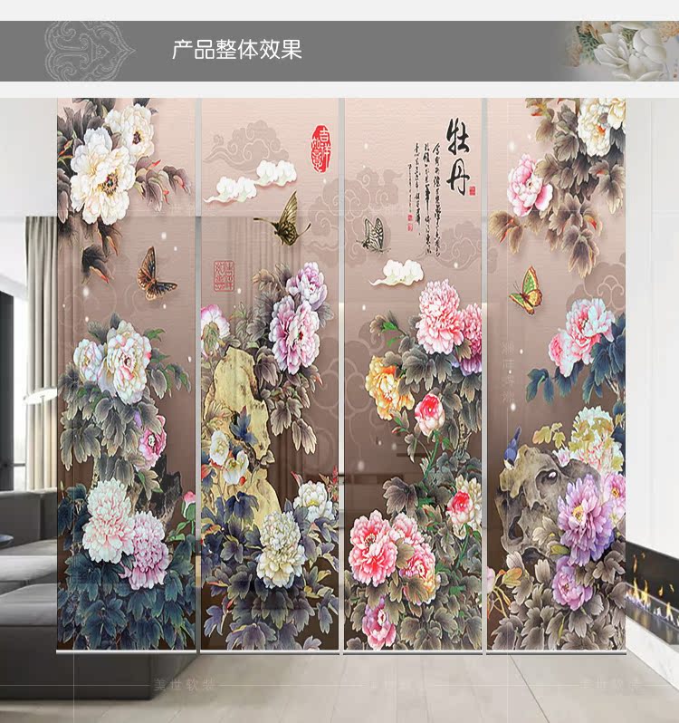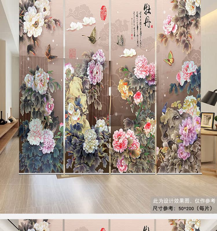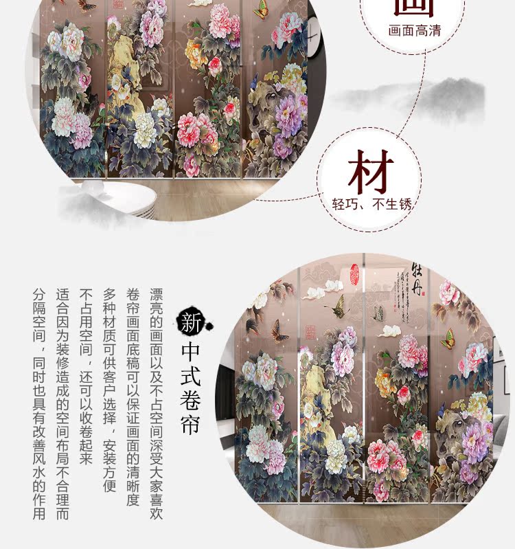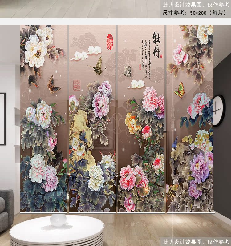 任意尺寸和圖案定制中式掛式屏風隔斷玄關簾軟隔斷時尚客廳玄關掛屏卷簾【牡丹花鳥】