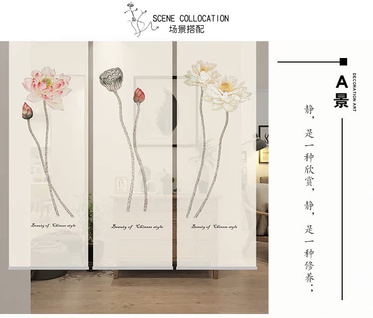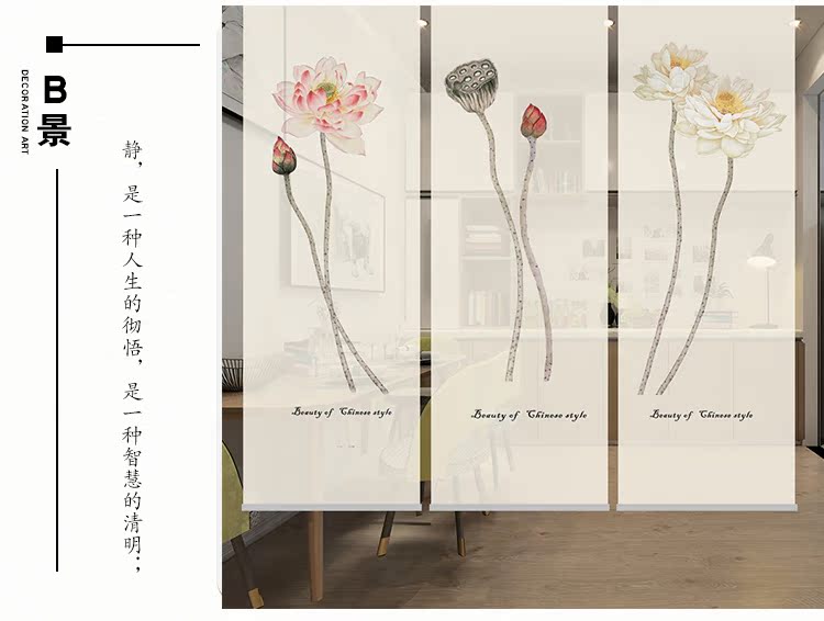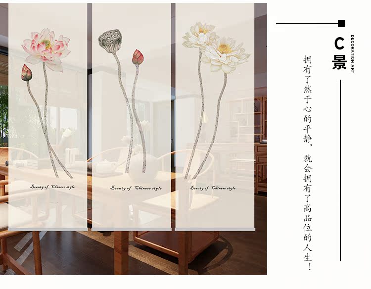 50*200cm每片現代中式門簾掛式屏風卷簾玄關簾軟隔斷客廳掛屏掛簾【簡約荷花】