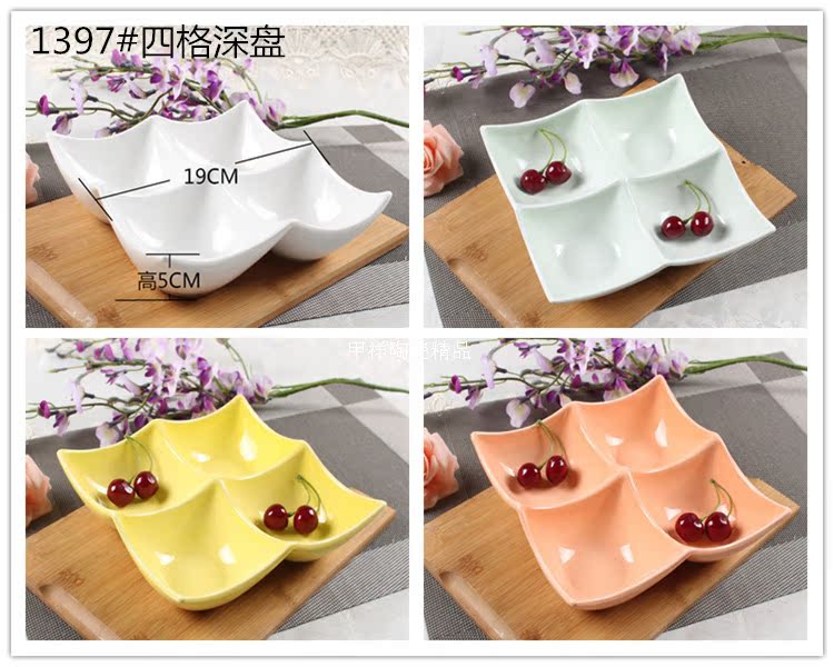 1397四格深盤-黃陶瓷盤子四格盤分格餐盤早餐盤西餐瓷盤蛋糕水果盤沙拉盤