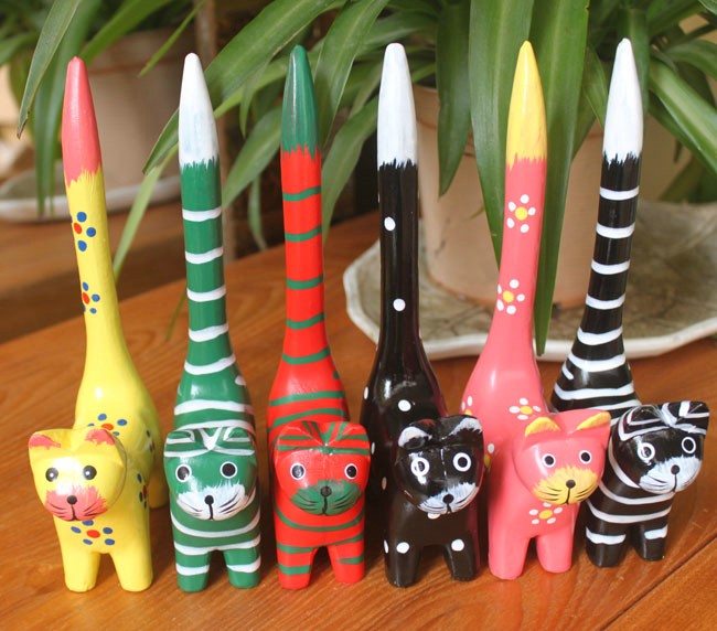 13025#木質 木雕貓工藝品 家居裝飾招財擺件 手工彩繪 大號套六貓