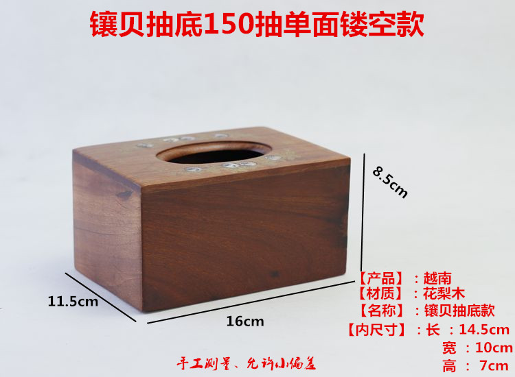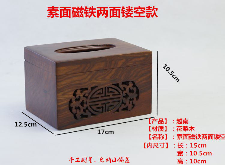 | 本公司大部分商品6一10天到貨不接急單急單的客戶請不要下單感謝諒解與合作! 上越南紙巾盒貨品品質參差不齊選擇健興紅木商行,選擇正品保障 【品名】素面磁鐵180抽兩面鏤空款/鑲貝抽底150抽單面鏤空款 【材質】越南花梨木 【產地】越南 【工藝】膠粘/上漆 【規格】如圖 注:尺寸均為手工測量,允許誤差的存在;由于每塊木頭的密度都各有不同,所以寶貝的重量也都會有略微不同 【適用范圍】此款寶貝放在可工作臺、茶桌、辦公桌、電視柜上,都別有一番雅致,效果很不錯哦! 【購買須知】 1、寶貝可以放150-180抽的短款袋裝紙巾; 2、紙巾盒為越南手工,因此無法與中國手工相媲美,畢竟價格相差甚遠寶貝會存在細微的瑕疵,要求過高、完美主義請繞行; 3、紙巾盒刷有一層油漆,因為剛噴好漆就直接,所以開始會有些油漆的味道用濕抹布里外多擦幾次,堅持3天左右,味道會逐漸的消失,對味道敏感的請慎重考慮 ![]() ![]() ![]() ![]() ![]() ![]() ![]() ![]() ![]() ![]() ![]() ![]() |