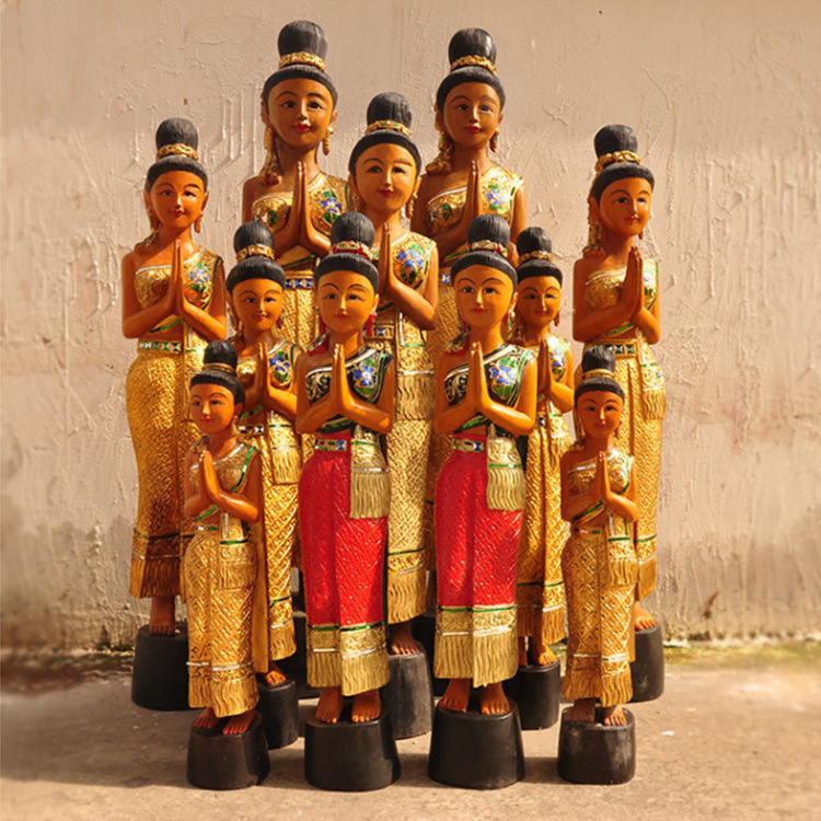 100cm金色裙子東南亞實木雕刻站佛迎賓侍女擺件 SPA餐廳大堂玄關招財裝飾擺設