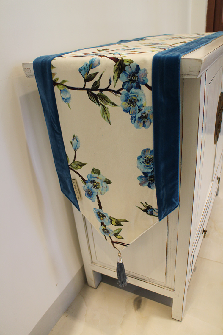 藍色30*240cm新品 中式餐桌桌布 民族玄關擺設茶幾桌旗臺布 花卉布藝飾品