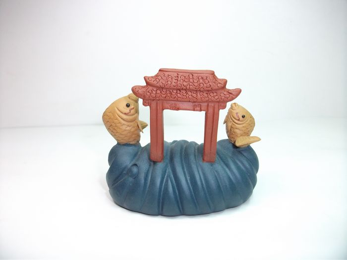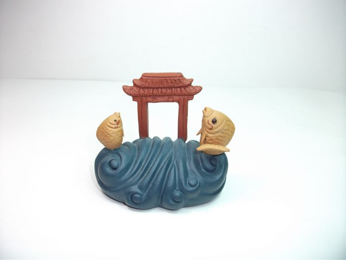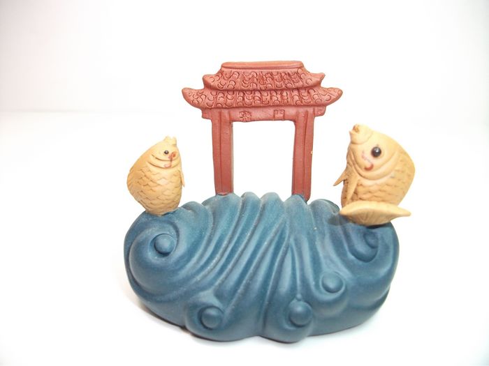 將茶寵放在水中浸泡,等茶寵喝飽了水。拿出后用熱水澆上,會有兩根細水柱分別從兩只鯉魚口中噴射而出。