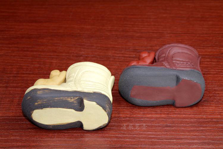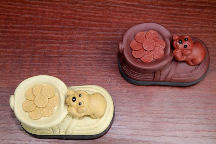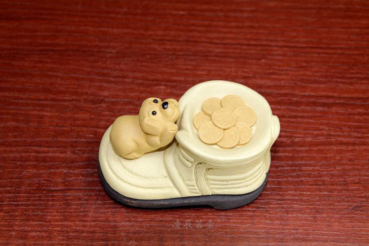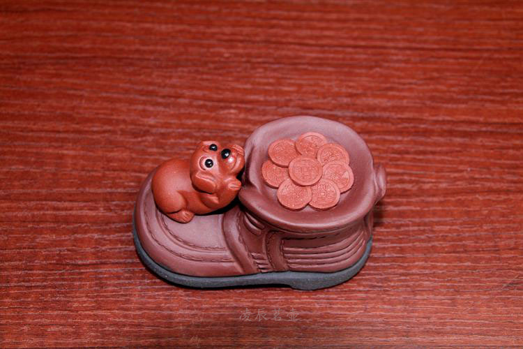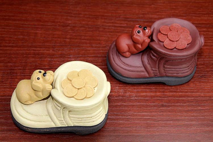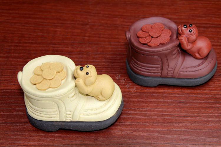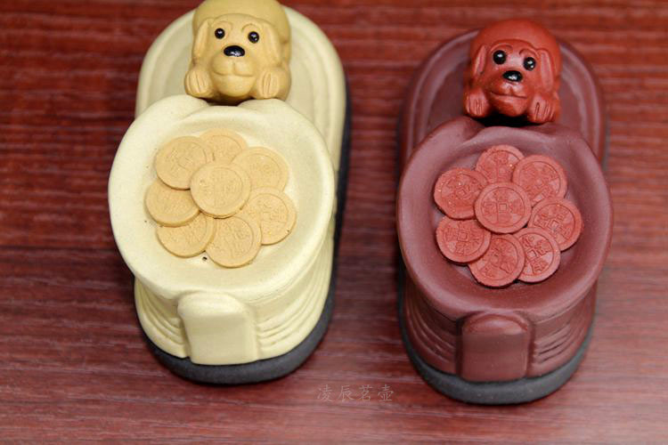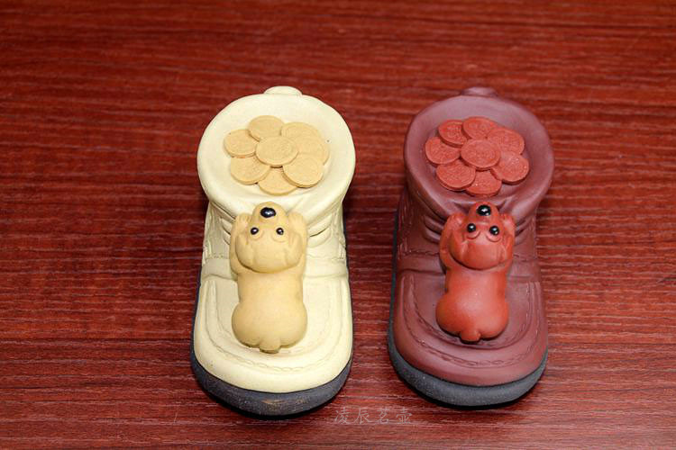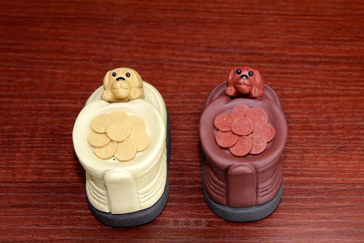 紅小狗皮靴紫砂小狗旺財皮鞋 發財靴子招財進寶小銅錢 宜興茶寵茶玩雕塑擺件