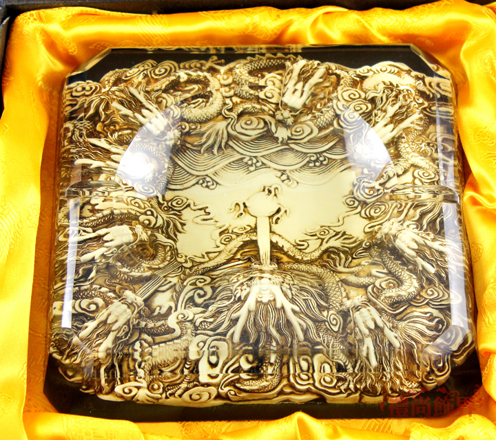 此煙灰缸是以中國人最喜愛的傳統“龍”為題材設計的,九條龍絞纏煙云之中,每條龍騰云駕霧被雕刻的栩栩如生。中國古代把數字分為陽數和陰數,奇數為陽,偶數為陰。“九”在陽數奇數中最 大,有最尊貴之意,又與“久” 諧音,所以自古為人們所喜愛。相傳以蛇為圖騰的黃河流域的華夏族戰勝了其他氏族,后來華夏族又聯合了其他氏族,組成了巨大的氏族部落聯盟,同時吸收了其他氏族 的圖騰,組合成了共同的崇拜圖騰“龍圖騰”。龍是一種只存在 于圖騰中而不存在于生物界的虛幻生物。它的形象綜合了各種生物的特征,經過深圳數朝代的演變,把各種本領以及美德和優秀的品質都 集中充實到龍的形象中去,使其成為中國文化的一個重要象征,代表著一種尊嚴,一種智能,一 種活力。