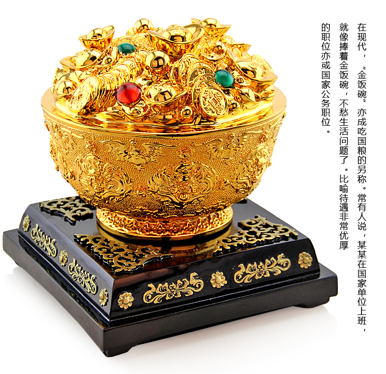 金飯碗:古時指皇帝吃飯的碗,民間傳言,能得金飯碗,一生衣食無憂。在現代,"金飯碗"則指待遇優厚的職位,亦成吃國糧的另稱,得此"金飯碗",便意味著從此前程似錦、豐衣足食、生活美好。衣食無憂是人們 實現美好生活的基礎,而碗作為盛放食物最常用的器具,也逐漸的被人們賦予了 "聚寶盆"的光環甚至成為判斷生活是否富足的標志。當今社會,人們用"鐵飯碗"、"金飯碗"來比喻職位的高低,而"金飯碗"顧名思義, 就是待遇非常優厚的職位,有了這個"金飯碗"便可過上衣食無憂的美好生活。 "金飯碗"代表了前途光明、能帶來錦衣玉食的好職業。