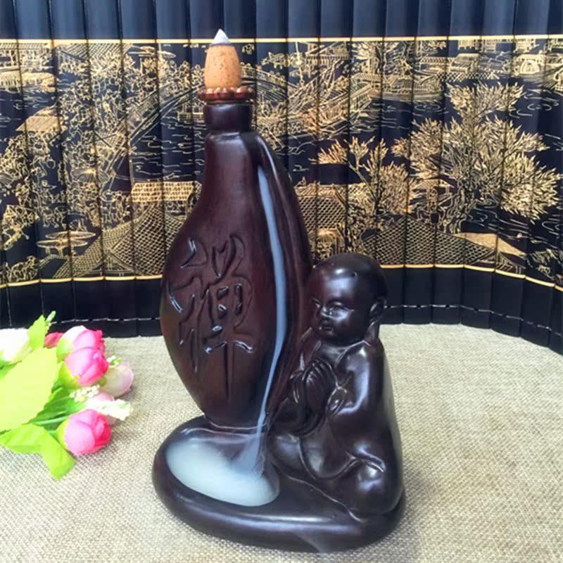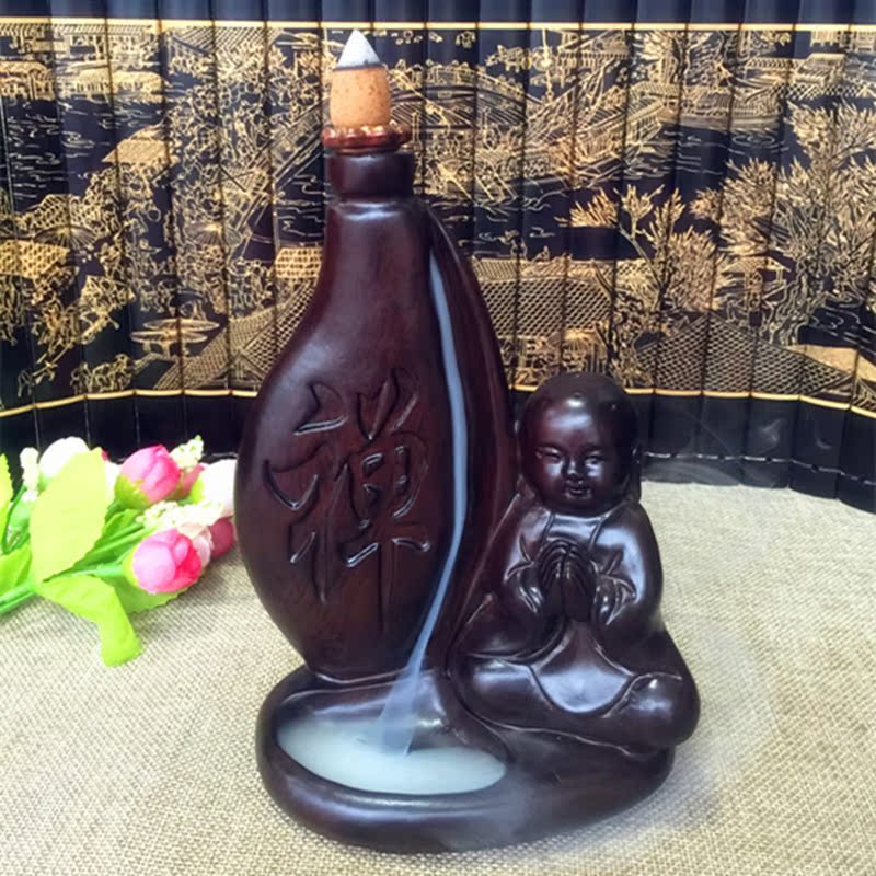 11*7*18cm(配送熏香)黑檀小和尚參禪倒流香爐紅木質香薰爐工藝禮品倒流香爐實木雕擺件