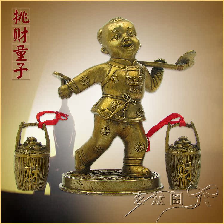 高約13CM純銅挑財童子像招財工藝品擺件居家裝飾品擺設水桶寶